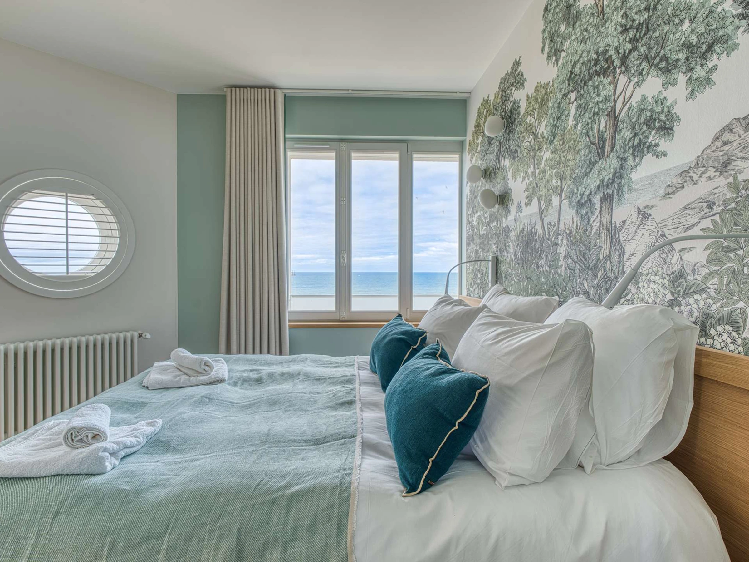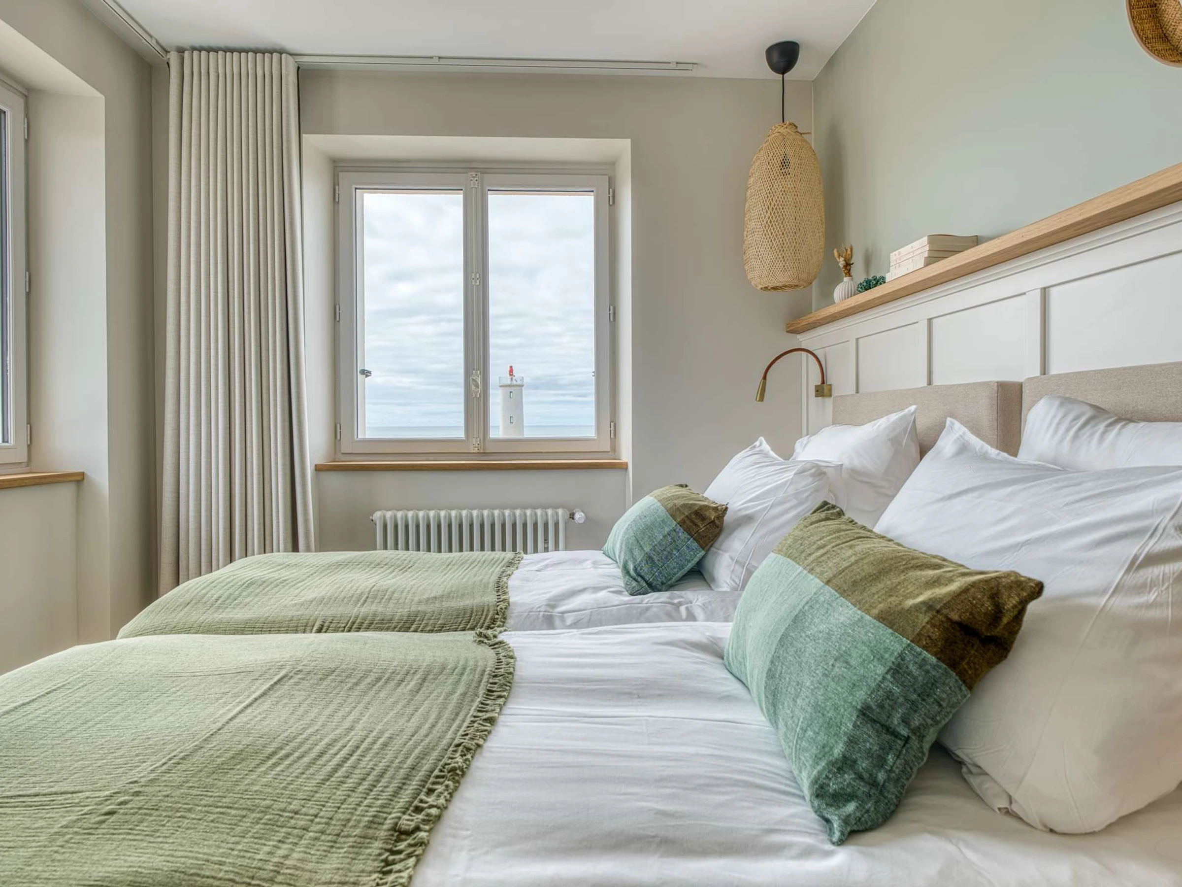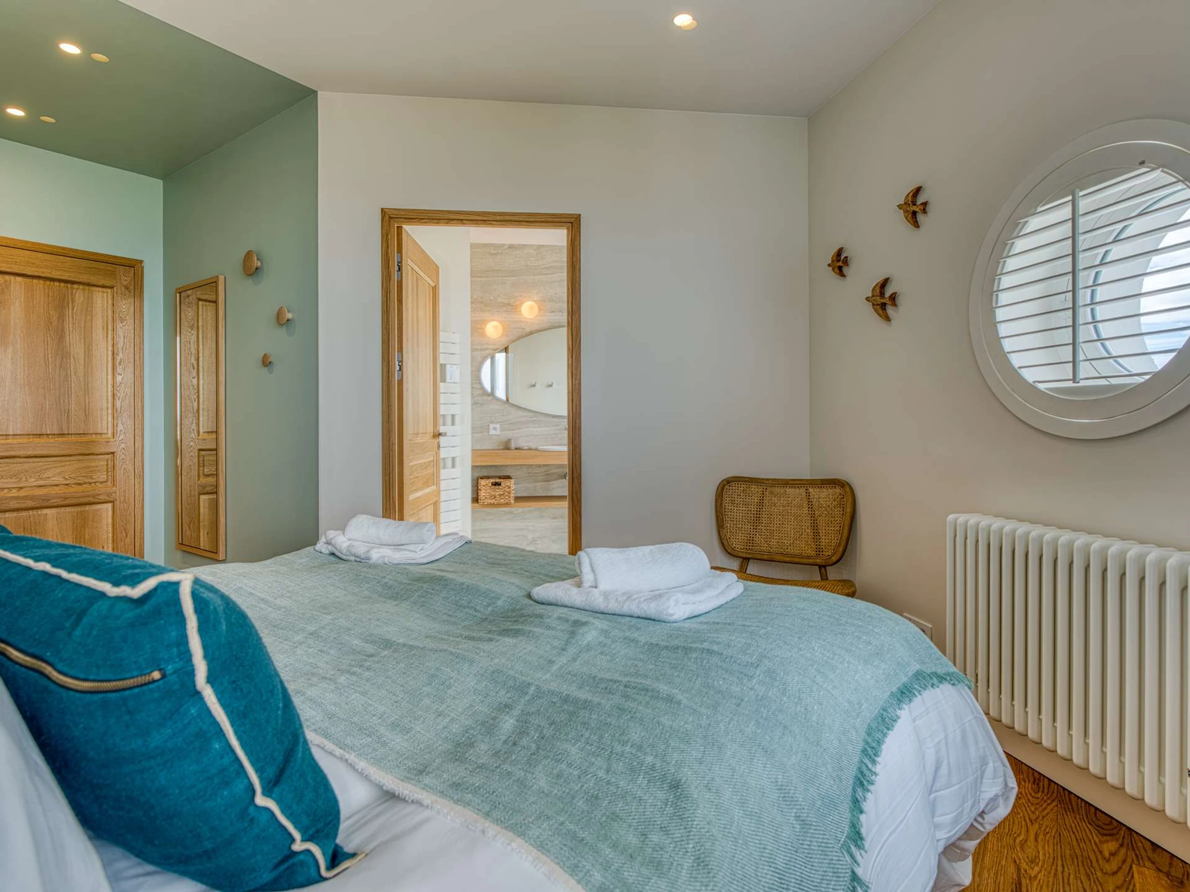 Au 2ème étage, l’espace nuit comprend 4 chambres spacieuses, chacune décorée avec soin et bénéficiant d'une vue mer différente mais toujours spectaculaire. 2 chambres principales disposent d’un grand lit double 160 avec une salle d’eau privative. Les deux autres chambres sont modulables : elles peuvent être aménagées soit avec deux lits simples de 90 soit en un grand lit double 180 selon vos besoins. Elles se partagent une salle d’eau. Un espace lecture a aussi été aménagé sur le palier.