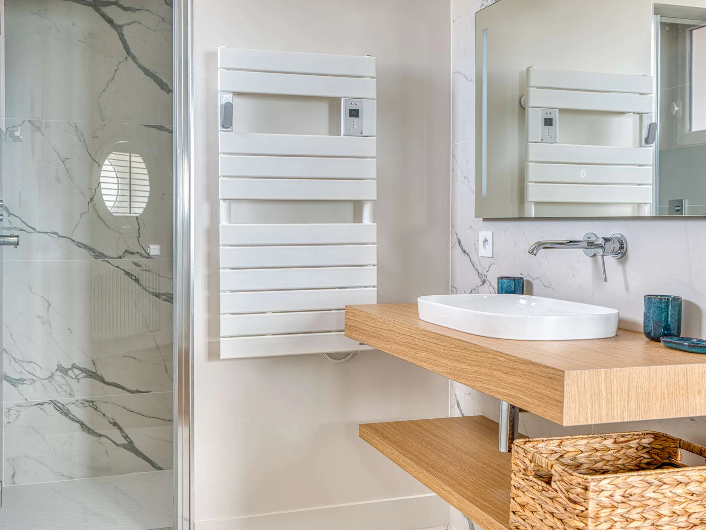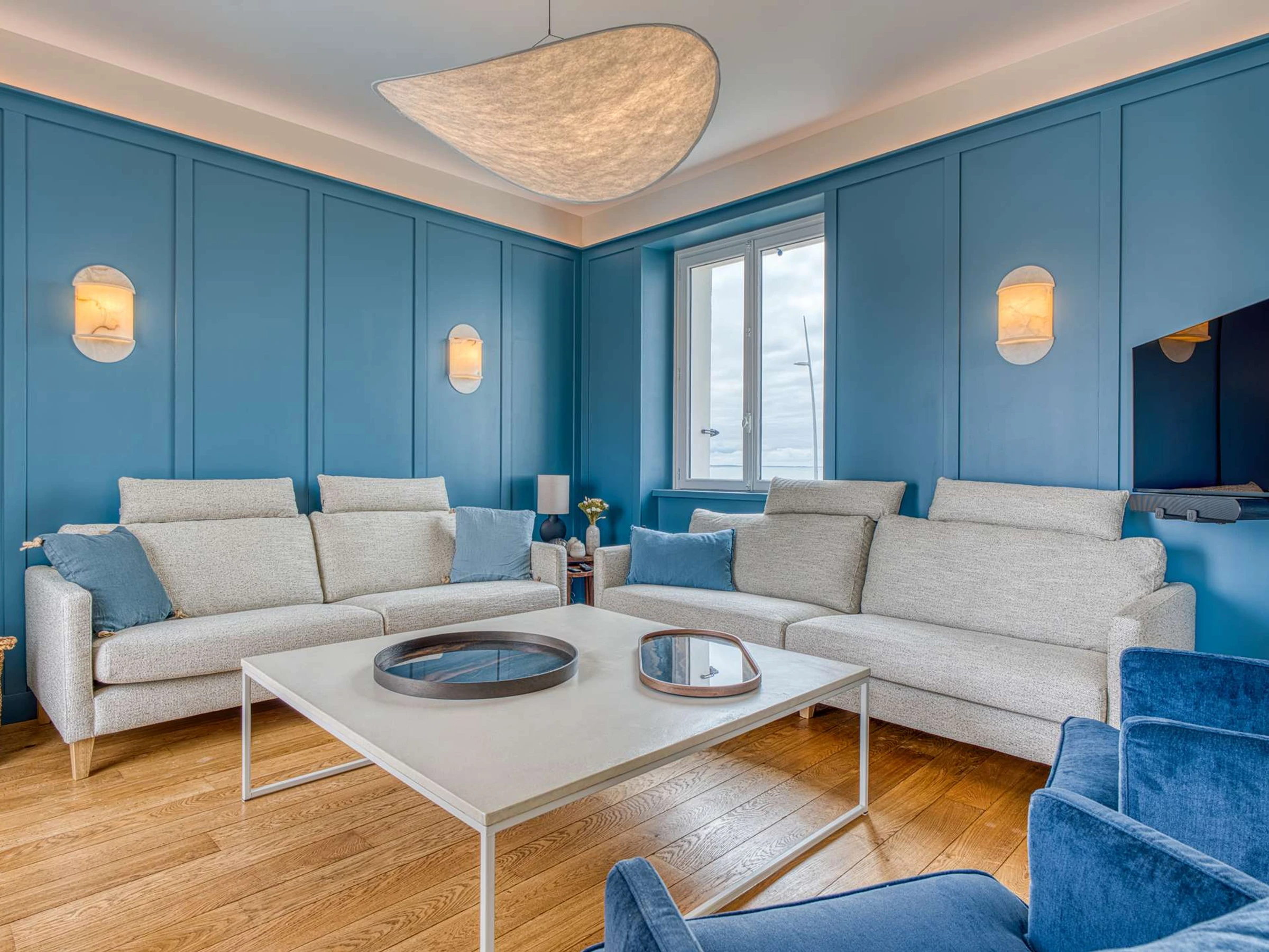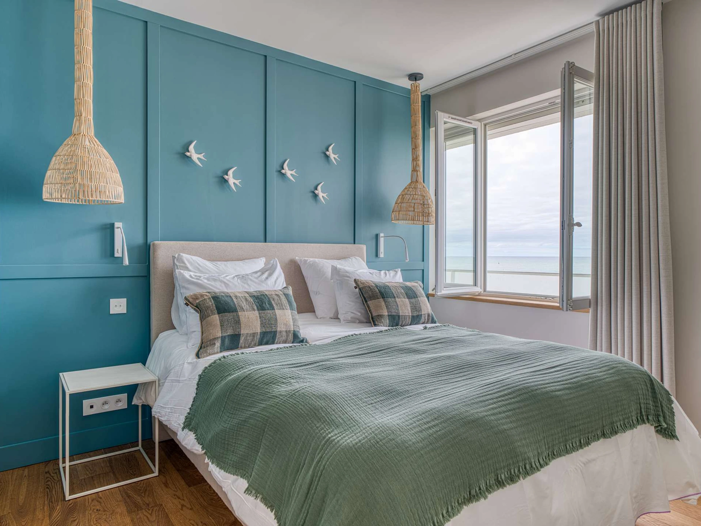Au 2ème étage, l’espace nuit comprend 4 chambres spacieuses, chacune décorée avec soin et bénéficiant d'une vue mer différente mais toujours spectaculaire. 2 chambres principales disposent d’un grand lit double 160 avec une salle d’eau privative. Les deux autres chambres sont modulables : elles peuvent être aménagées soit avec deux lits simples de 90 soit en un grand lit double 180 selon vos besoins. Elles se partagent une salle d’eau. Un espace lecture a aussi été aménagé sur le palier.