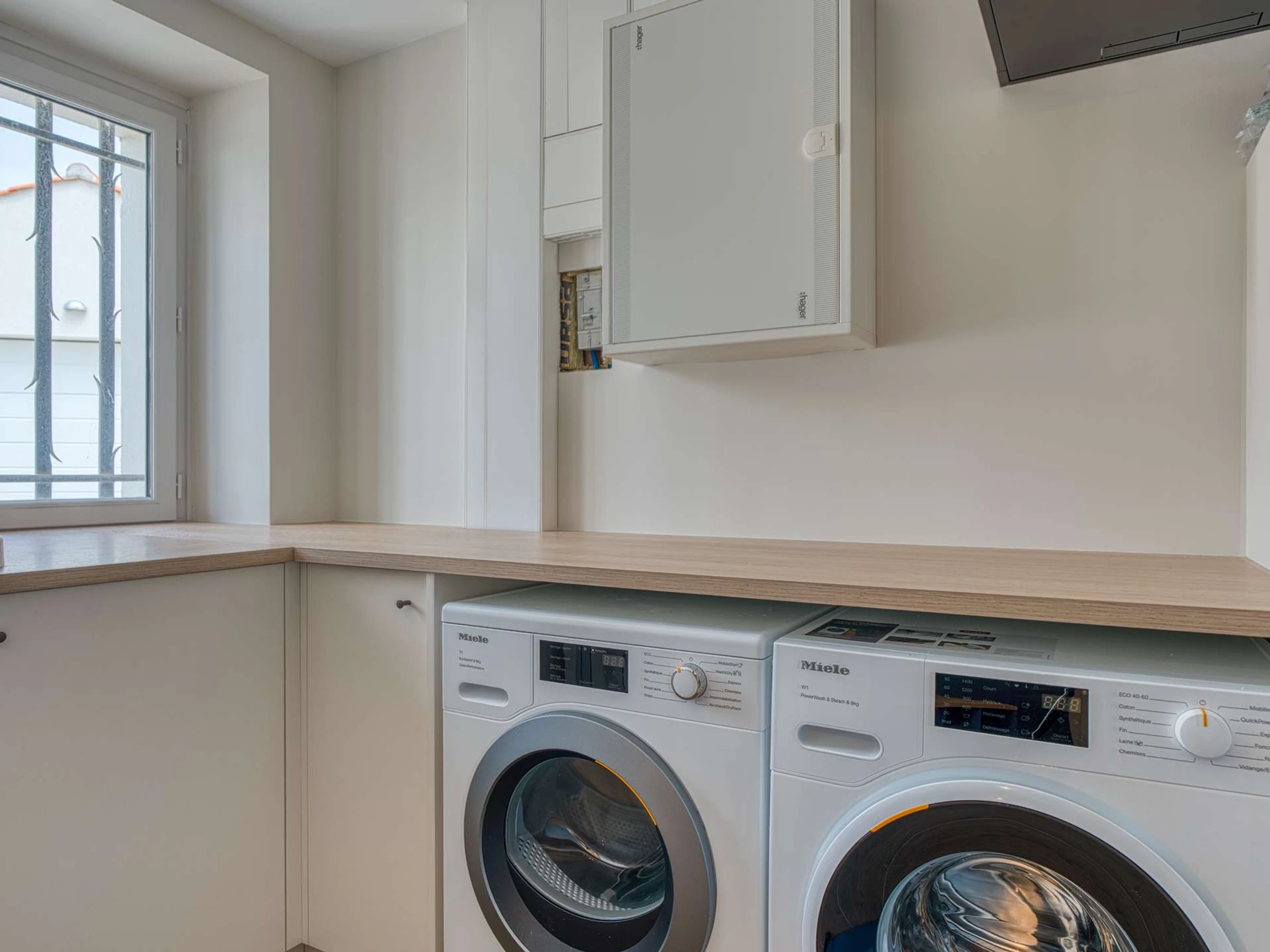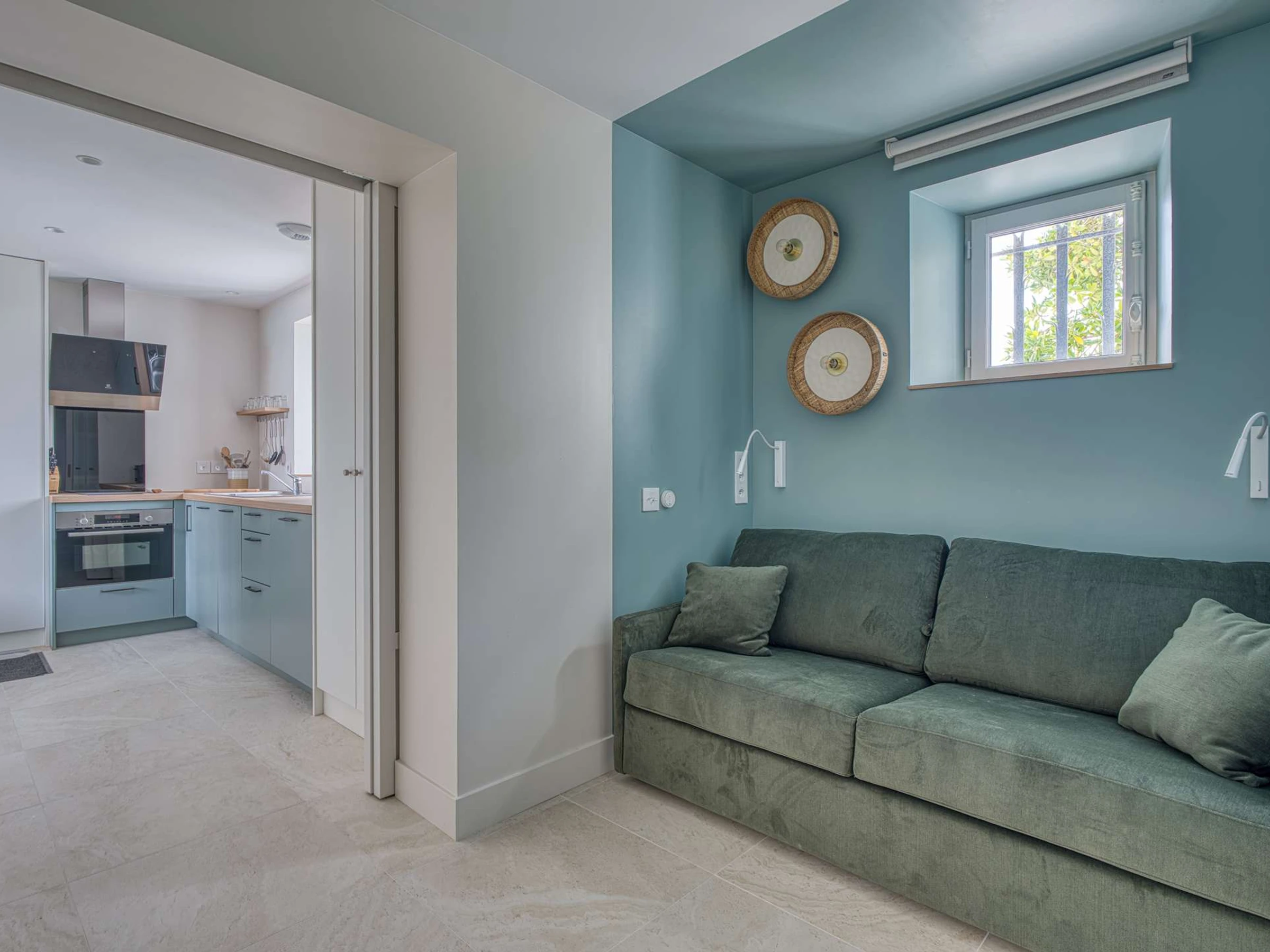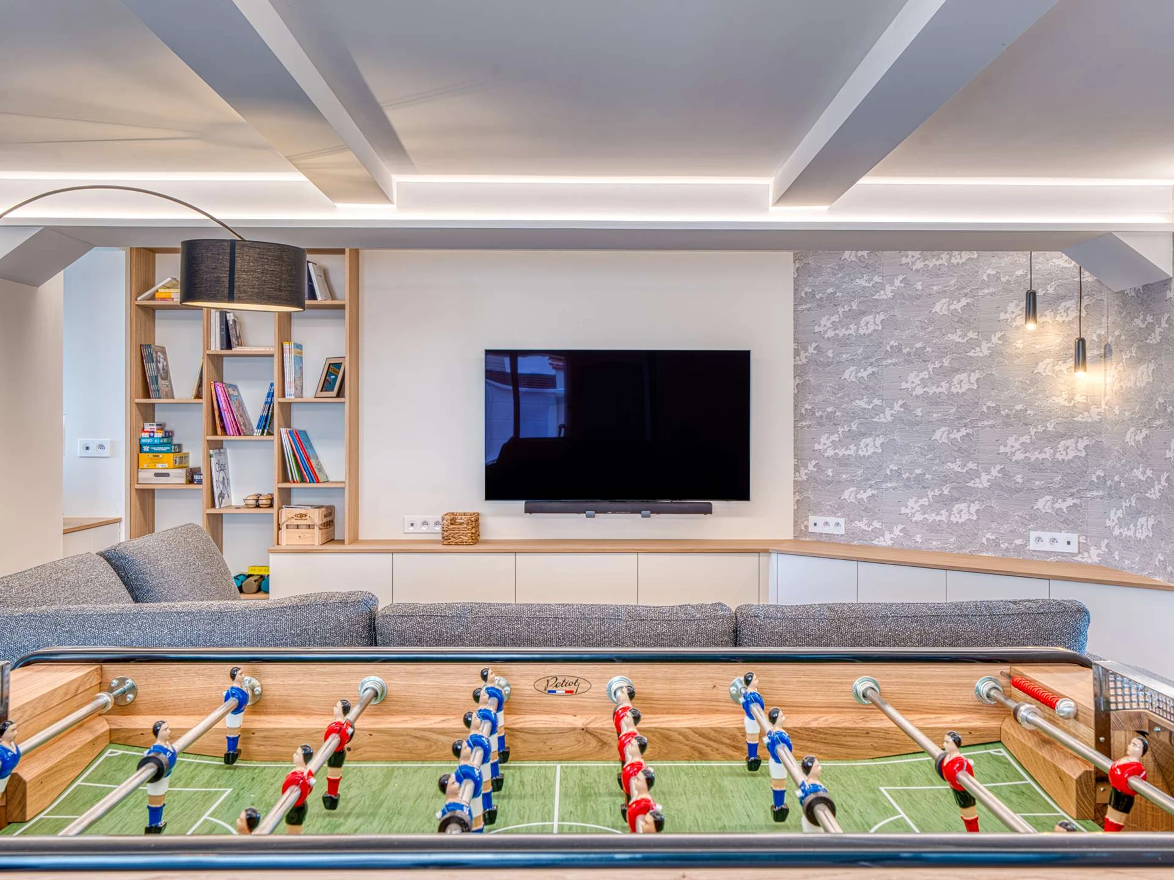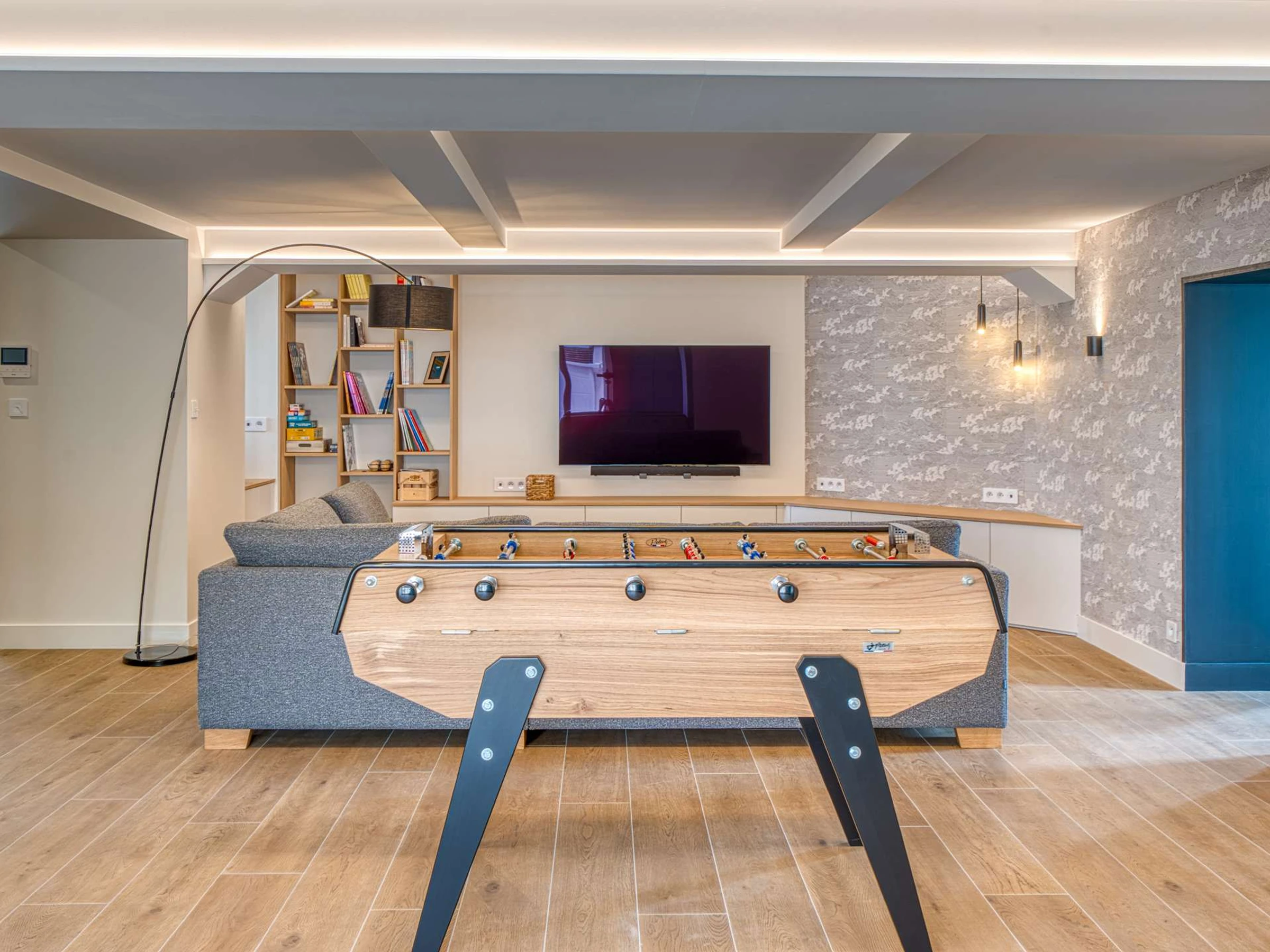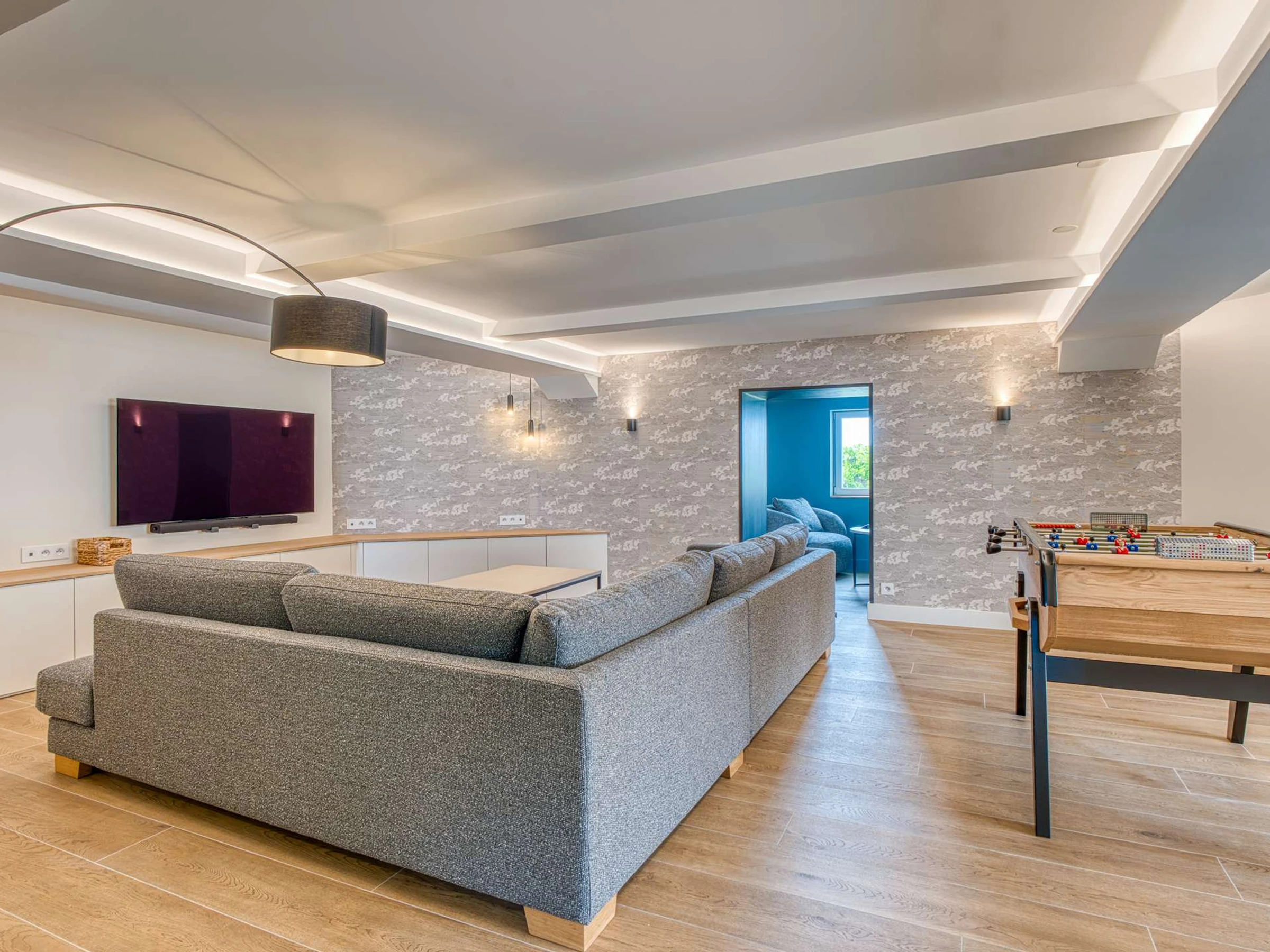 Au rez de chaussée, vous serez accueillis dans une grande salle de jeux qui a été aménagée pour petits et grands : vous y trouverez une bibliothèque bien garnie, des jeux de société, un coin télé avec un canapé confortable et un grand dressing. Cet espace convivial est parfait pour se détendre en famille ou occuper les enfants lors des journées plus fraîches. Un salon plus intime se niche à l’écart, avec un canapé moelleux et un fauteuil cosy, parfait pour un moment de calme, de lecture ou une partie d’échecs. Une buanderie est également à votre disposition, avec un lave-linge et un sèche-linge. De l’autre côté, vous bénéficiez d’un studio, idéal pour un couple, des adolescents ou une nounou. Il comprend un canapé convertible confortable, une télévision, une kitchenette avec des plaques de cuisson, un mini-réfrigérateur, un dressing ainsi qu’une salle d’eau avec douche et WC. Ce studio permet une totale autonomie tout en restant intégré à la maison.
