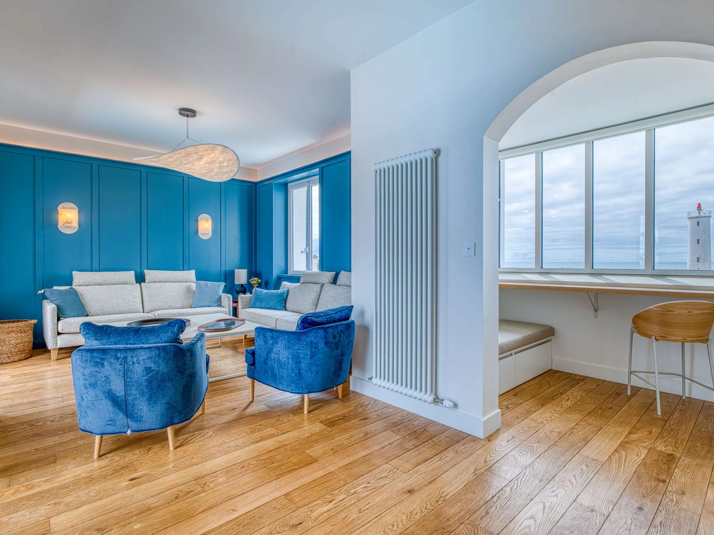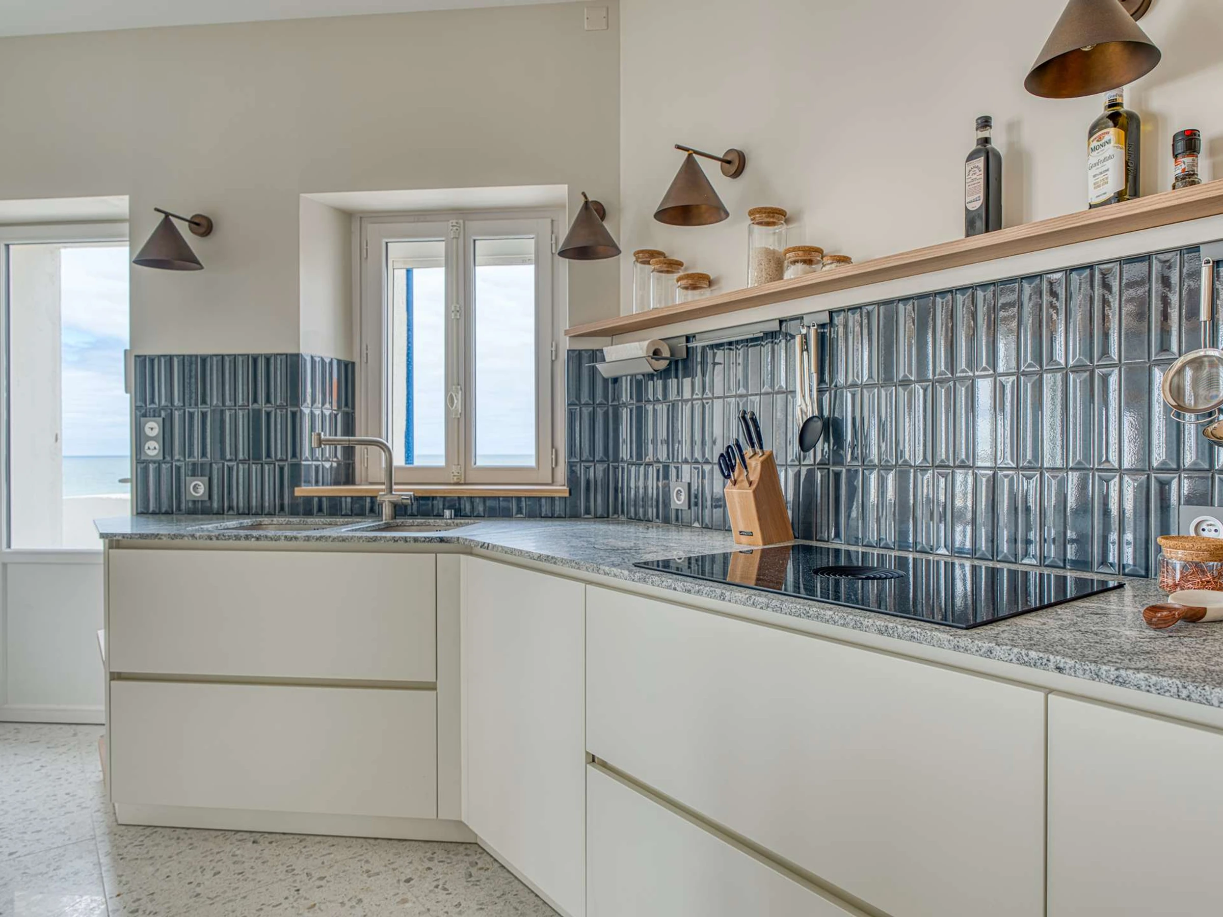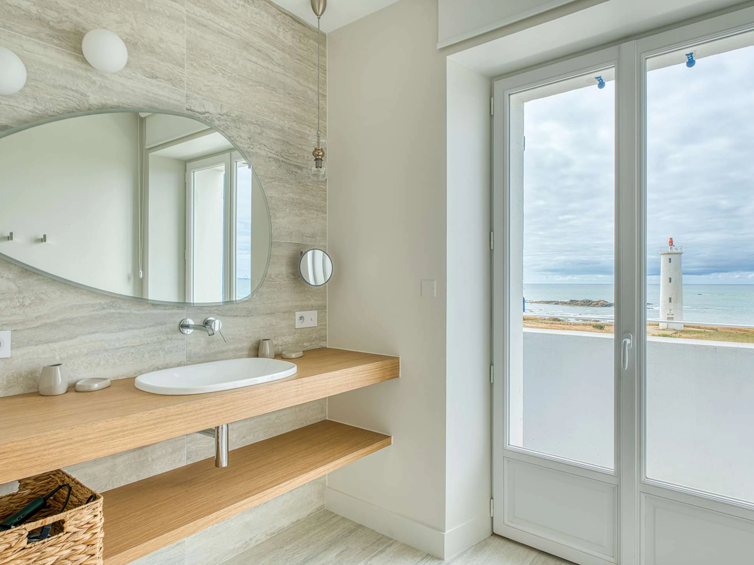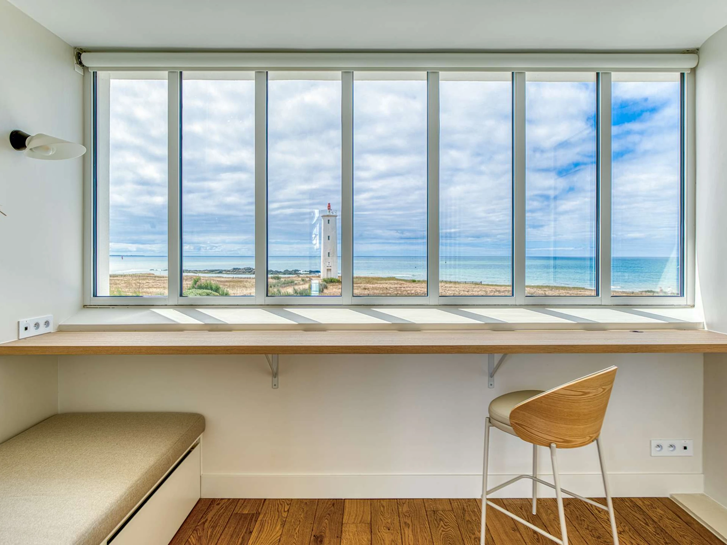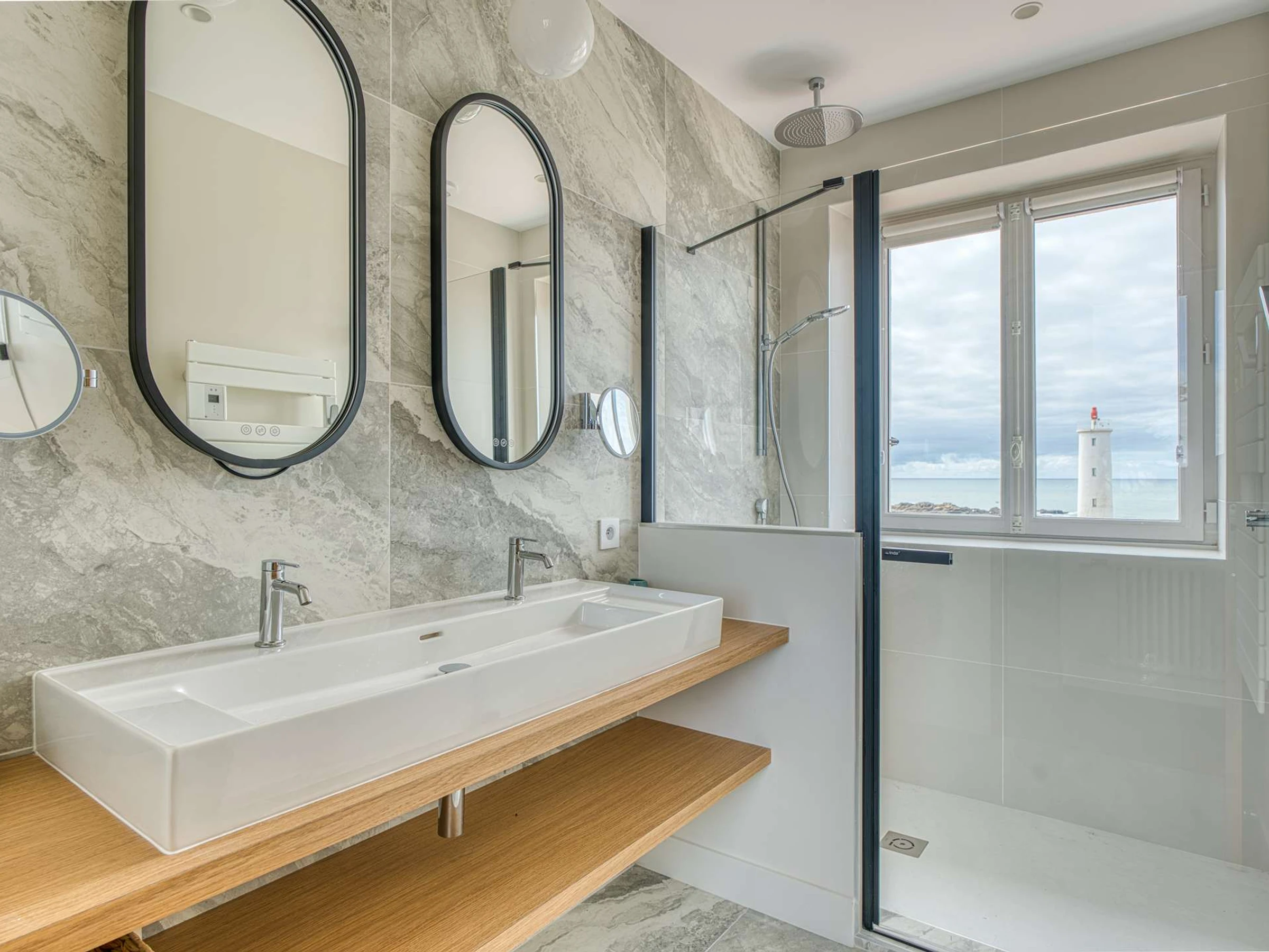 Au 1er étage, le cœur de la maison s’ouvre sur une pièce de vie baignée de lumière, avec une vue panoramique sur l’océan et le phare de « Grosse Terre ». La salle à manger, élégamment aménagée, vous permet de prendre vos repas face à la mer, autour d'une grande table conviviale. Un petit coin détente avec des canapés et fauteuils confortables invites à la détente, bercé par le va-et-vient des bateaux. La cuisine ouverte est entièrement équipée : réfrigérateur américain avec distributeur de glaçons, une petite cave à vin, un lave-vaisselle ou encore un robot ‘Magimix’ parfait pour des moments de cuisine inoubliables. Un salon indépendant vous permet de vous isoler ou de lire un livre en toute quiétude. Il s’ouvre directement sur un balcon-terrasse donnant accès à l’extérieur. Le véritable atout de cet étage reste la verrière en front de mer, pensée comme un espace bureau ou un coin lecture. Calme, lumineux, et ouvert sur l’horizon, ce lieu est parfait pour télétravailler ou se poser face à la mer.