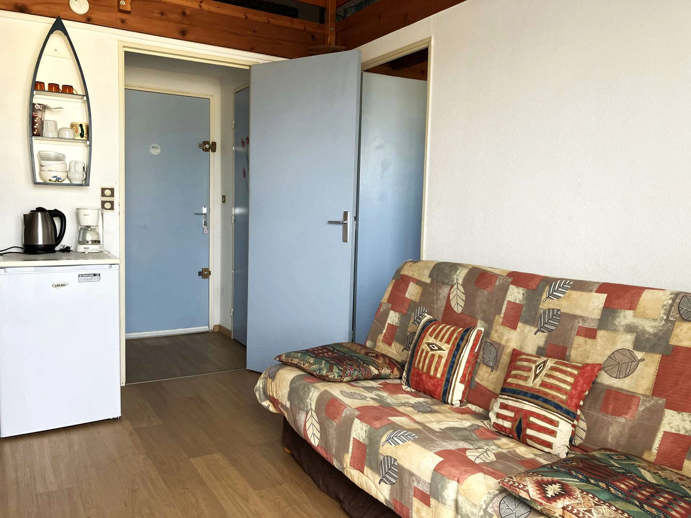 Il comprend une entrée avec placard et WC, une chambre indépendante avec un lit double 140, une pièce à vivre avec son coin repas et sa kitchenette. Un escalier mène à une mezzanine ouverte, offrant un second lit double, ainsi qu’un espace douche avec lavabo. Une salle d’eau dotée d’un WC sanibroyeur, complète le logement. Le balcon exposé ouest propose une agréable vue latérale sur la mer, parfaite pour admirer les couchers de soleil.