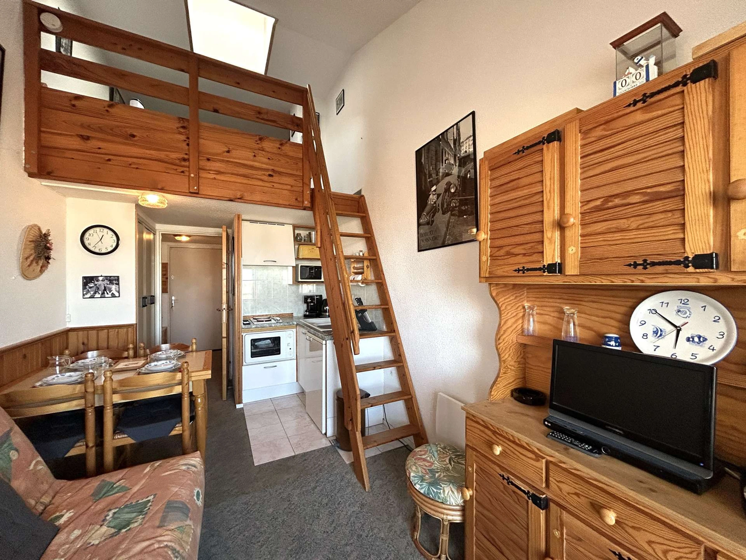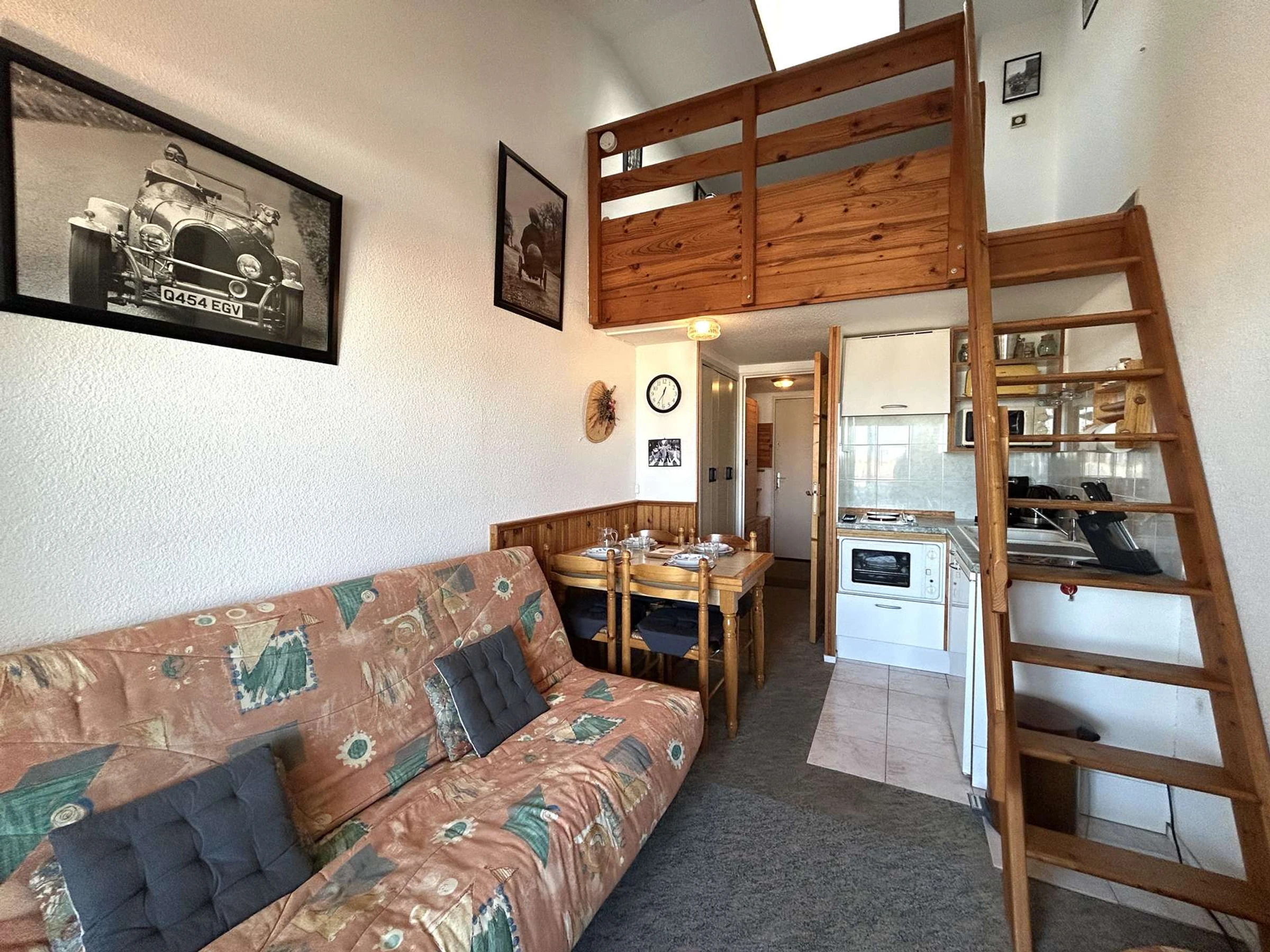 Cette location de vacances se situe à environ 200 m de la plage et 1Km700 du centre de la station. Au 2ème étage avec balcon et salon de jardin, elle se compose d' une entrée, un coin-cuisine équipé micro-onde, four, un séjour avec canapé convertible 2 personnes et télévision, une mezzanine avec un lit double et un lit simple, salle de bains avec wc et lave-linge, un garage privatif.