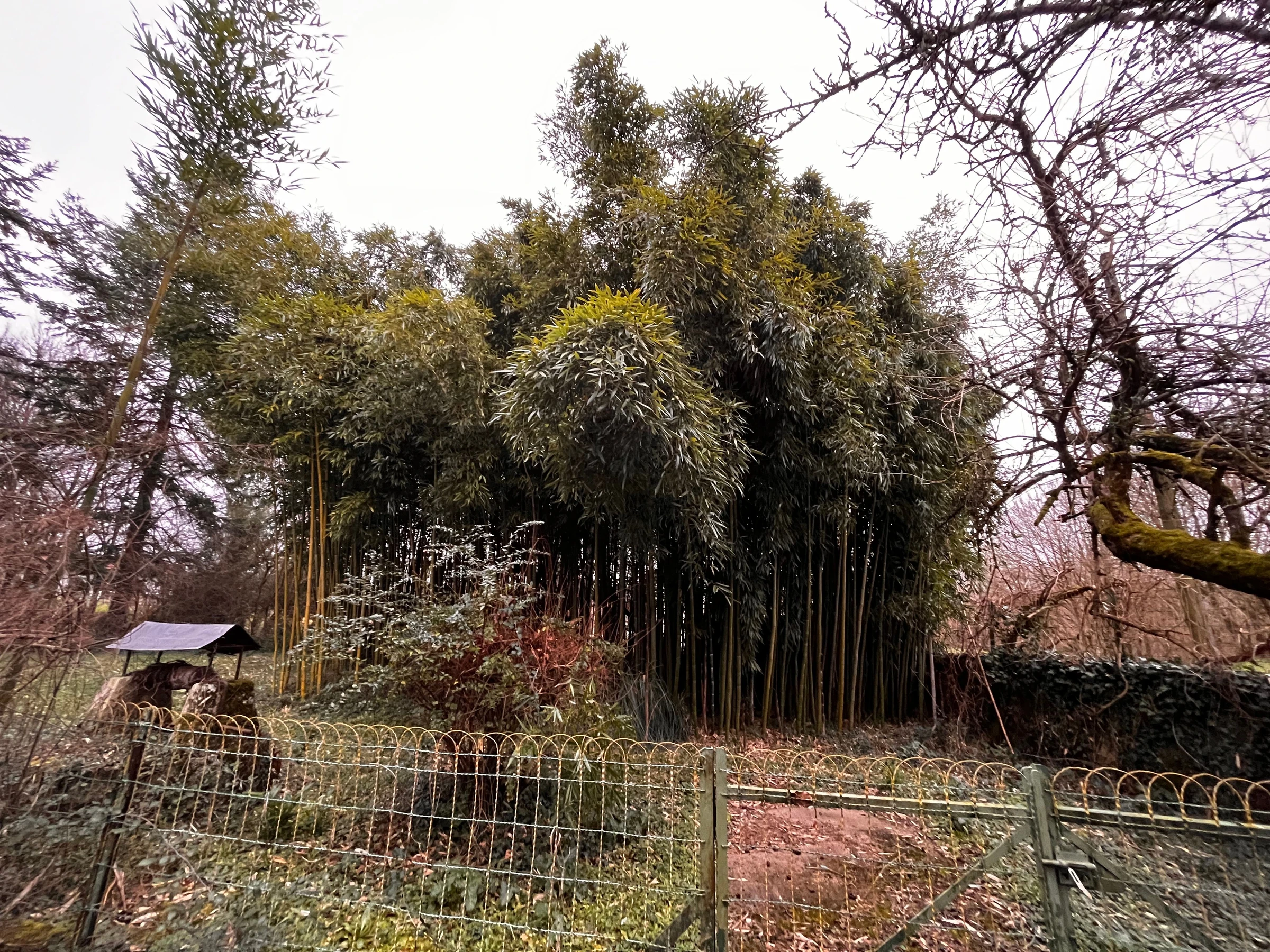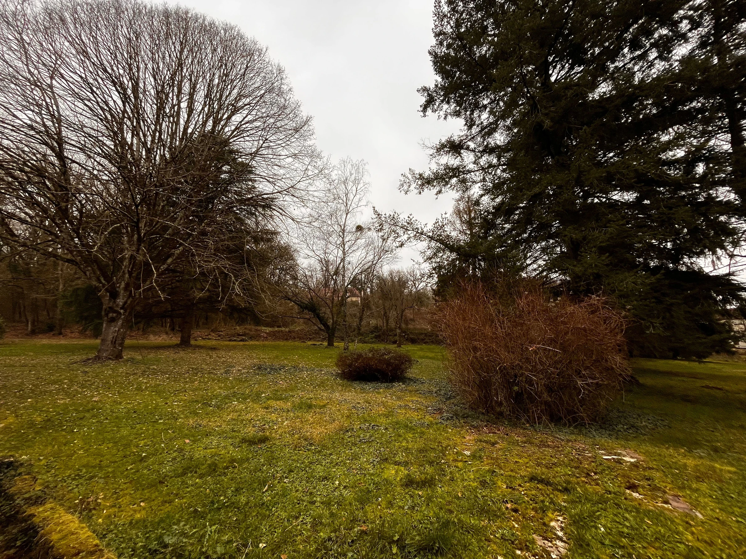Parc ombragé non clos de 4 000m² à l'arrière de la maison avec petit espace clos (salon de jardin, chaises longues, barbecue).