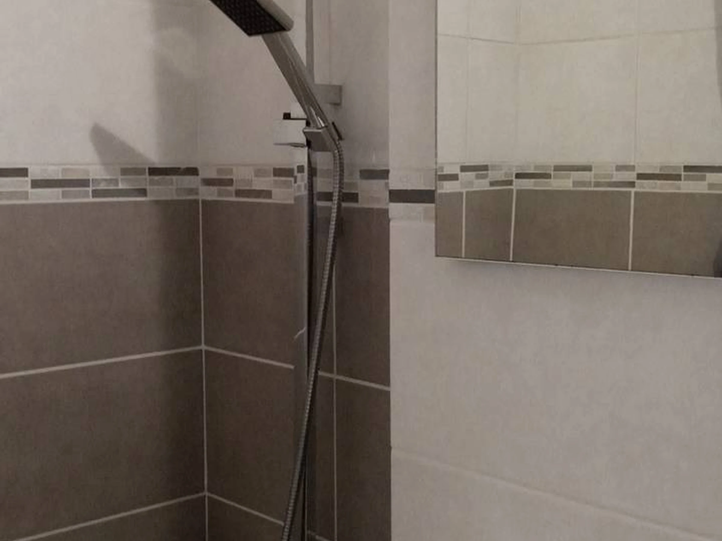A suivre, salle de bain avec baignoire, lavabo, sèche serviette et sèche cheveux, WC indépendant avec meuble de rangement,