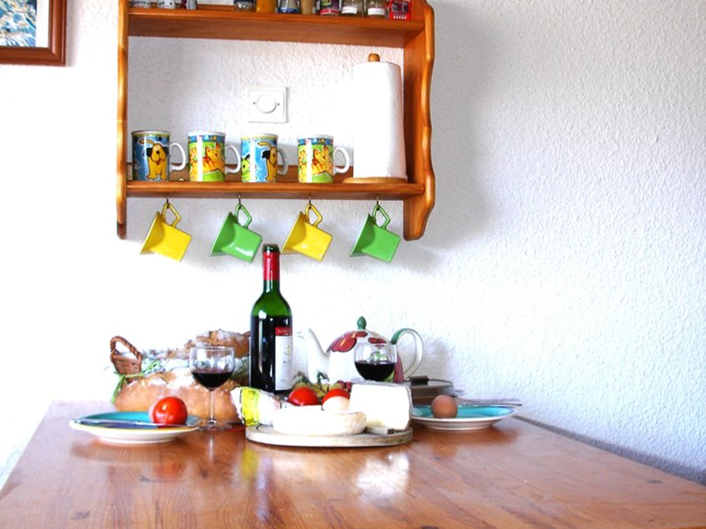 - un coin repas avec une table, 2 bancs et 2 tabourets. Cet espace donne sur un balcon exposé Est offrant une très belle vue sur les montagnes