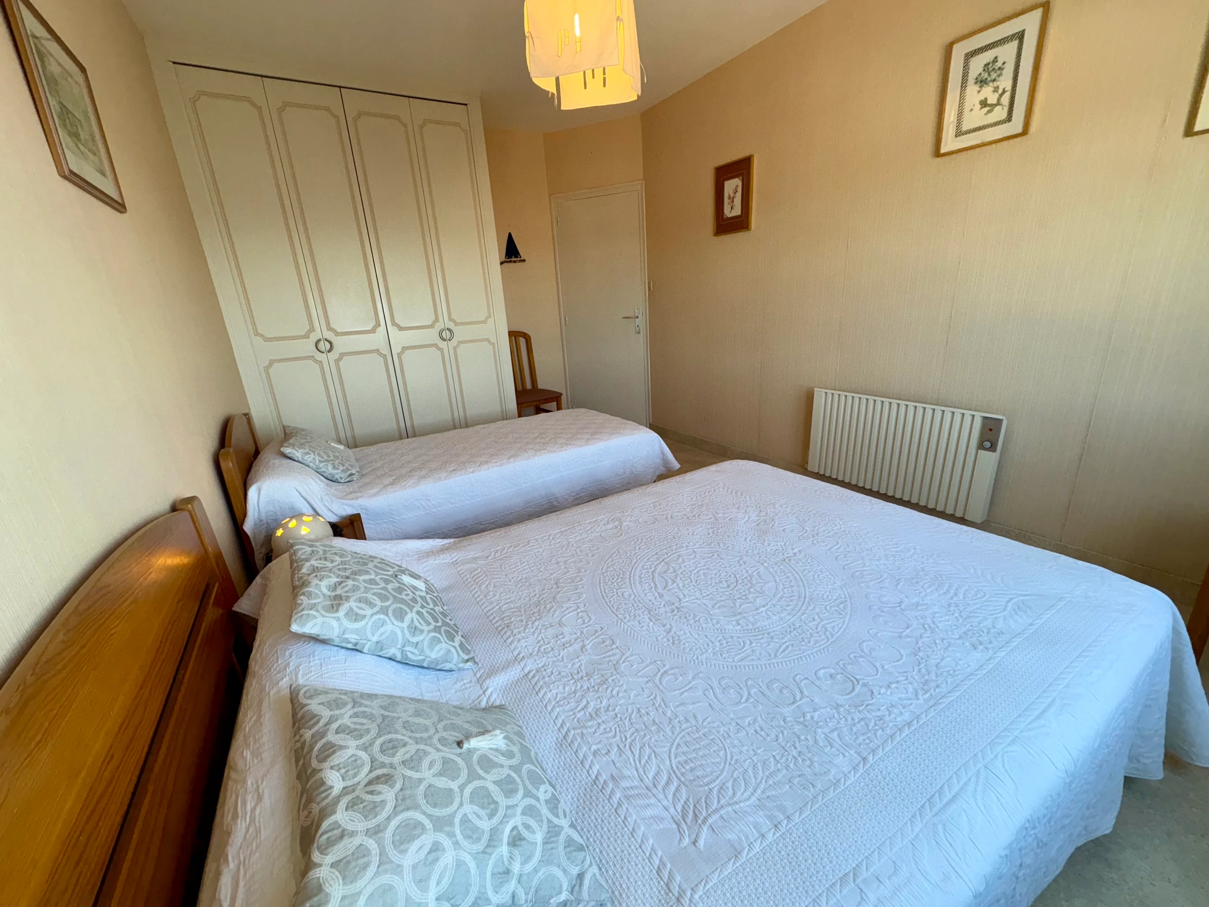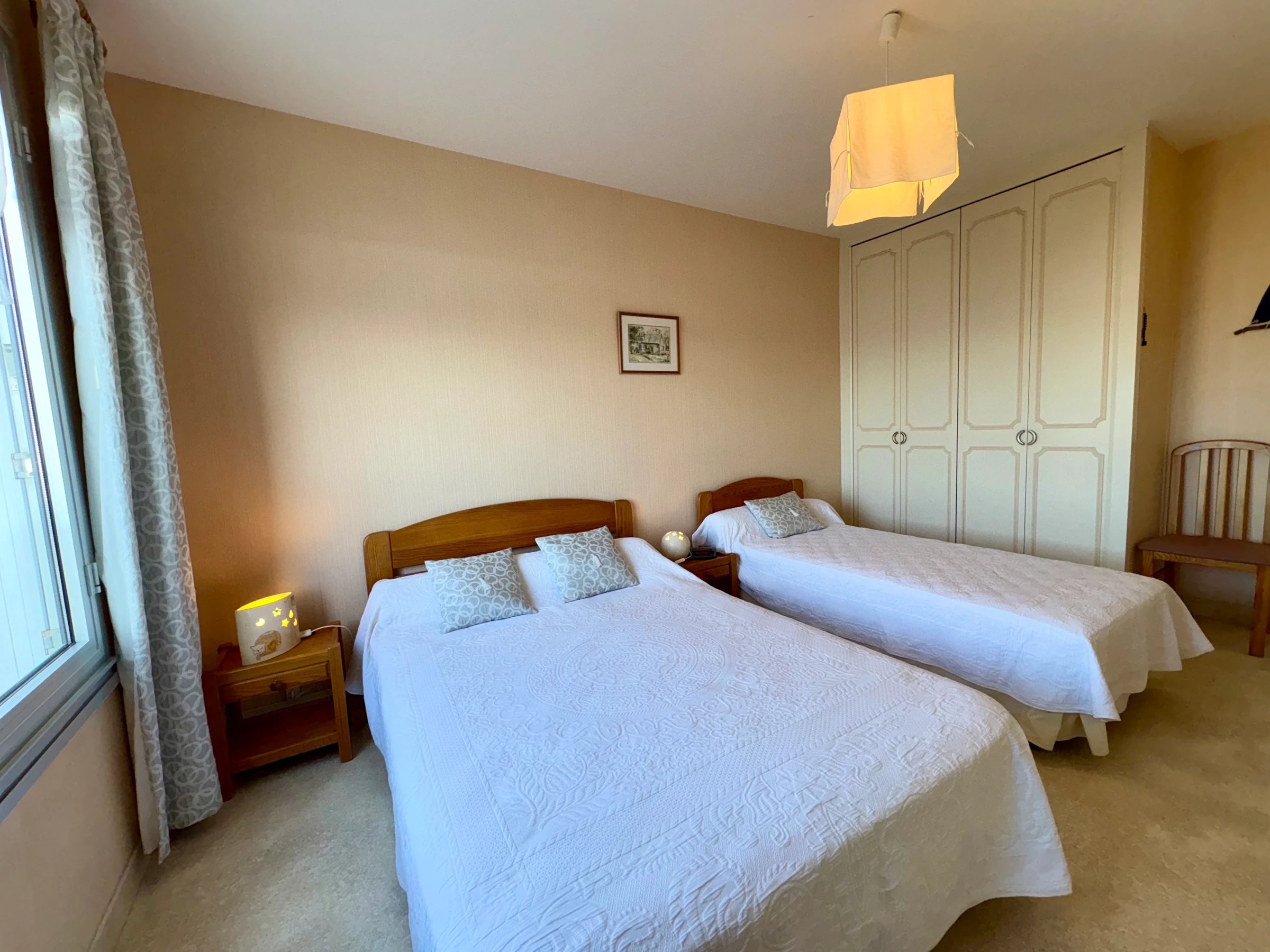 - 1 lit 2 pers (140) - 1 lit 1 pers (0.90) placard - Chevets 2 lampes.