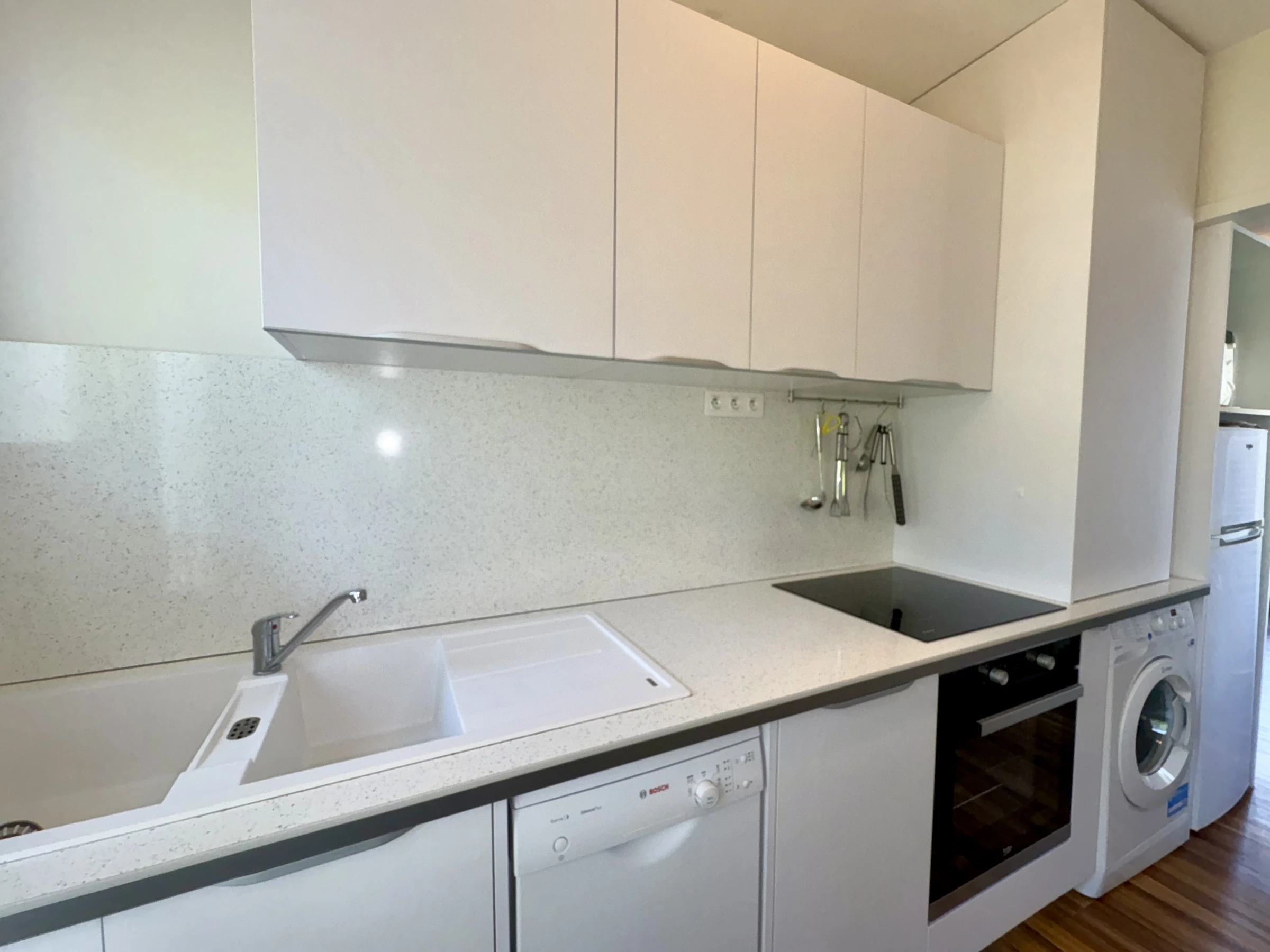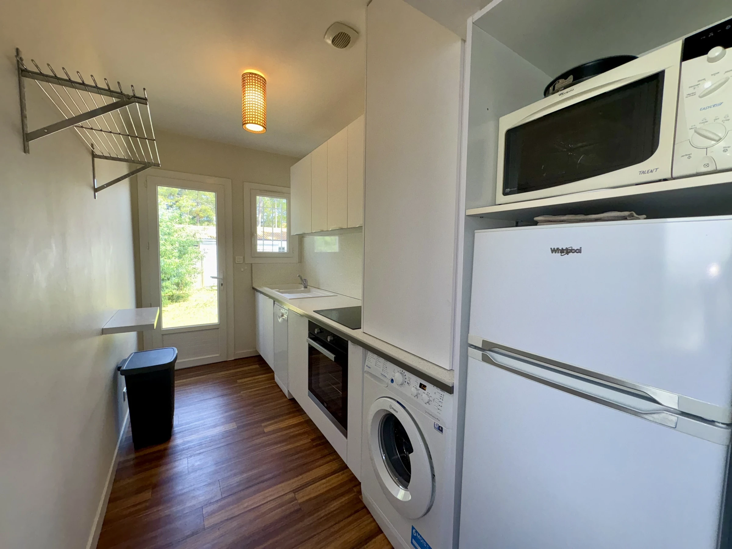 Coin cuisine 9.34 m² ouvert sur la pièce de vie avec porte sortie sur jardin arrière : 3 plaques vitrocéramiques + four + micro ondes - réfrigérateur partie congélateur - Lave vaisselle - Lave Linge - éléments rangement - cafetière BODUM