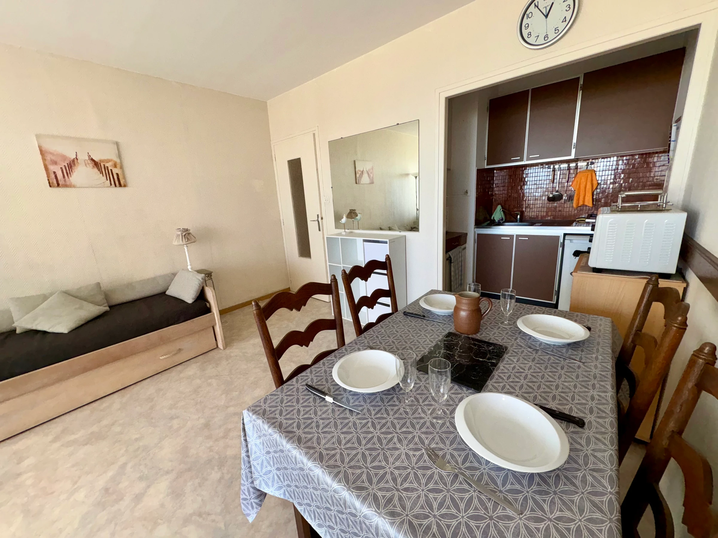 SÉJOUR : baie sur balcon, face mer avec salon de jardin (expo S/O) - 1 canapé convertible 2 personnes (Neuf et très confortable); 2 lits gigognes d'1 pers (SL/ML); table+4 chaises;1 buffet bas; table basse; TV ÉCRAN PLAT