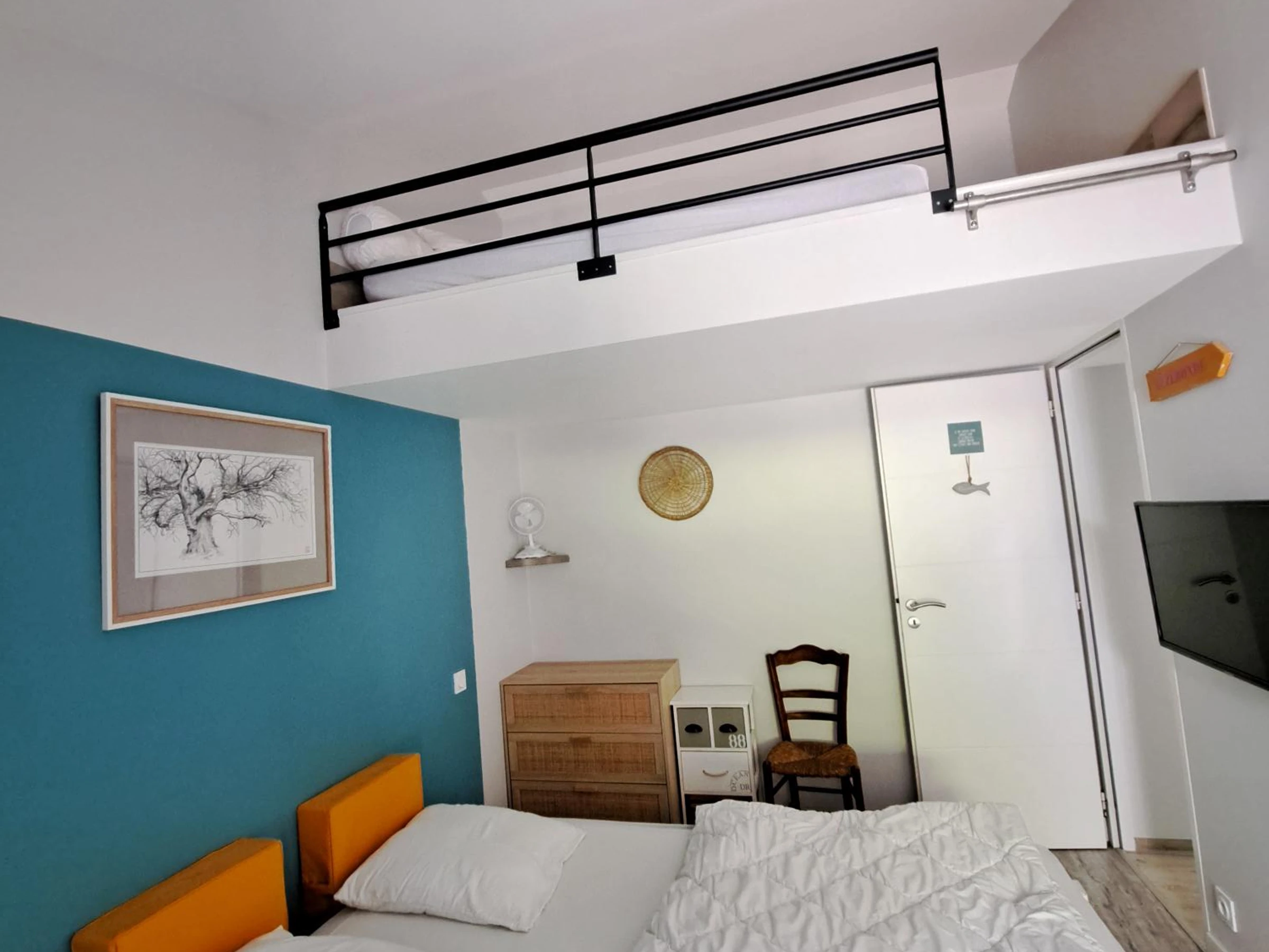 Chambre 1: 1 lit Queen size (160*190) + avec une échelle de meunier : 1 lit de 140*190 et un téléviseur.