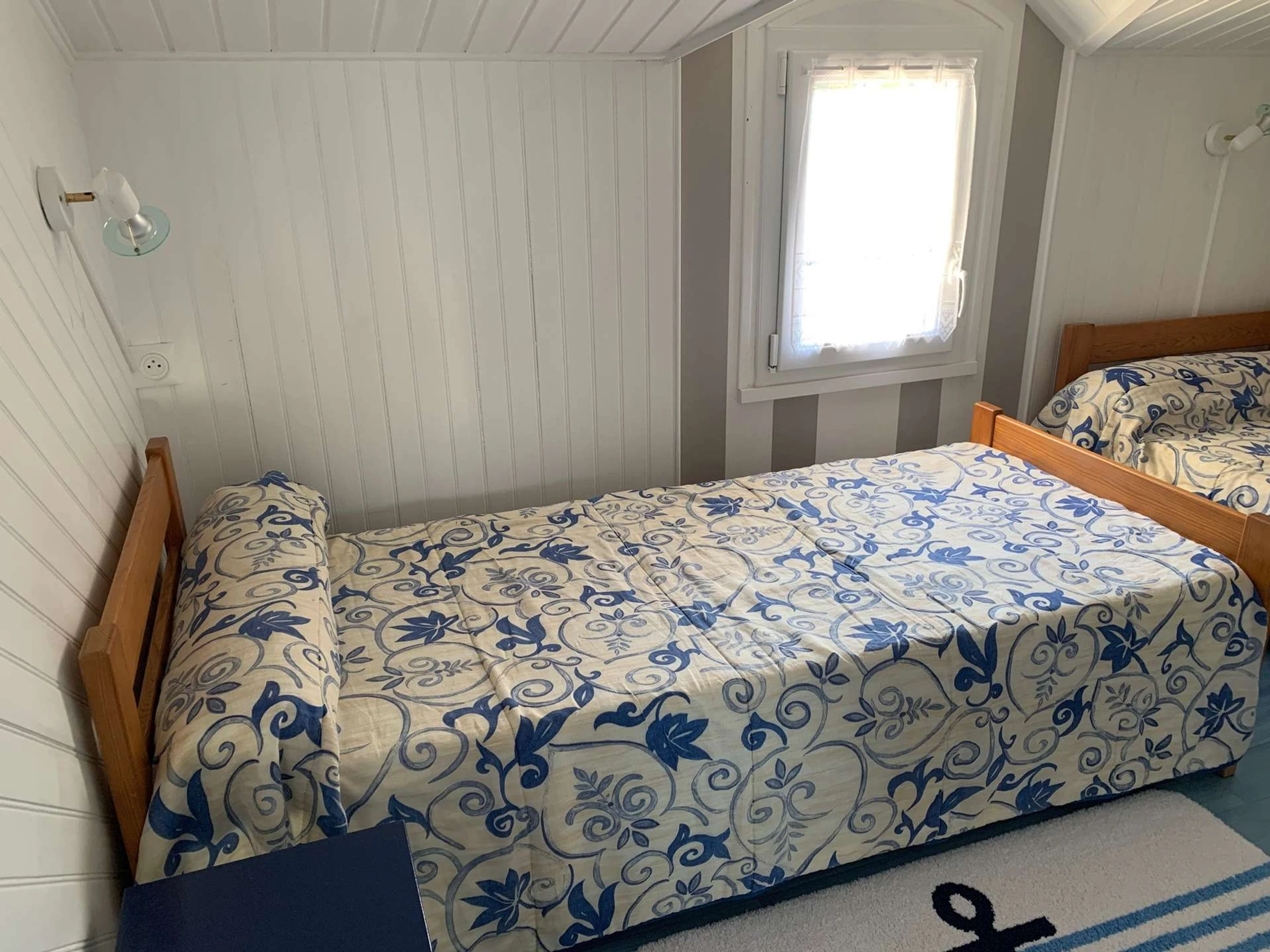 En mezzanine semi-fermée, un coin couchage avec deux lits simples 90.