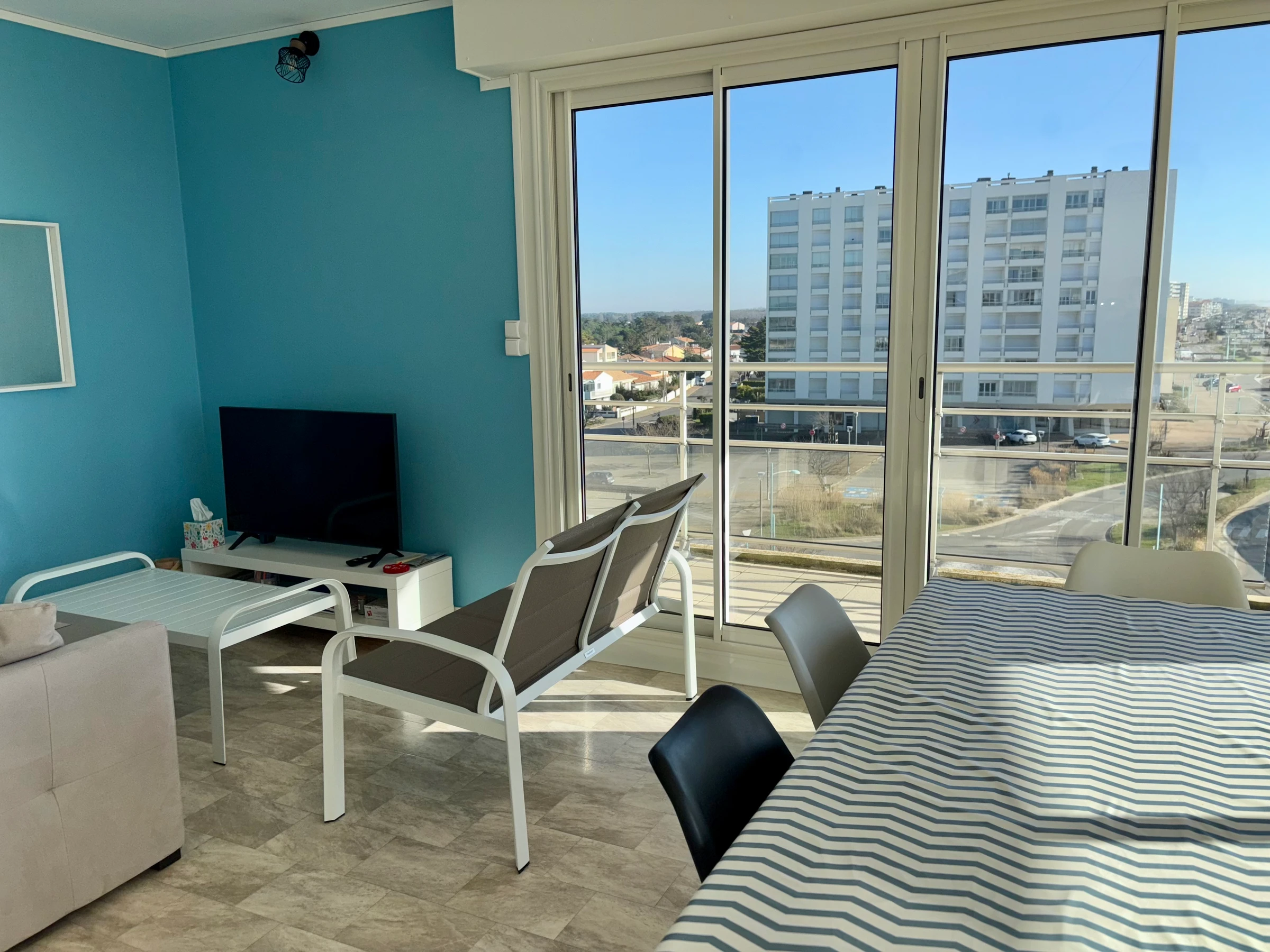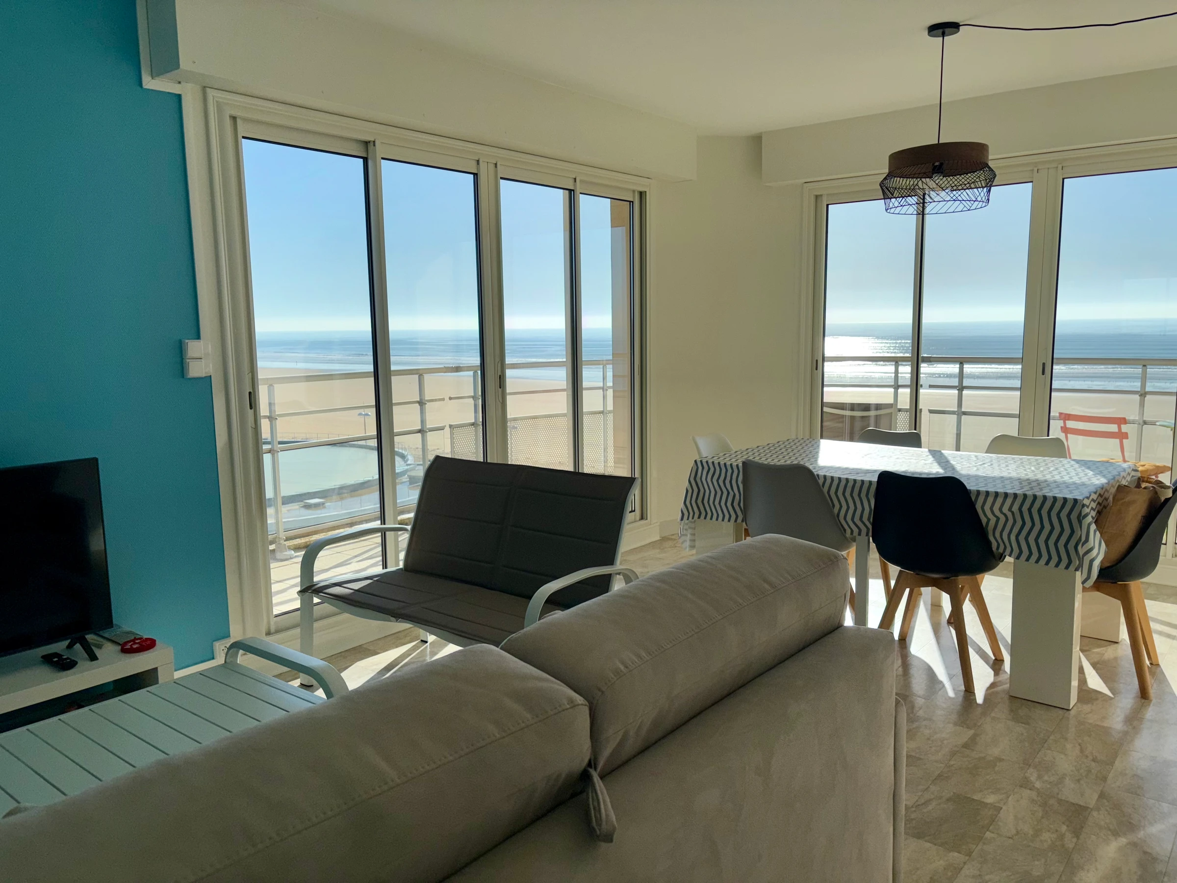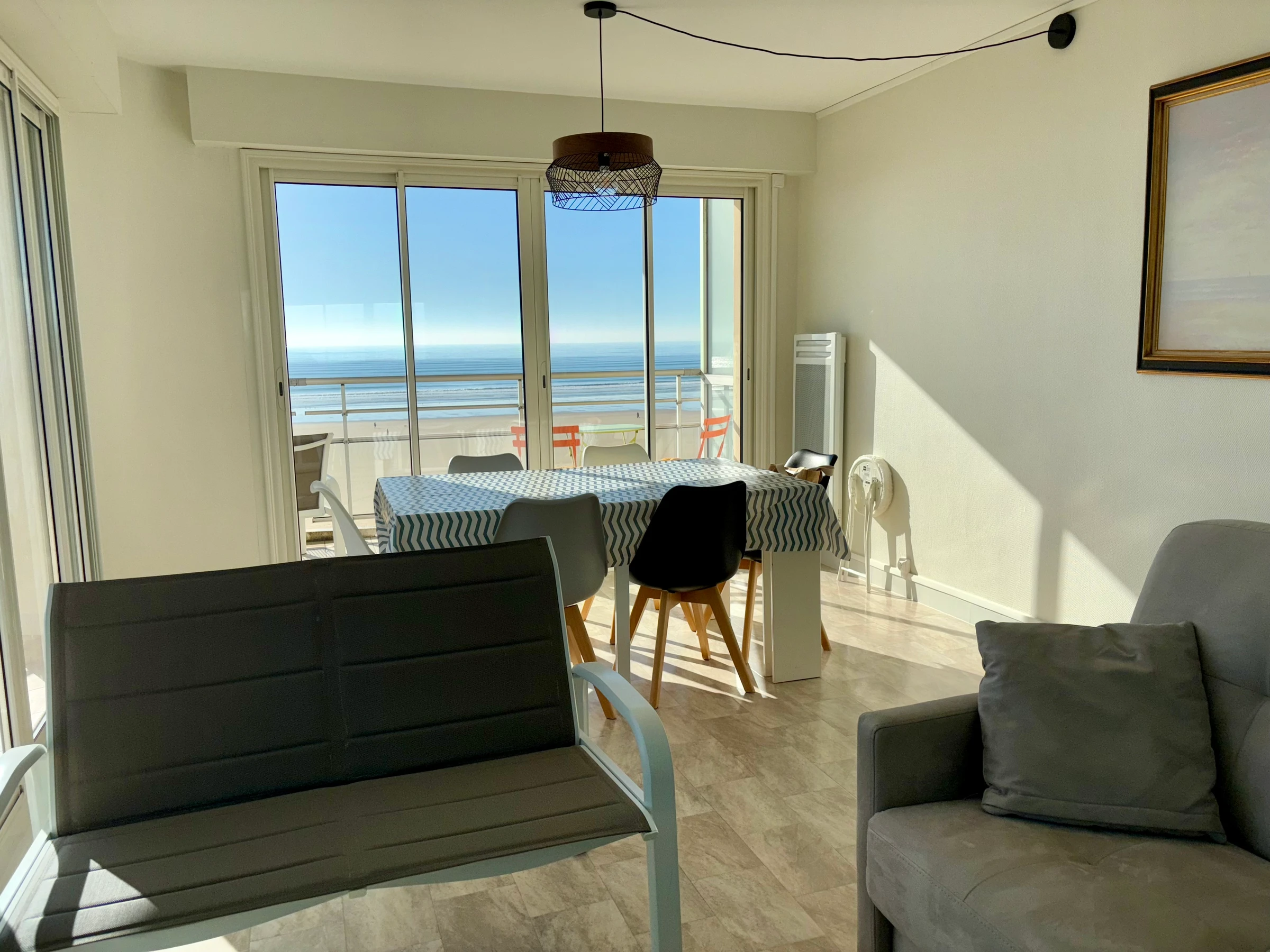 - espace dinatoire ( table et 6 chaises) avec vue sur l'océan et la plage, un canapé convertible 2 couchages (type rapido avec matelas le tout neuf)