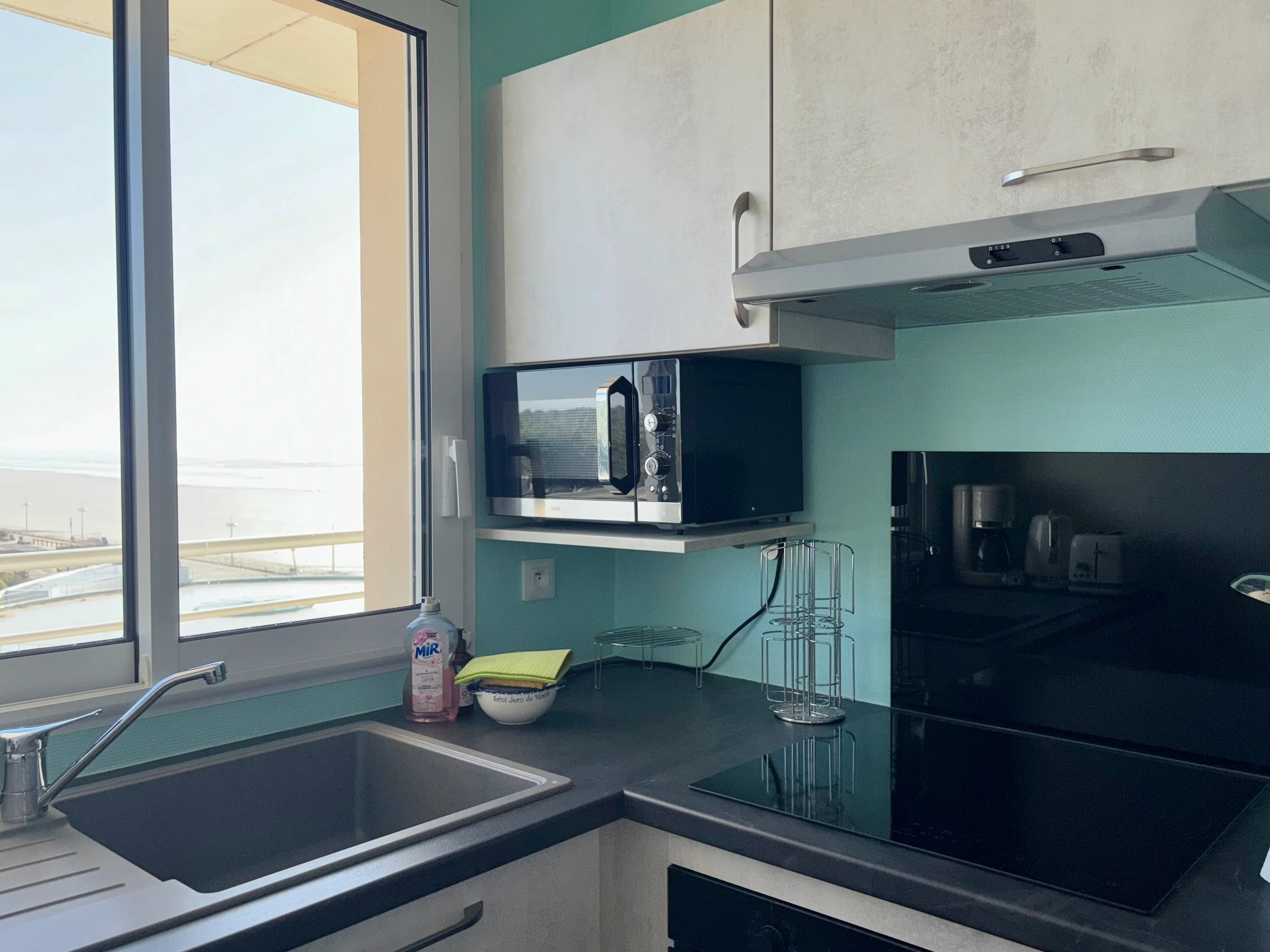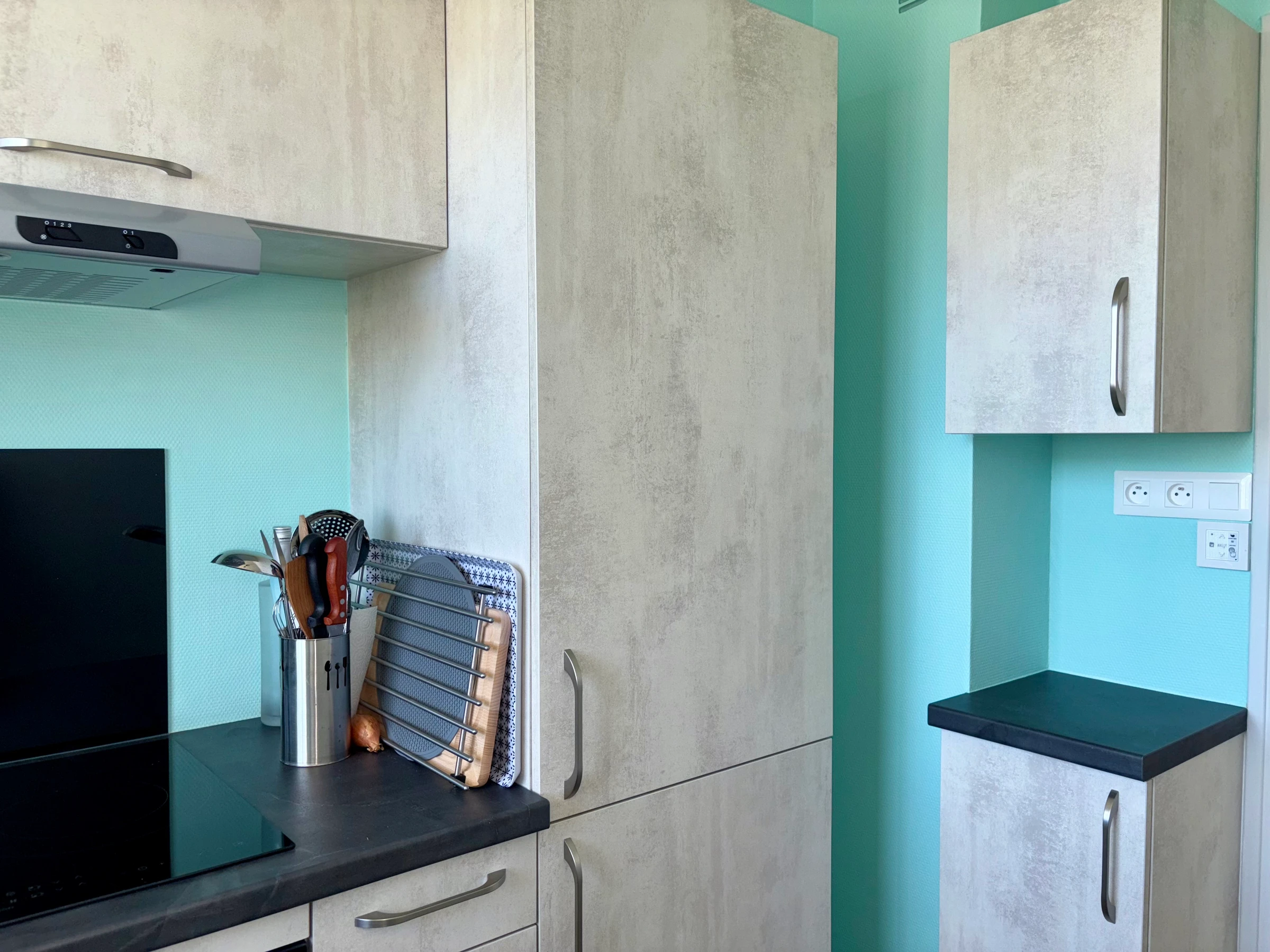 - une cuisine neuve toute équipée avec réfrigérateur / congélateur encastré, plaque induction, four électrique, hotte, micro-ondes, lave vaisselle, cafetière, grille pain, bouilloire.