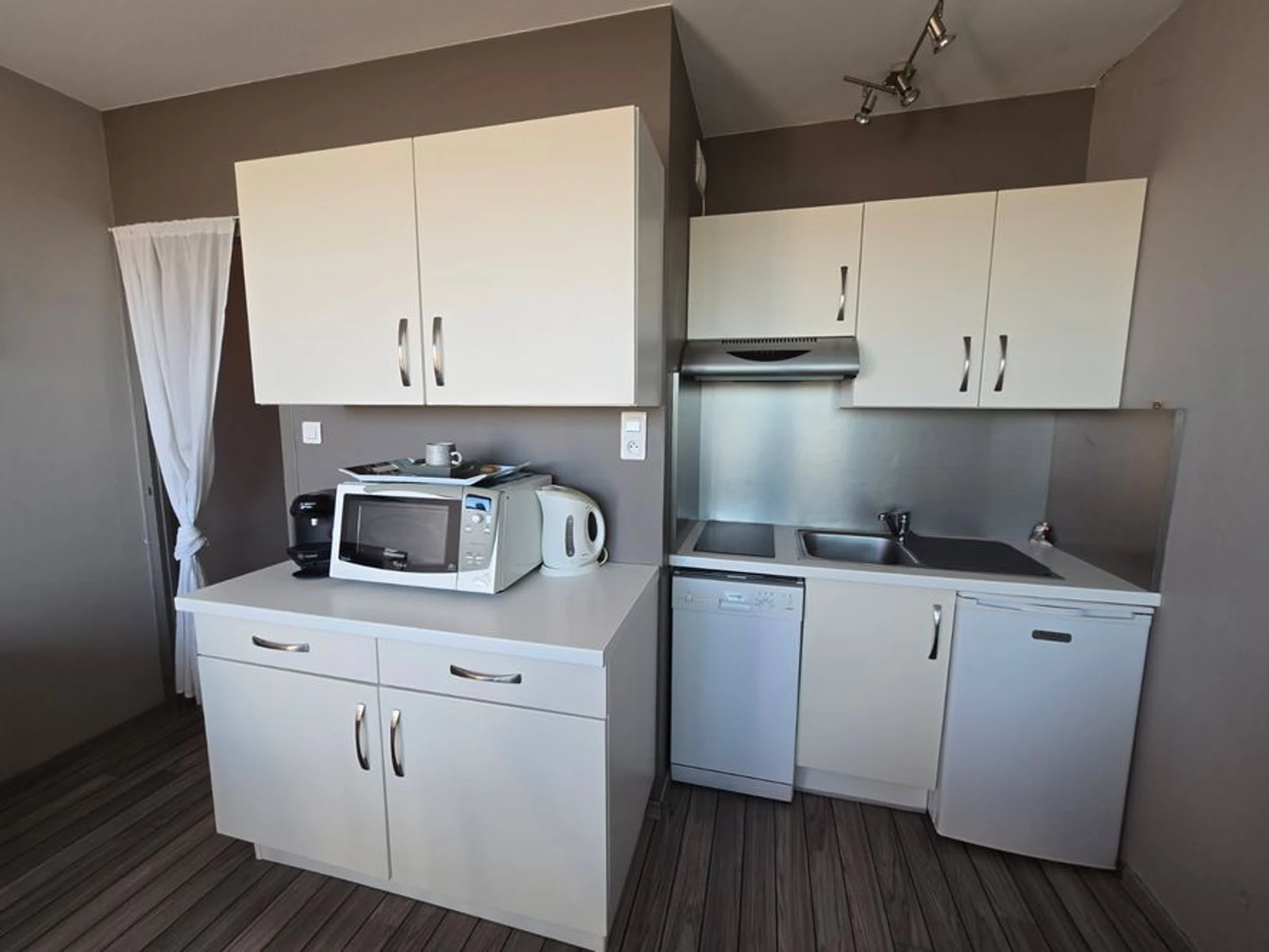 - COIN-CUISINE aménagé et équipé : évier - 2 plaques induction - four mixte micro-ondes - réfrigérateur - hotte - rangements - lave-vaisselle - bouilloire - cafetière à filtres - cafetière TASSIMO - grill-pain
