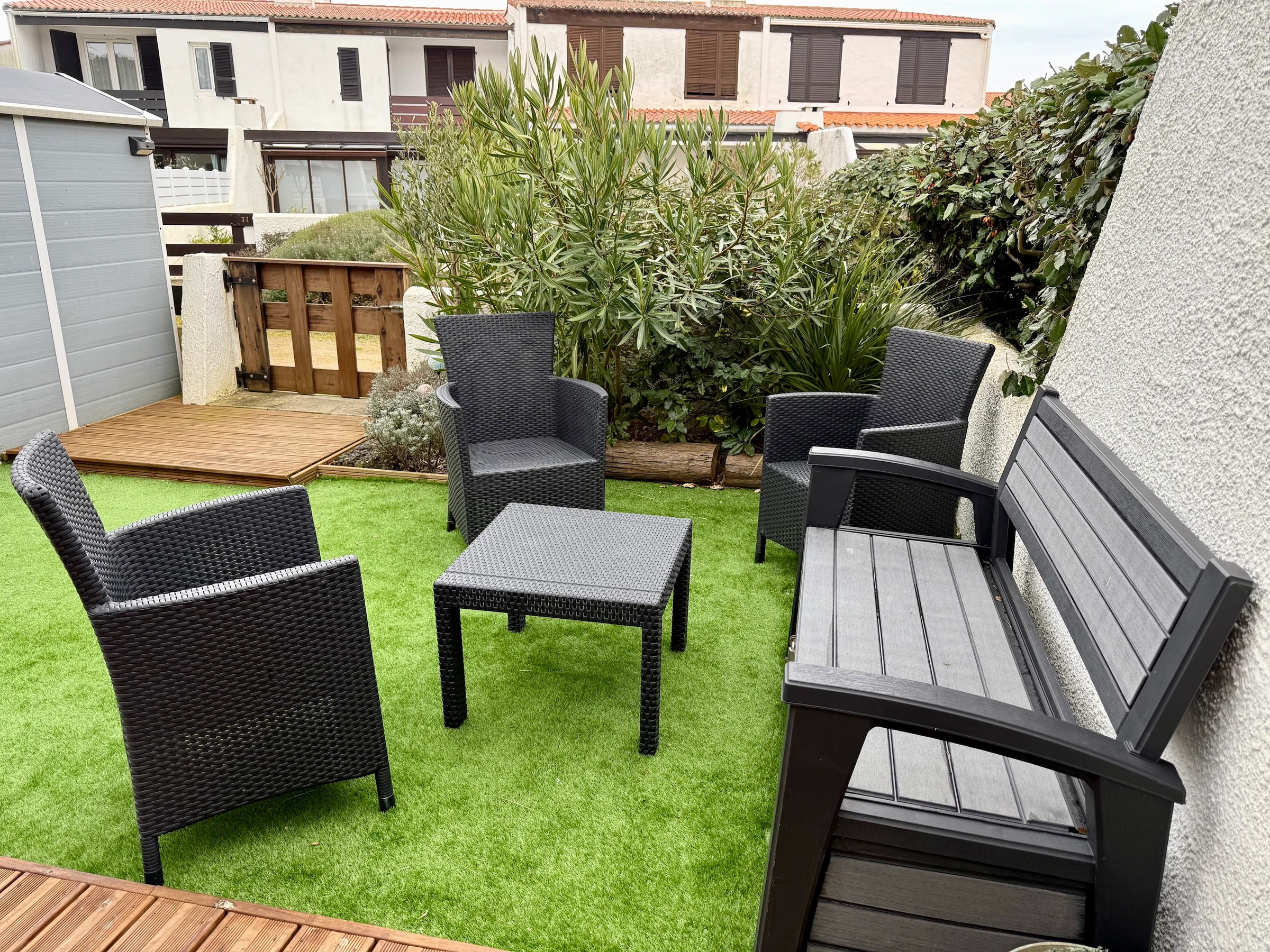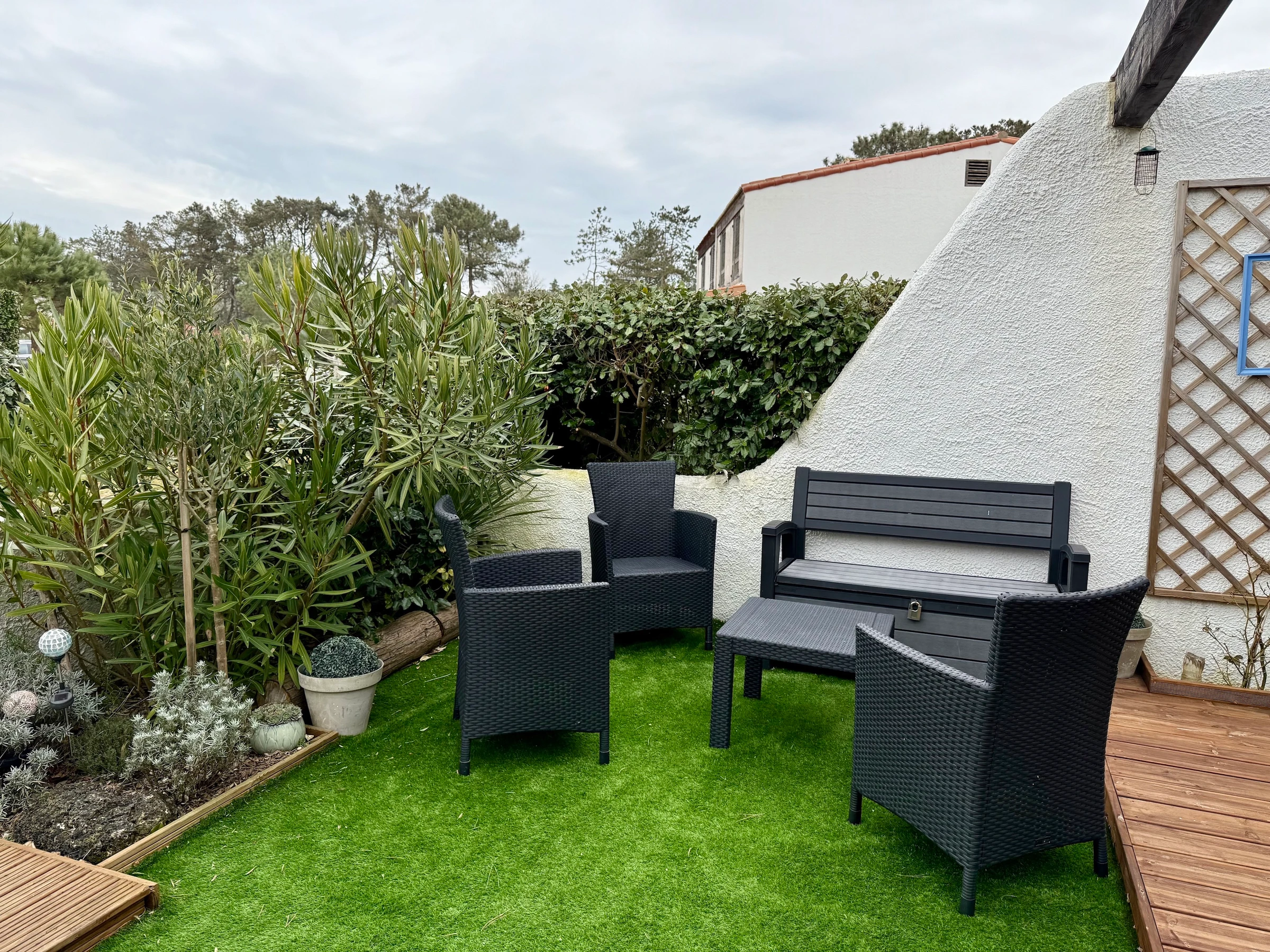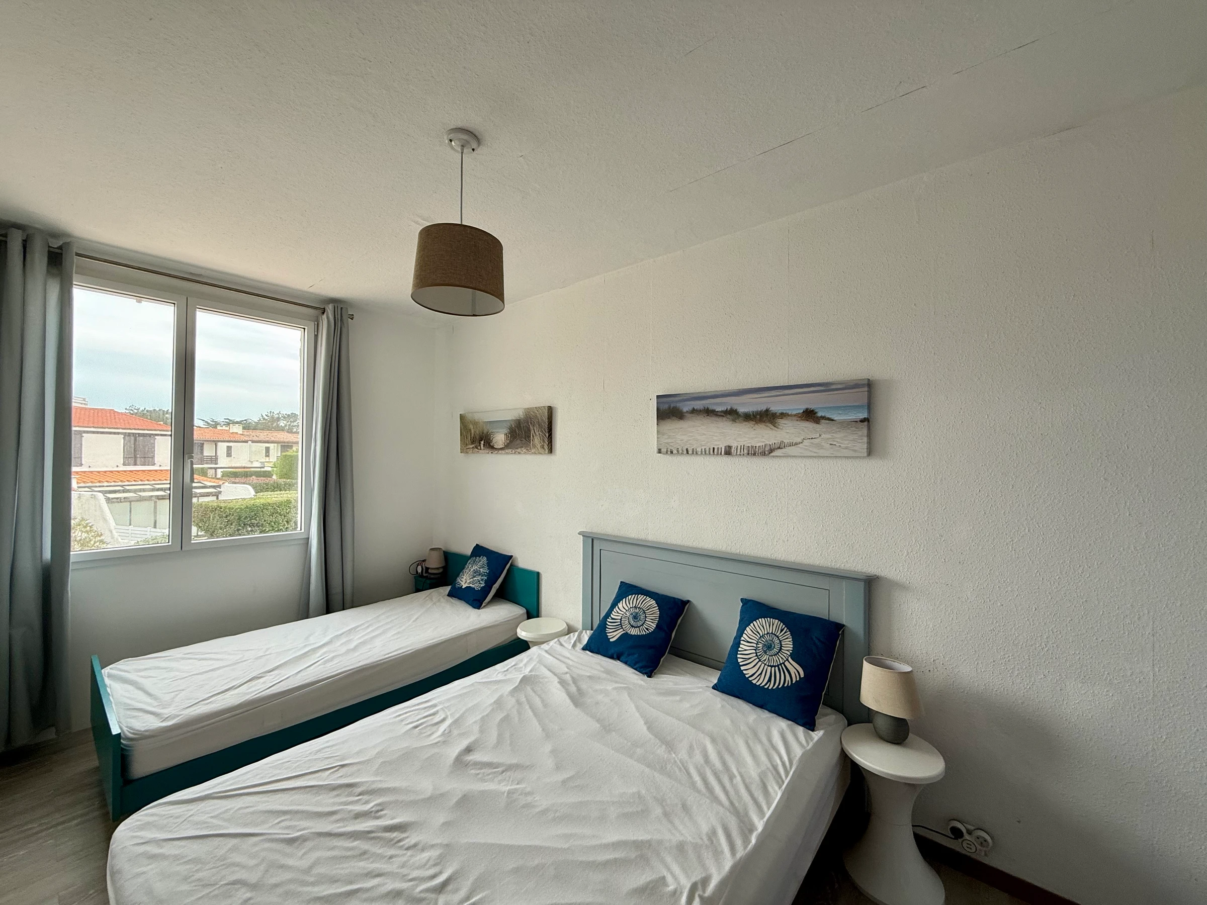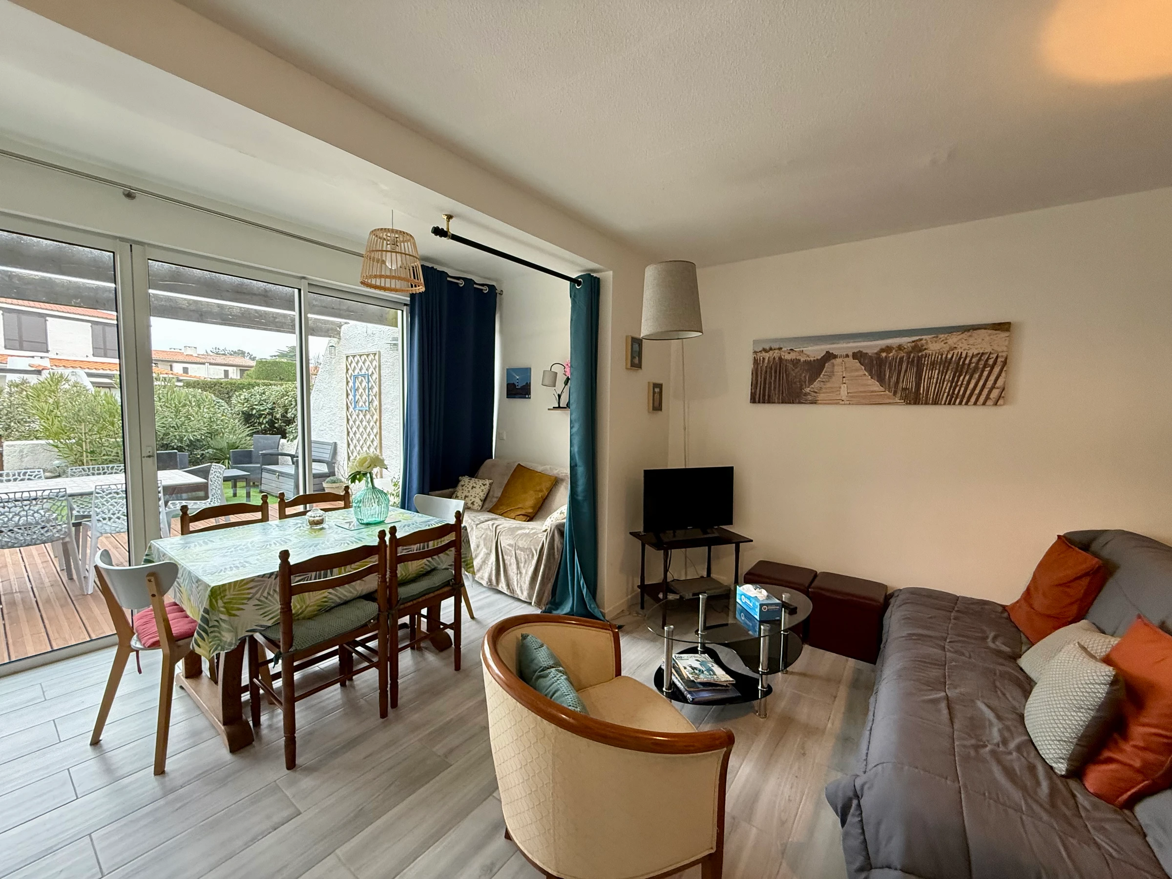 A Saint Jean de Monts, idéalement situé au coeur de la station, proche de la longue plage de sable fin, et de tous commerces et activités (golf, tennis, équitation, sports nautiques, thalassothérapie....), au sein de la résidence "Les Loriots", maison très bien équipée offrant au rez de chaussée un beau séjour avec un couchage canapé lit double, une cuisine ouverte équipée et aménagée, un cellier et WC, à l'étage une chambre avec un lit double (140 cm), une seconde chambre avec un lit double et un lit simple, une salle de bain. Jardinet clos avec salon de jardin et plancha. Parking privatif. Animaux non acceptés.