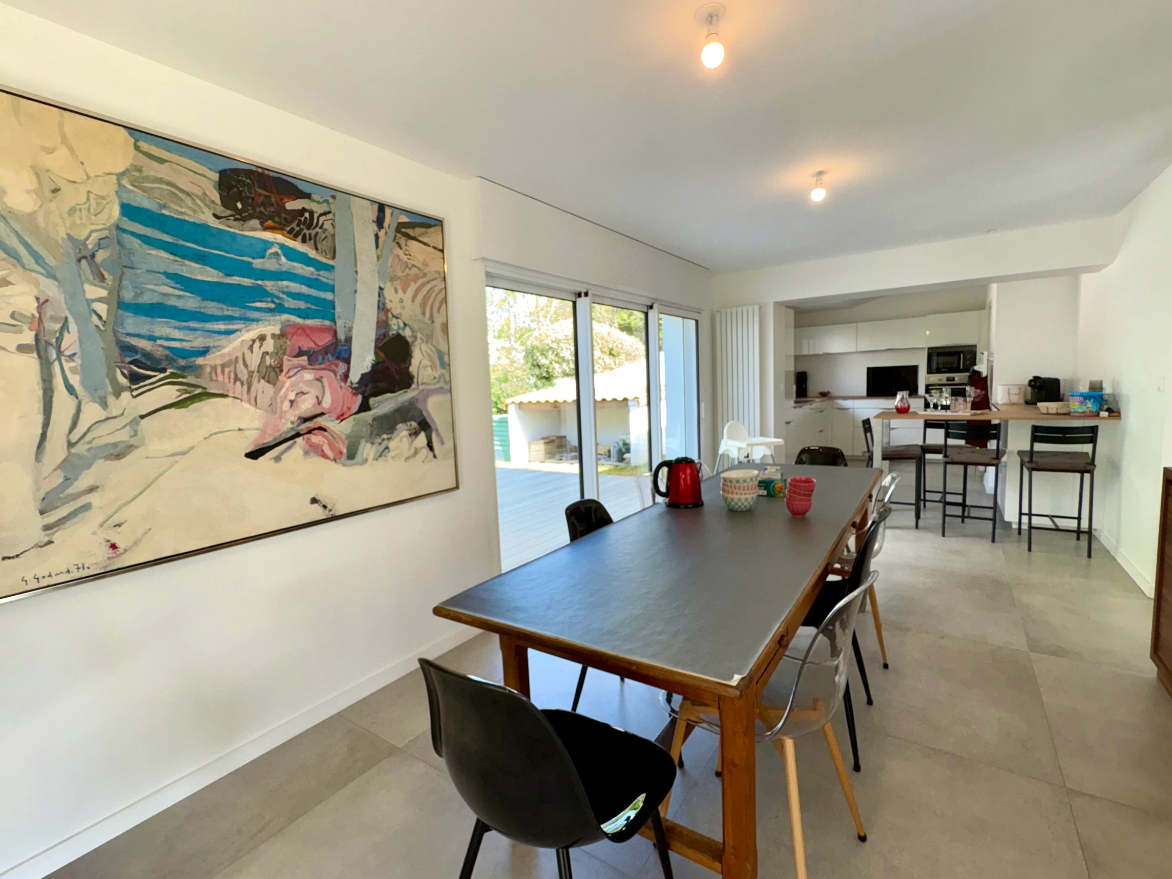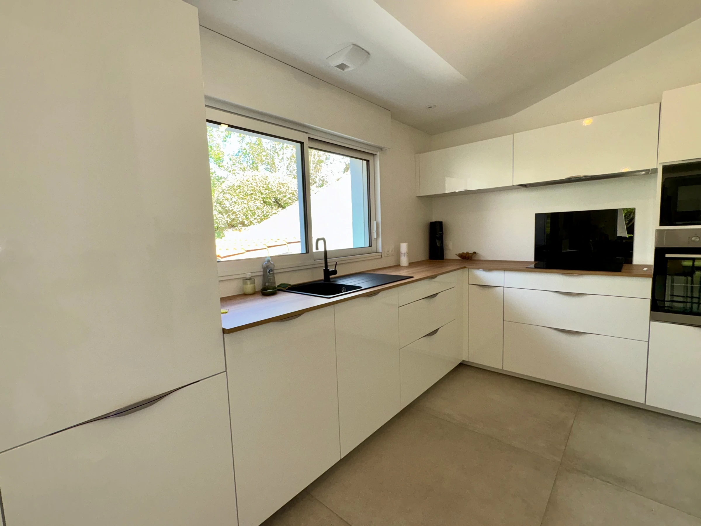 > Cuisine aménagée et équipée : 1 plaque induction 4 feux, four électrique, réfrigérateur-congélateur, hotte, rangement, lave-vaisselle, micro-ondes, bouilloire, cafetière capsule (expresso) et coin repas avec table et chaises.