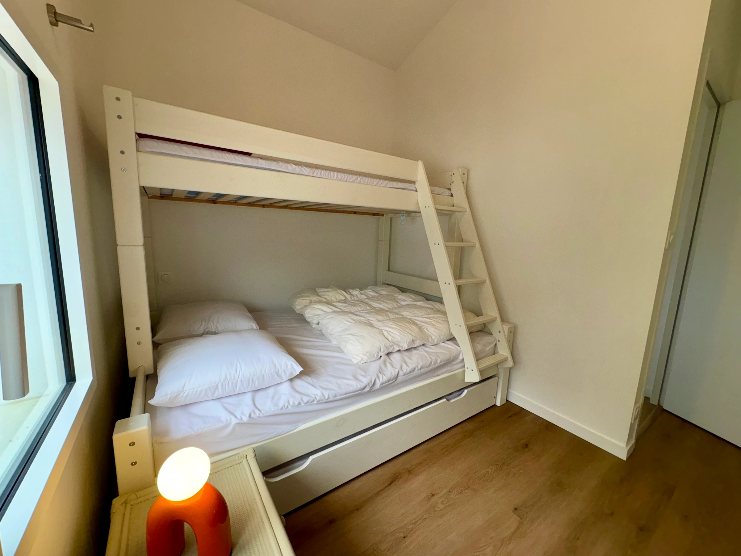 >Chambre N°4 : 1 lit double 160*200, 2 couchages, un lit superposé au dessus du lit double 80*200, lampes, bureau, rangement et fenêtre.