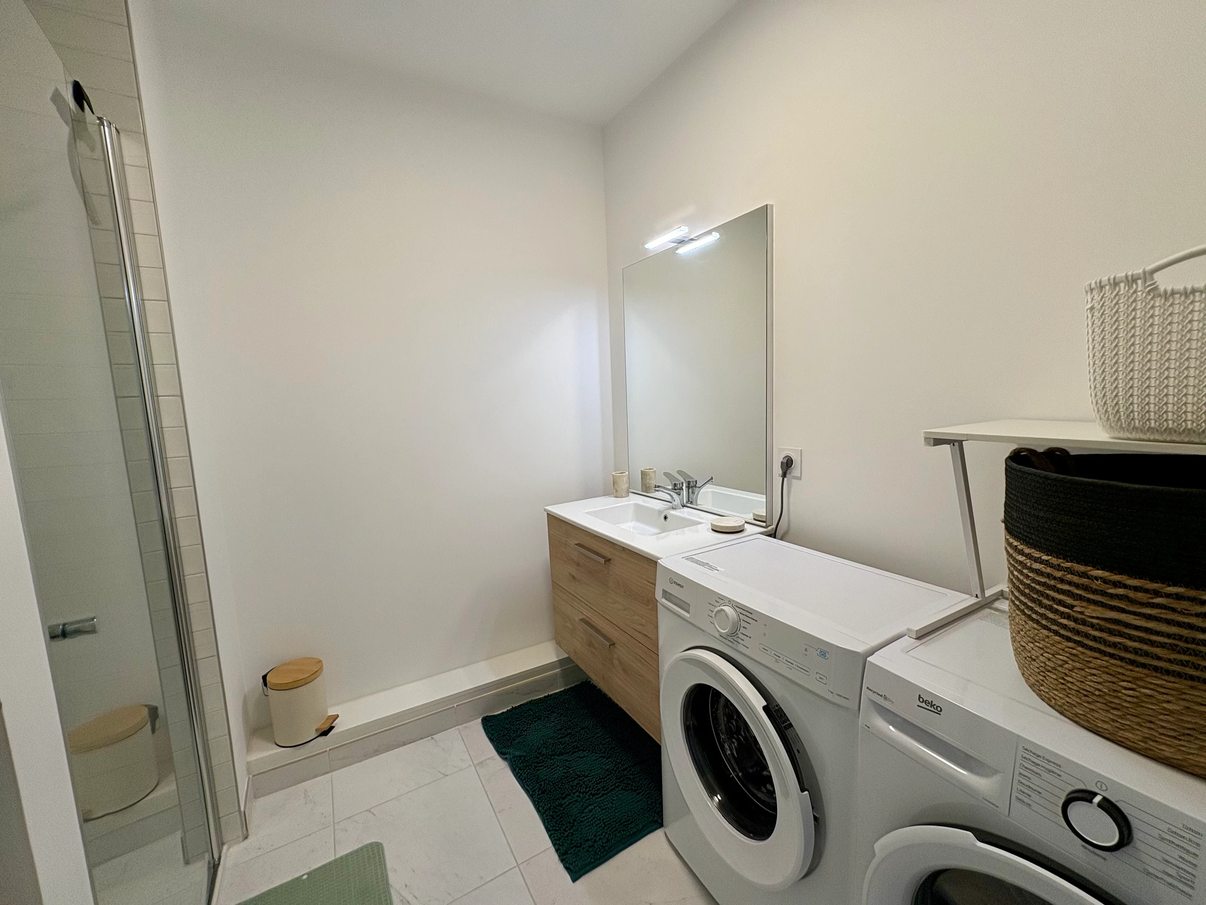 Plaque induction, four, micro-ondes, hotte, réfrigérateur-congélateur, lave-vaisselle, lave-linge, sèche-linge, ustensiles et vaisselle complets, grille-pain, bouilloire, cafetière (classique et à dosette).