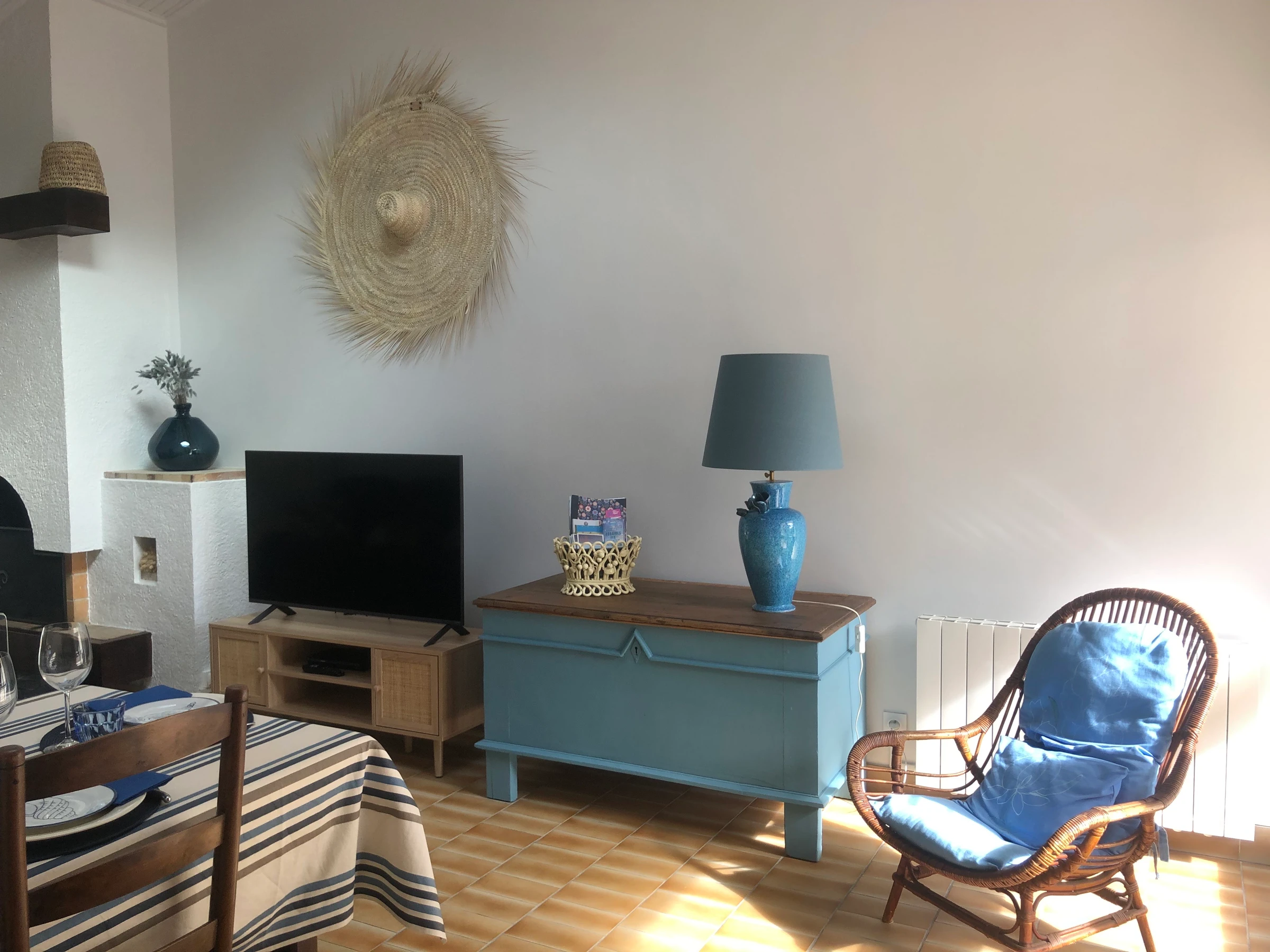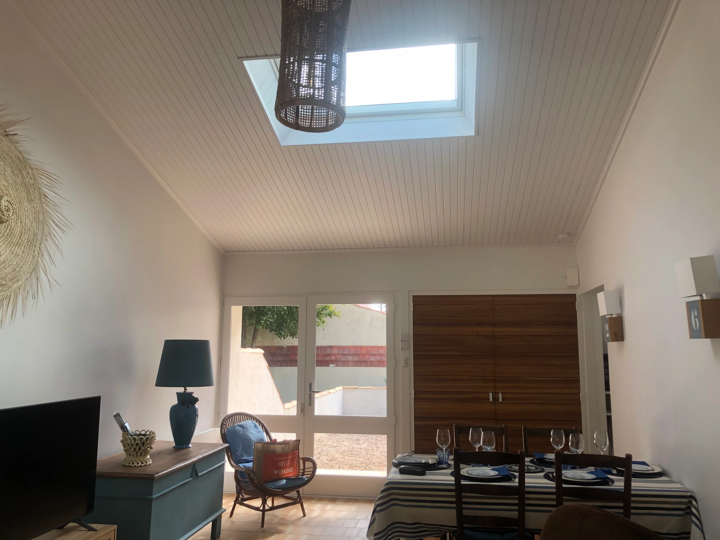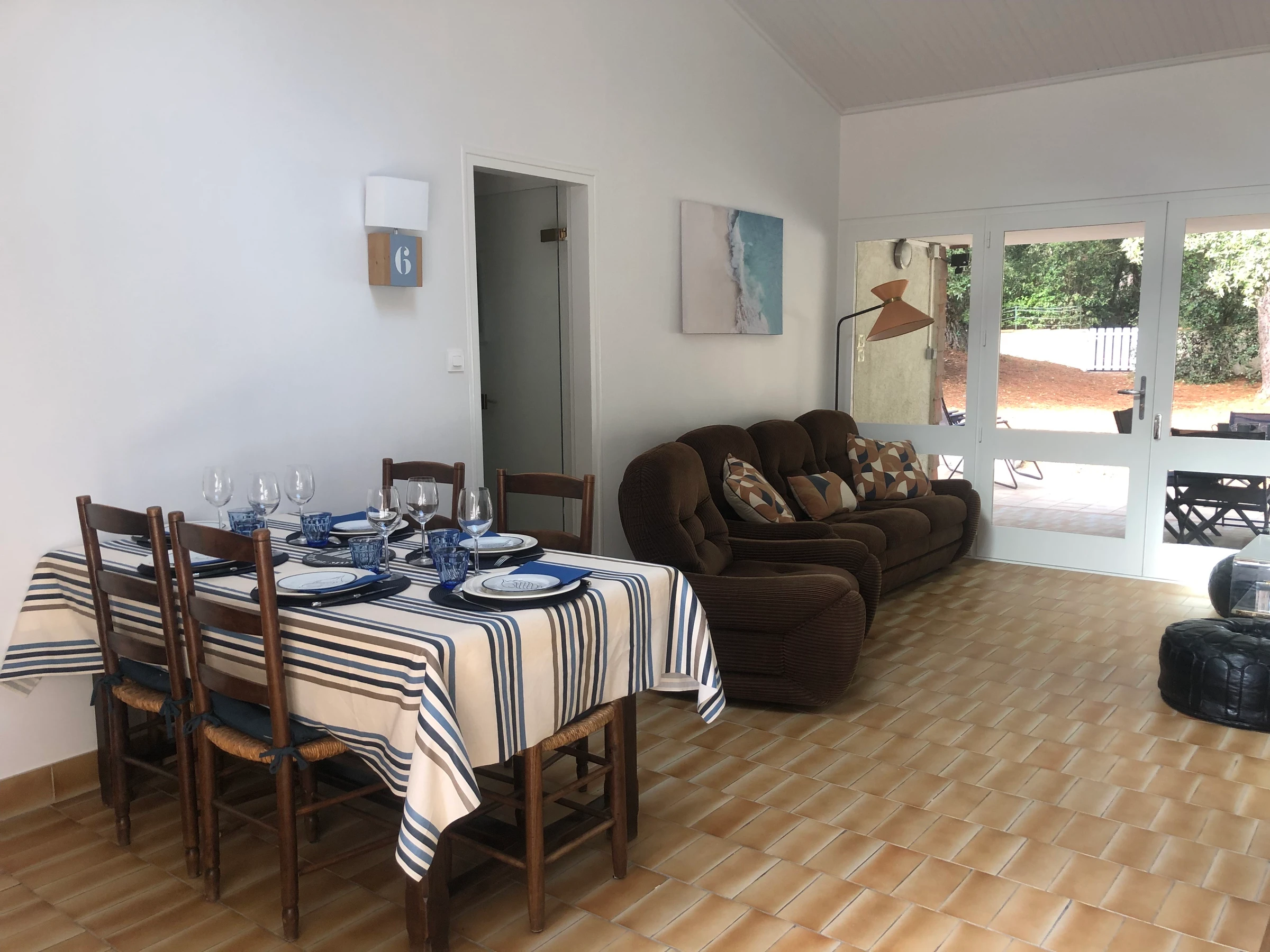 - Salon / Séjour traversant : une table dinatoire avec chaises, 1 canapé, 1 fauteuil, une télévision écran plat, Blue ray et radio. Des portes fenêtres donnent accès à la terrasse et jardin.