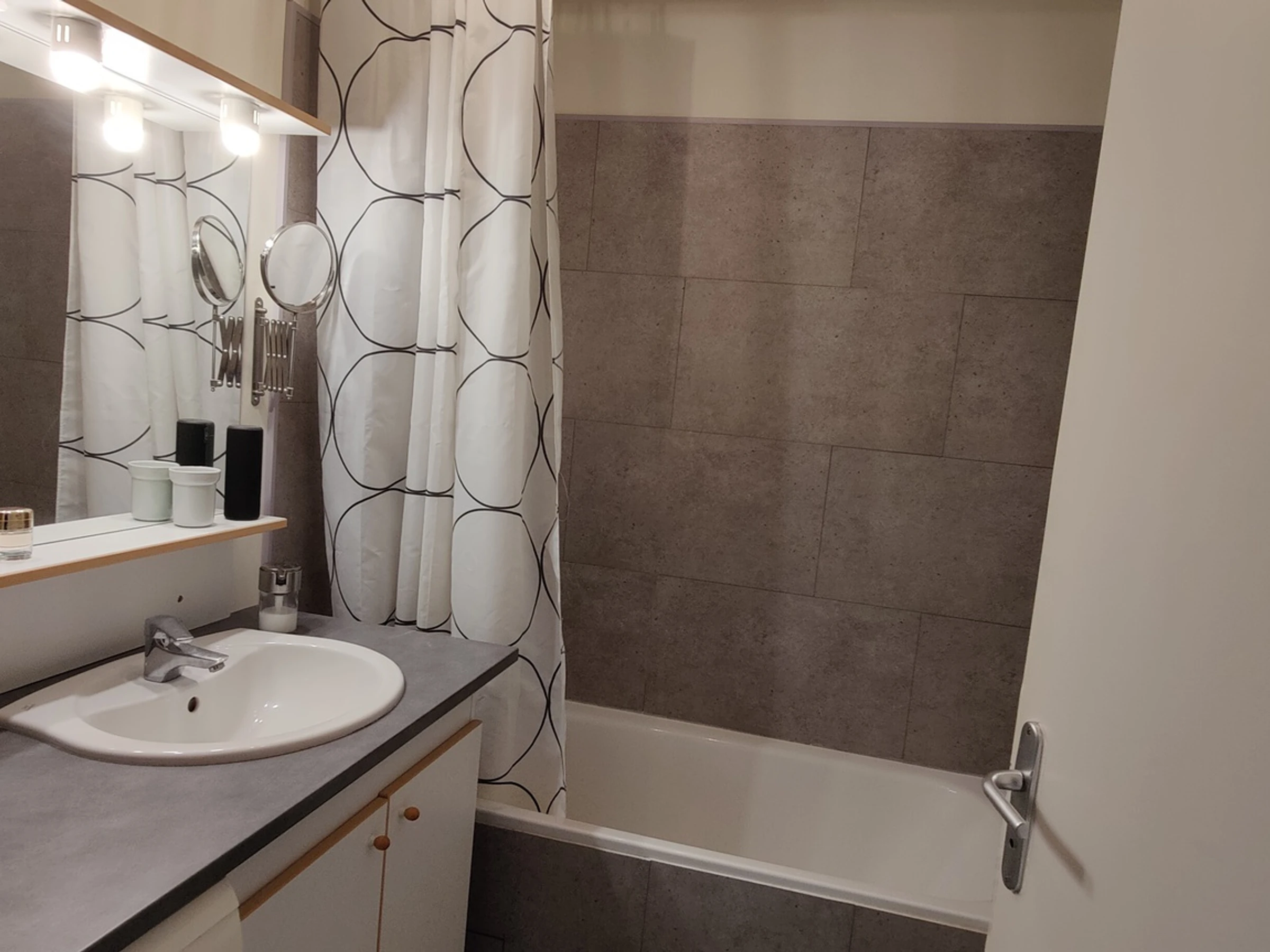 Entrée/Hall (4.27m²) avec penderie desservant : Chambre 1 (12.70m²) avec lits, placard penderie, fenêtre Est vue bâtiment - WC - SdBains : Baignoire, lavabo vasque sur meuble de rangement, lave-linge, radiateur sèche-serviette - Chambre 2 (9.80m²): lit, penderie, fenêtre Est vue bâtiment - Séjour (18.50m²) : Coin cuisine équipée : Plaque 4 feux, réfrigérateur, four, lave-vaisselle, micro-ondes, hotte - Coin salon avec banquette, TV - Coin repas avec table et chaises, baie vitrée accès balcon sud