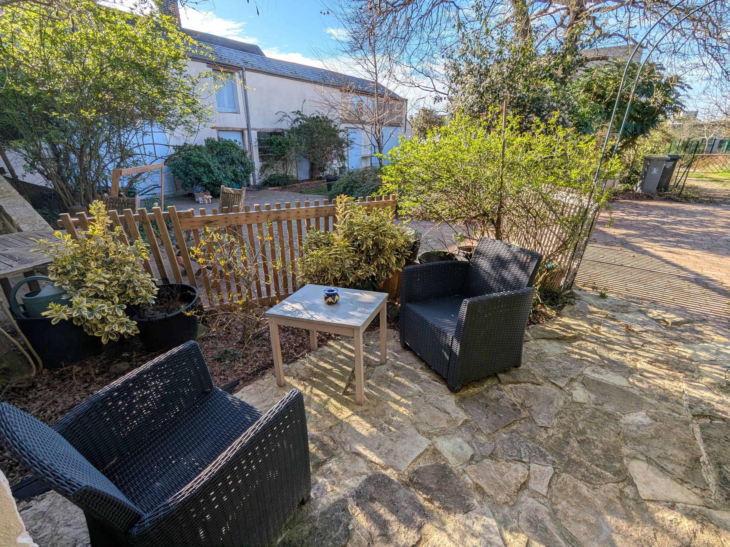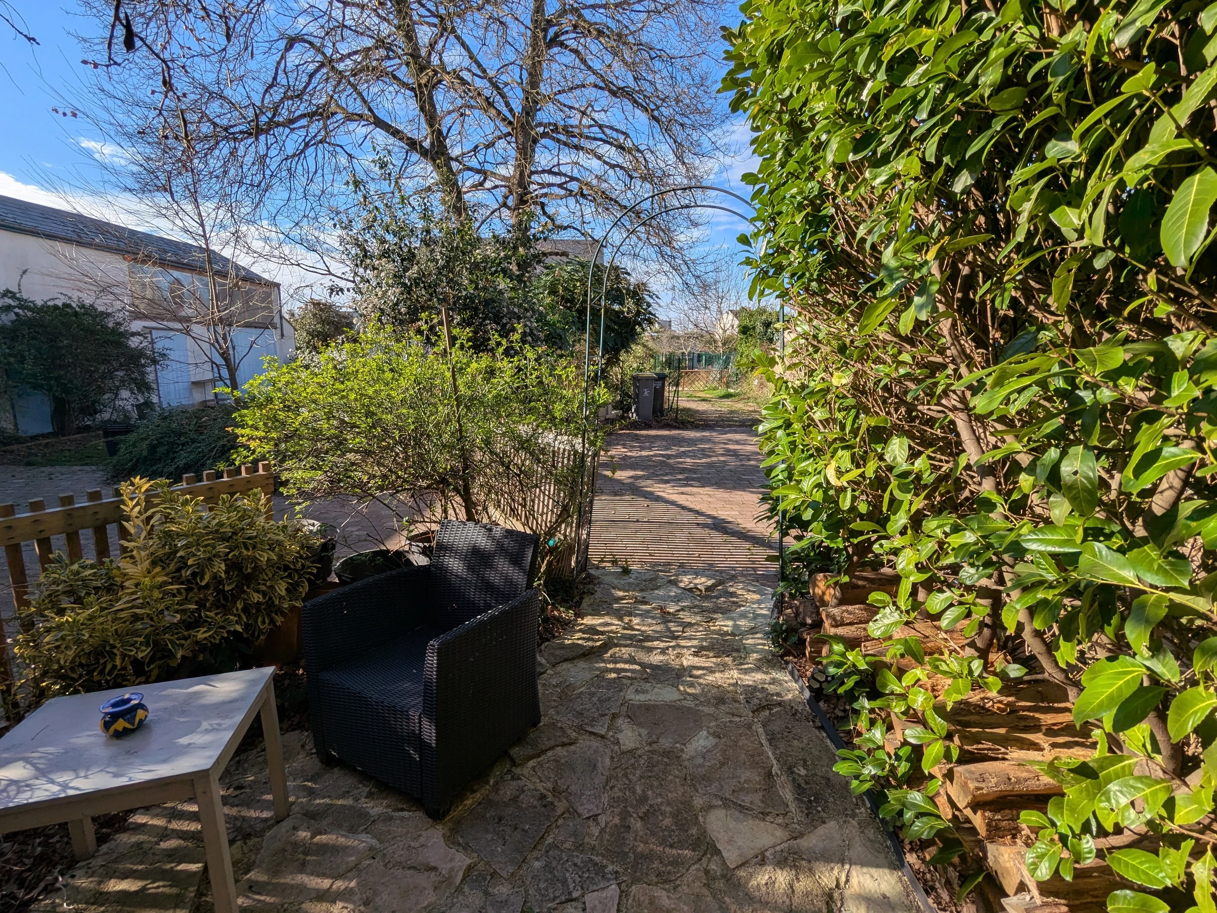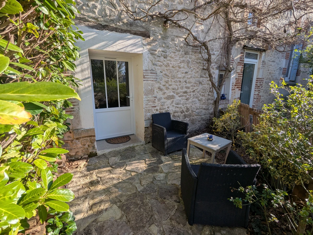 À l’extérieur, une petite terrasse privative avec deux fauteuils vous attend sous la glycine, au sein d’un terrain commun clos.