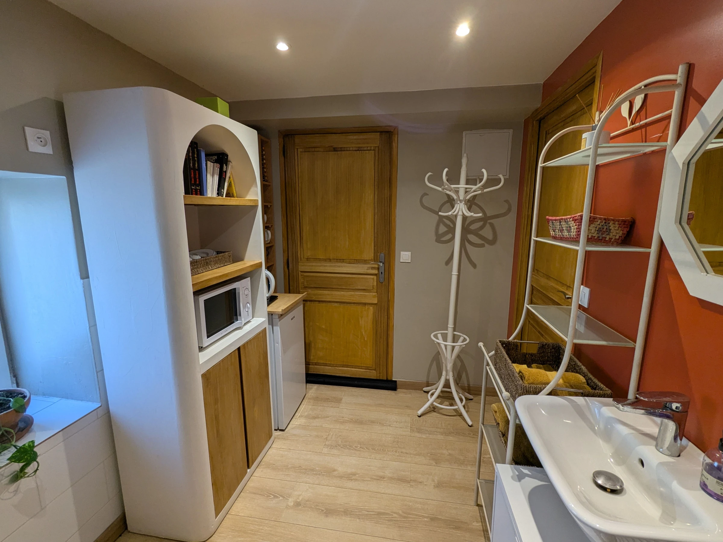 Vous bénéficiez également d’une salle d’eau privative attenante avec douche, meuble vasque et WC. Un espace pratique est à votre disposition avec petit réfrigérateur, micro-ondes, machine à café Nespresso, bouilloire et kit de couverts.