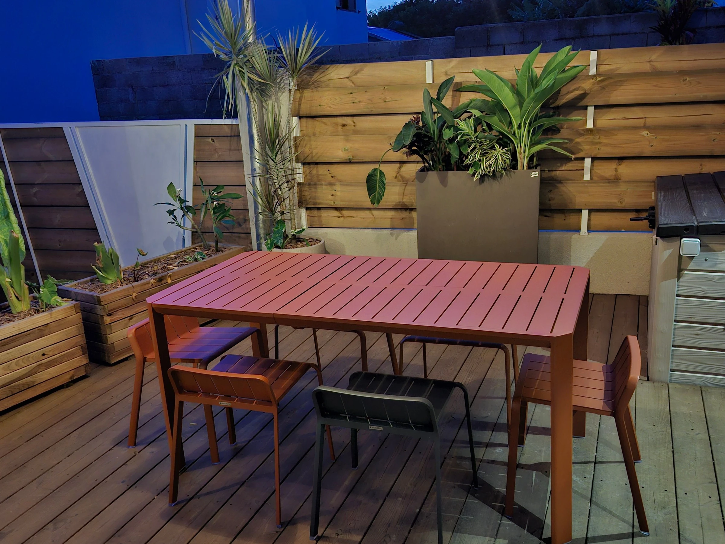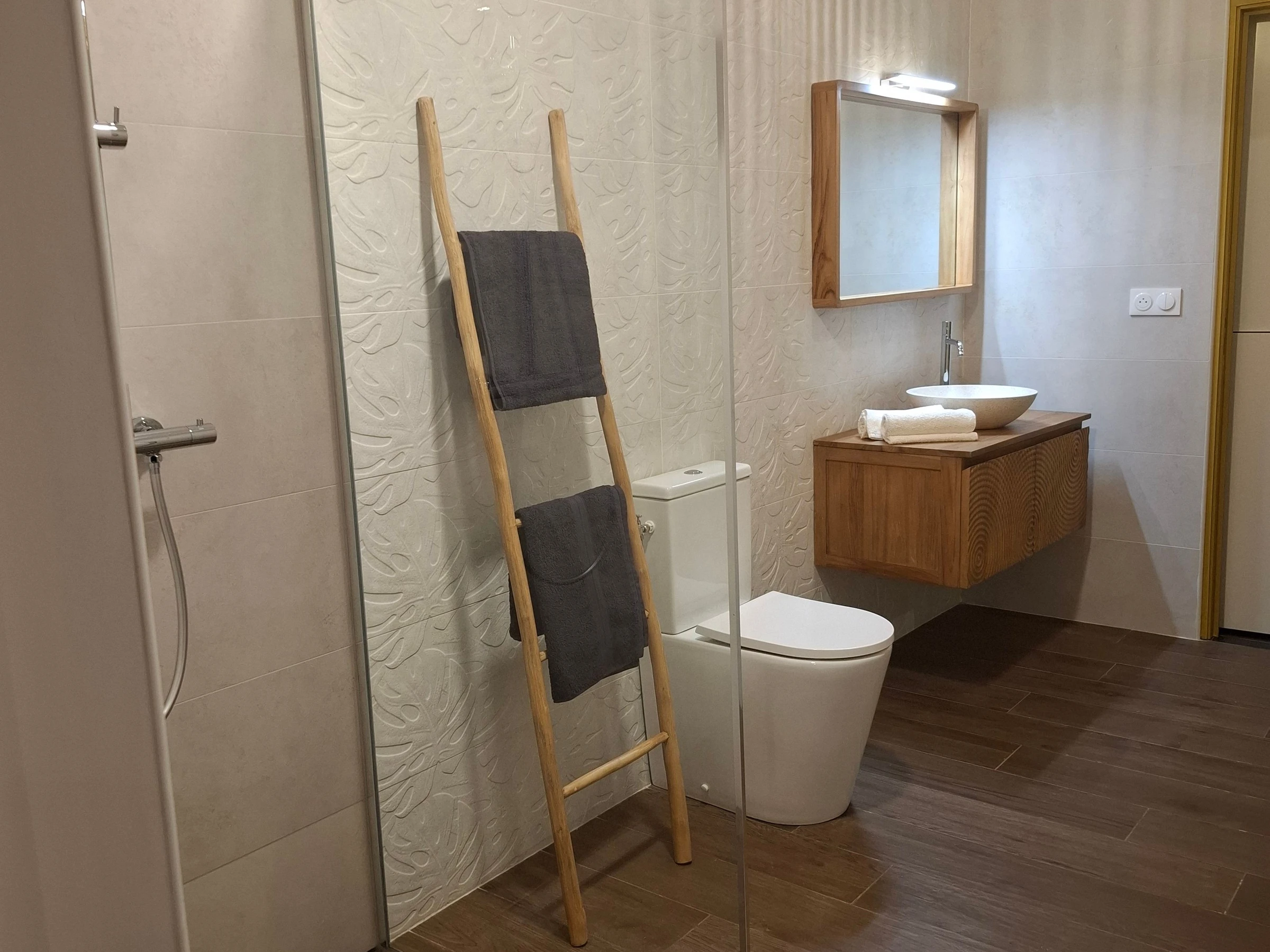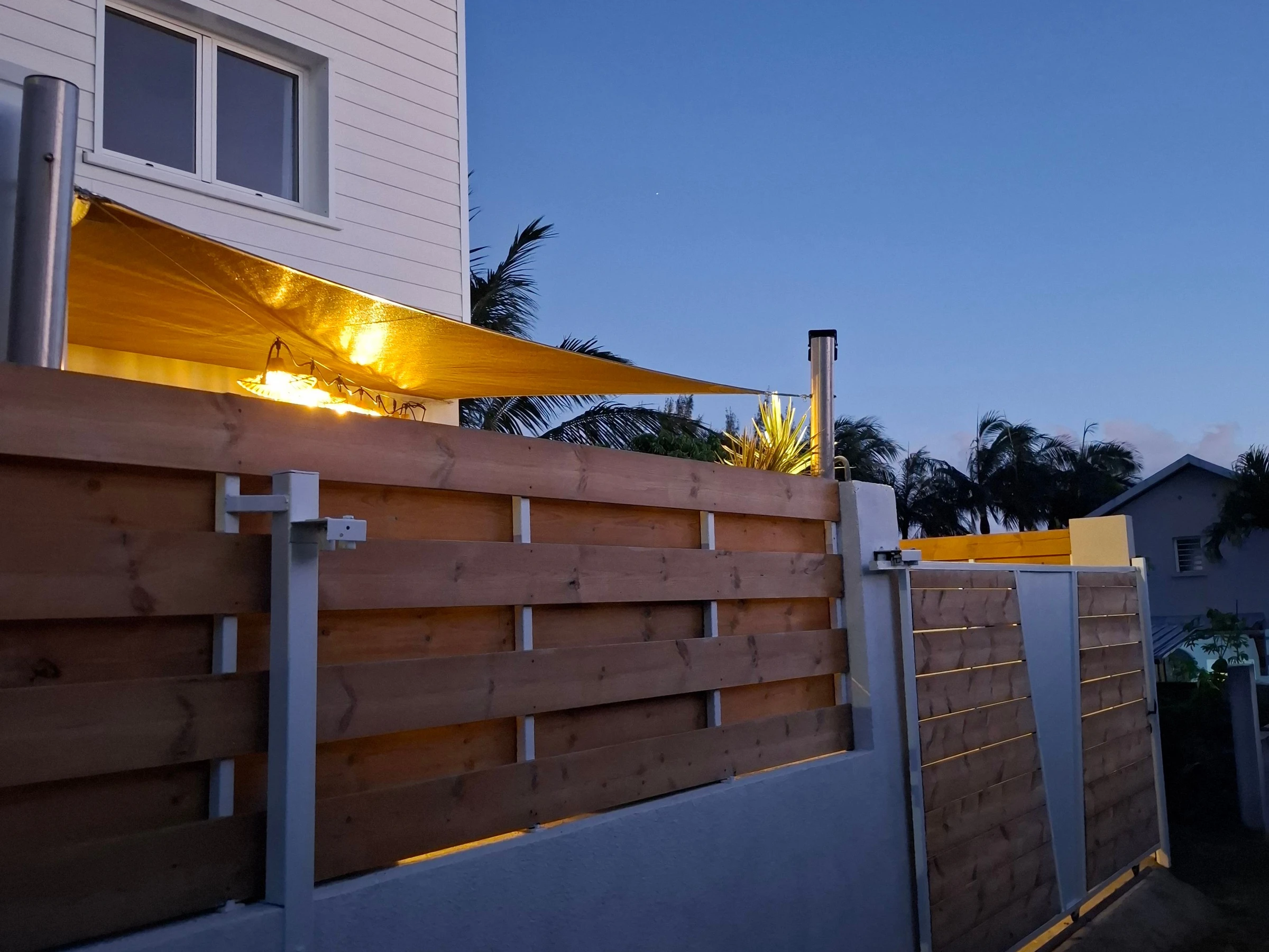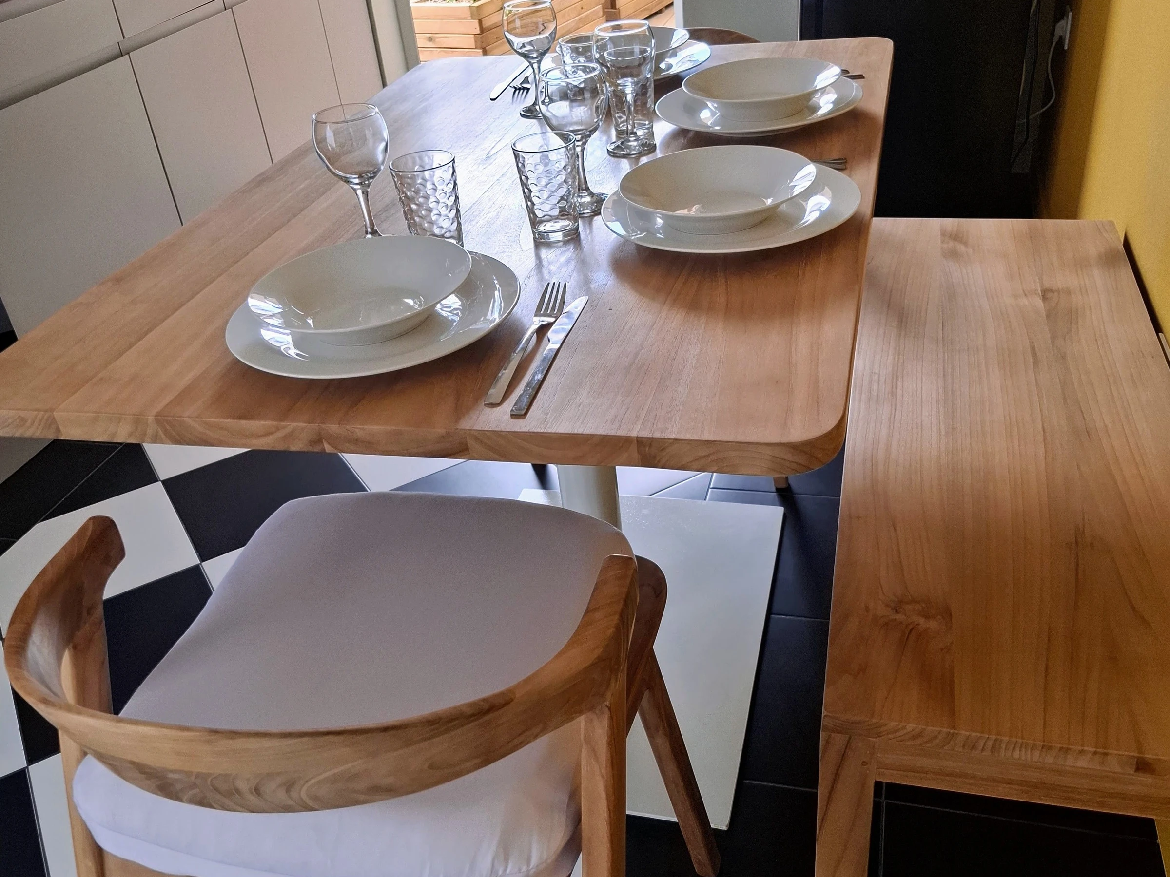 Une attention particulière a été portée aux matériaux et aux équipements, avec la présence de mobilier et d’aménagements en bois de teck, appréciés pour leur qualité, leur durabilité et leur adaptation au climat tropical. Le logement dispose également d’une connexion Wi-Fi, d’une télévision et du linge de maison, permettant de séjourner dans de bonnes conditions de confort.