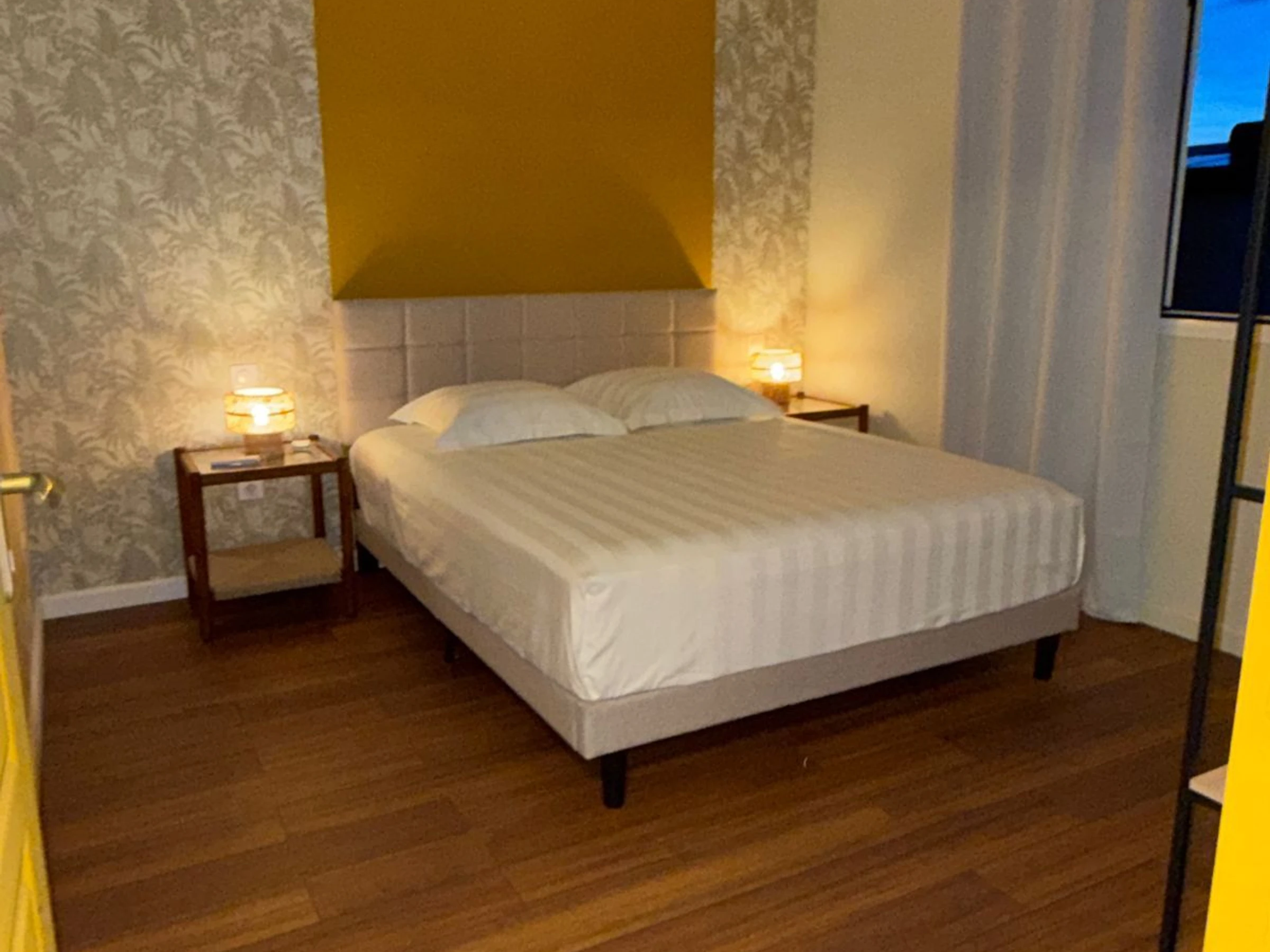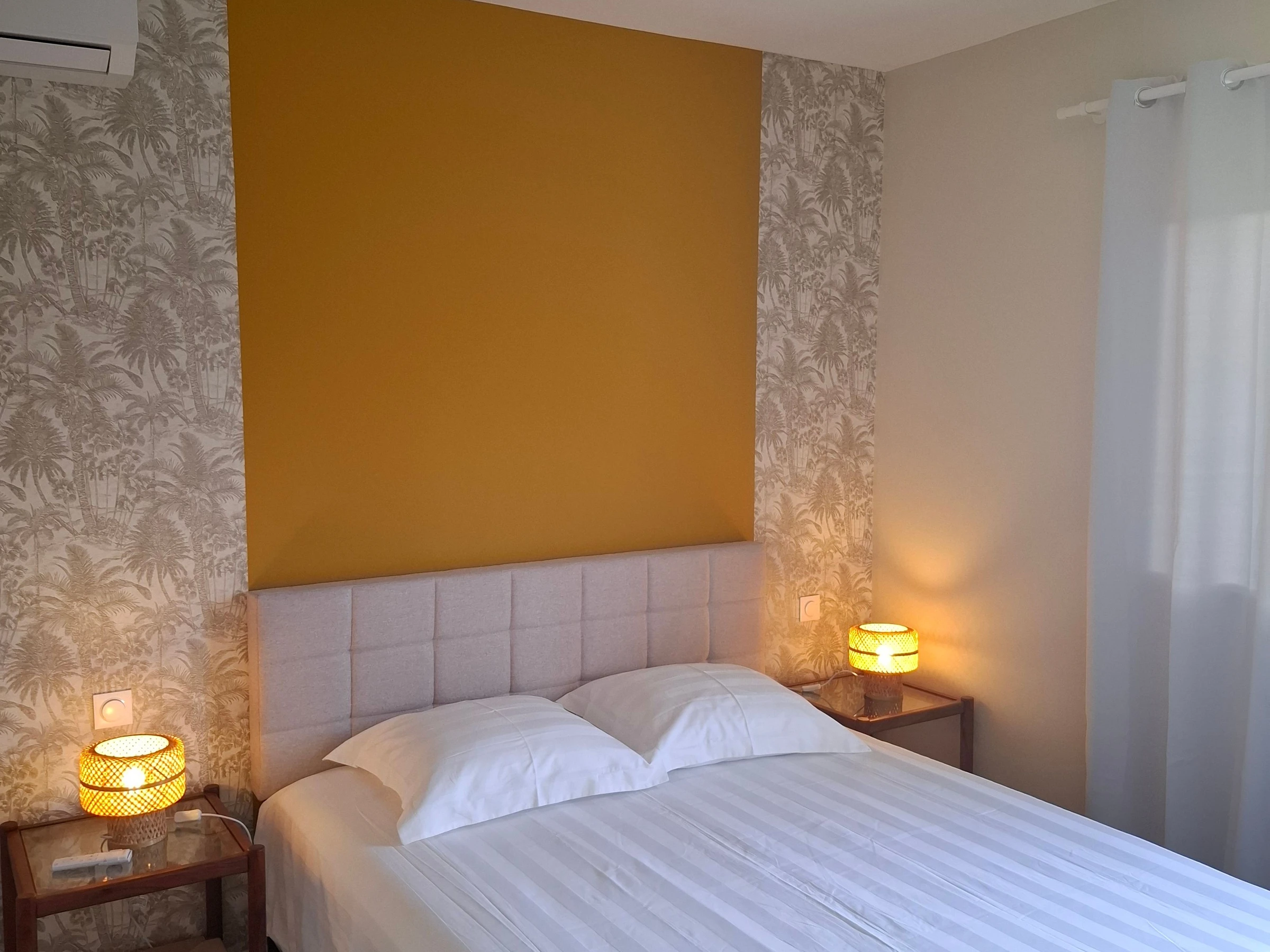 Le gîte peut accueillir jusqu’à 4 personnes. Il comprend deux chambres doubles climatisées avec rangements, un séjour, une cuisine équipée permettant de préparer les repas en toute autonomie, une salle d’eau avec douche et vasque en terrazzo, ainsi que deux WC, dont un à l’étage à proximité des chambres et un au niveau principal.