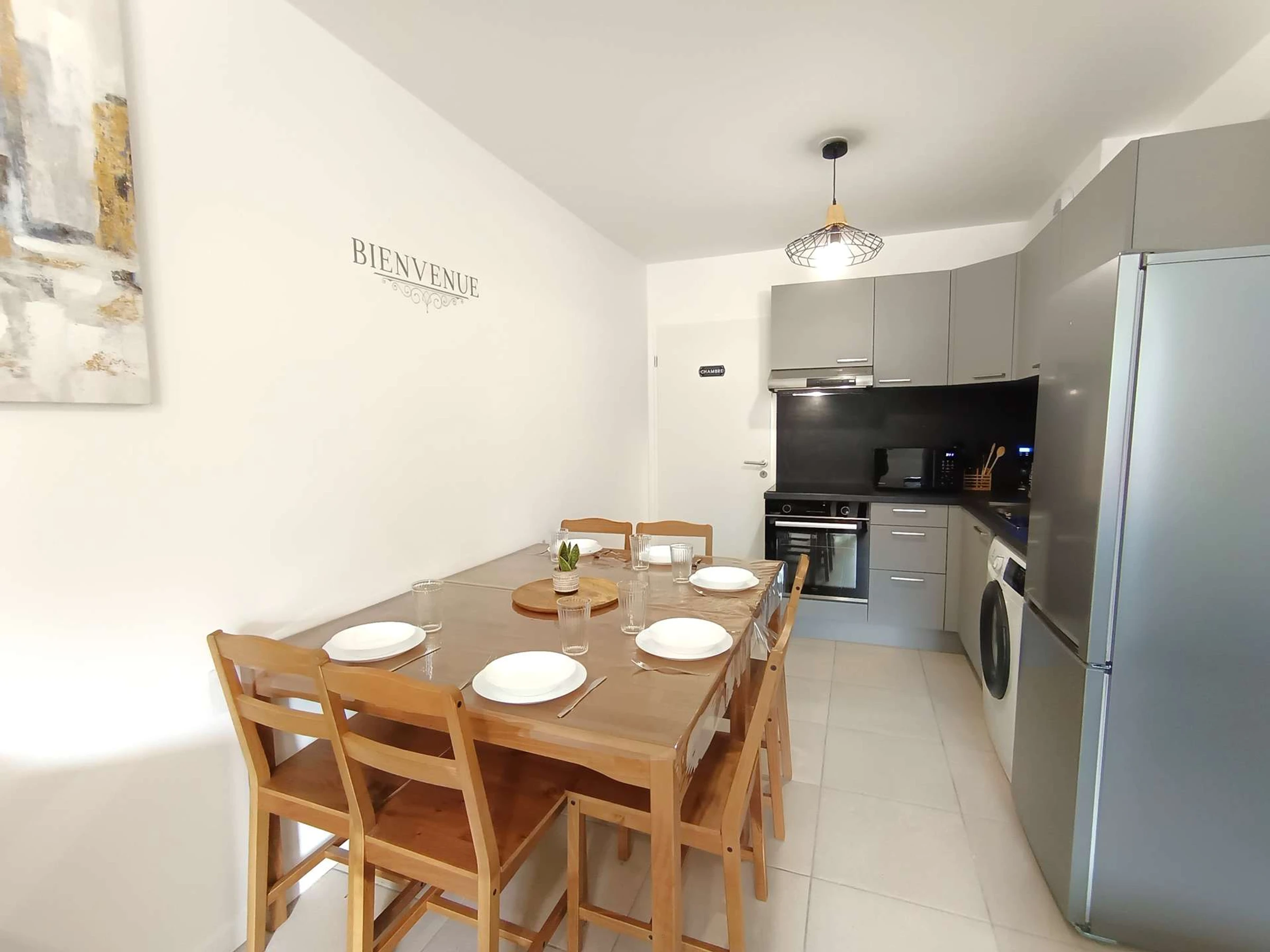 Kitchenette équipée avec plaques électriques, micro-ondes, four, cafetière électrique, grille-pain, lave-linge