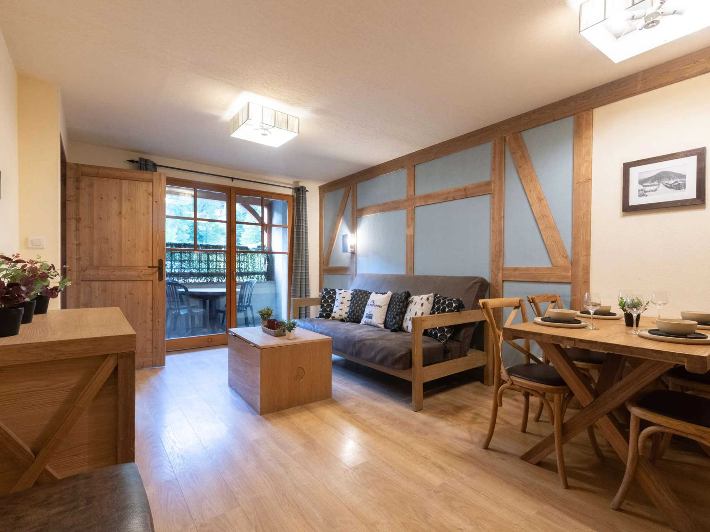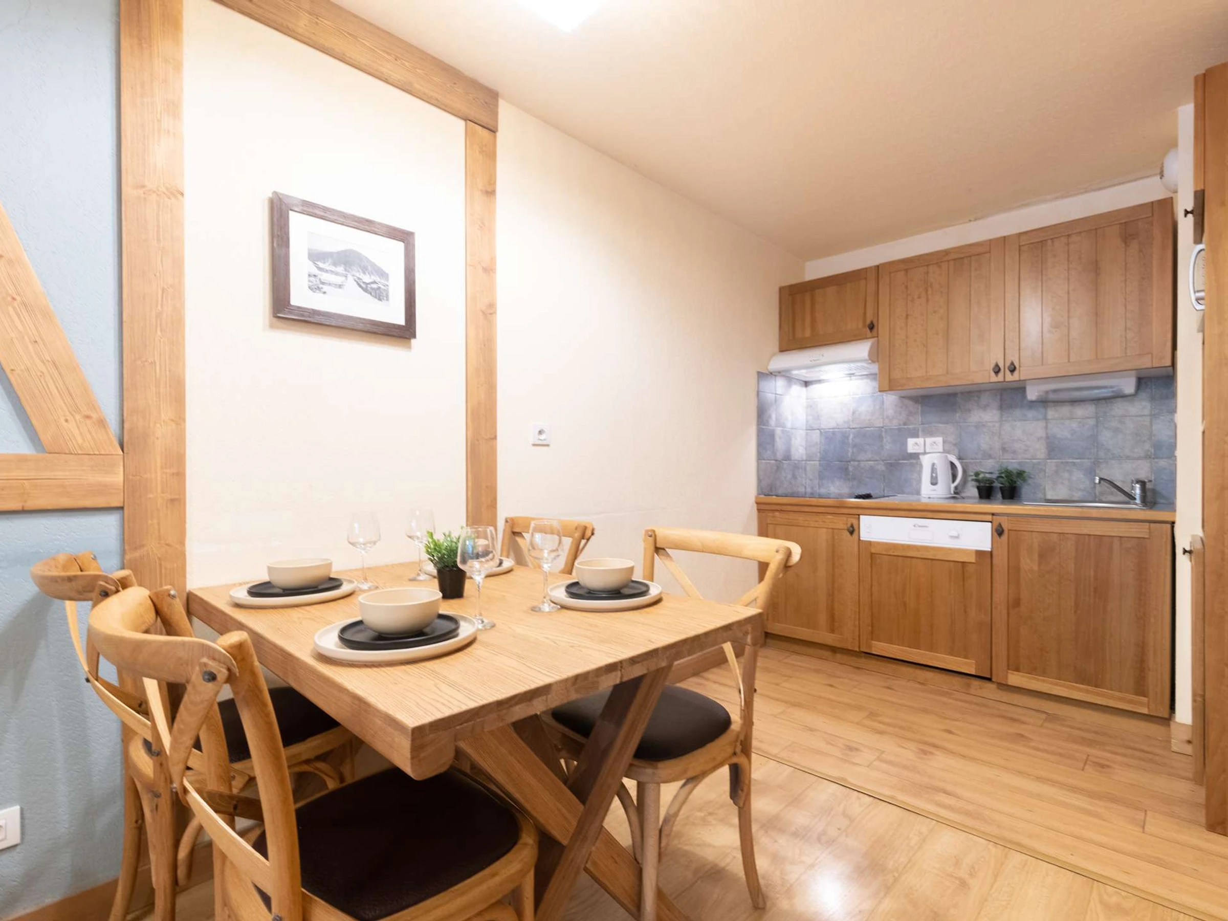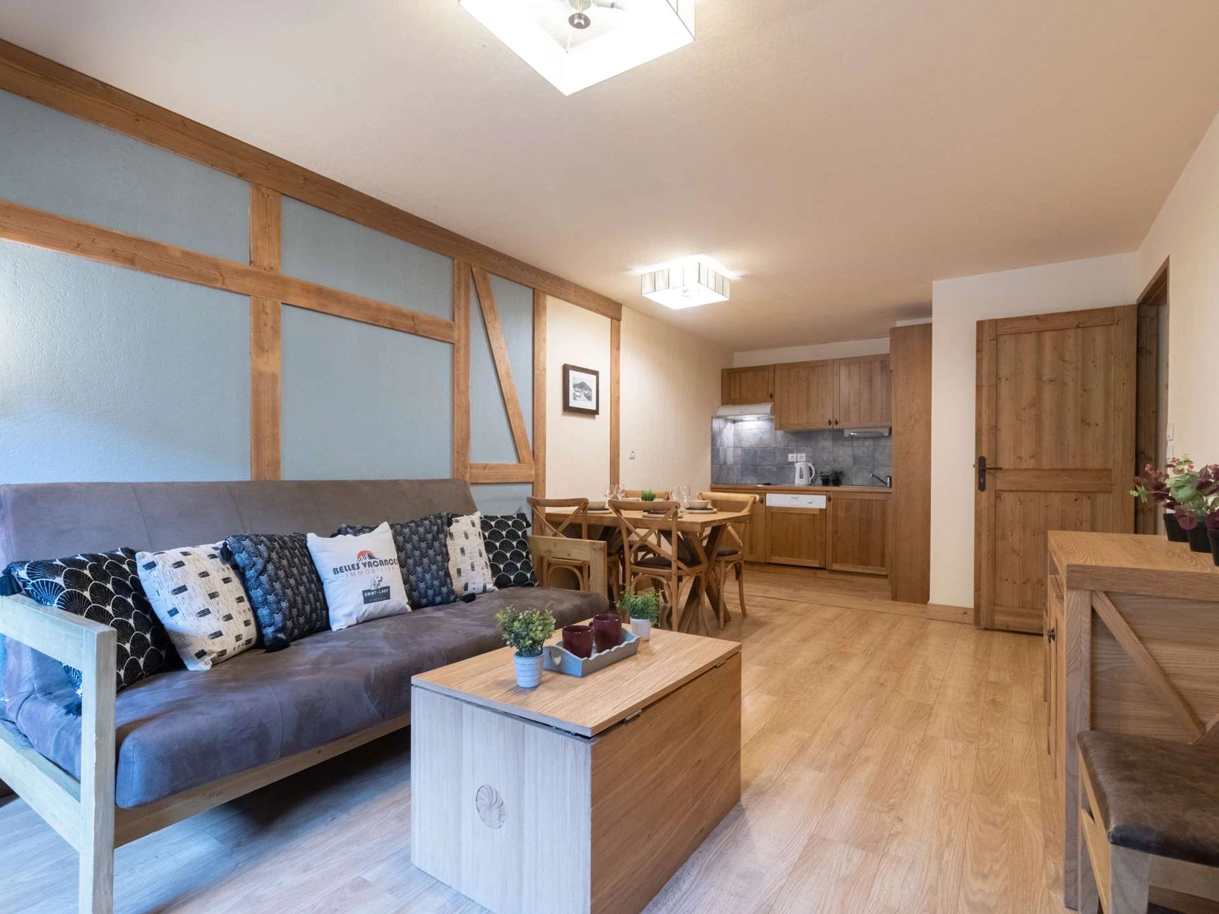 -Un séjour avec 1 canapé convertible 2 places et TV , ouvert sur une Cuisine équipée (plaques vitrocéramique, micro-ondes, lave-vaisselle)