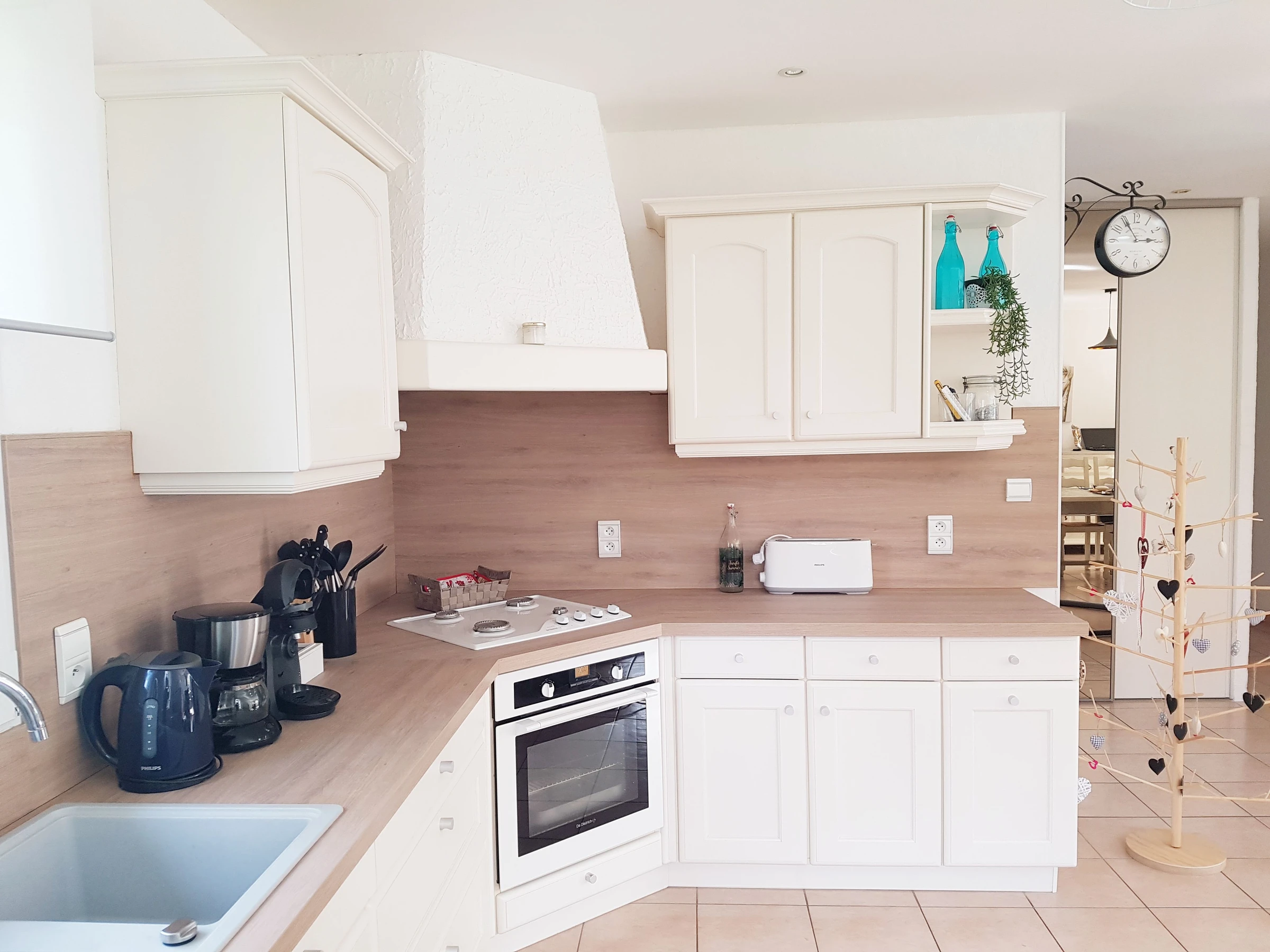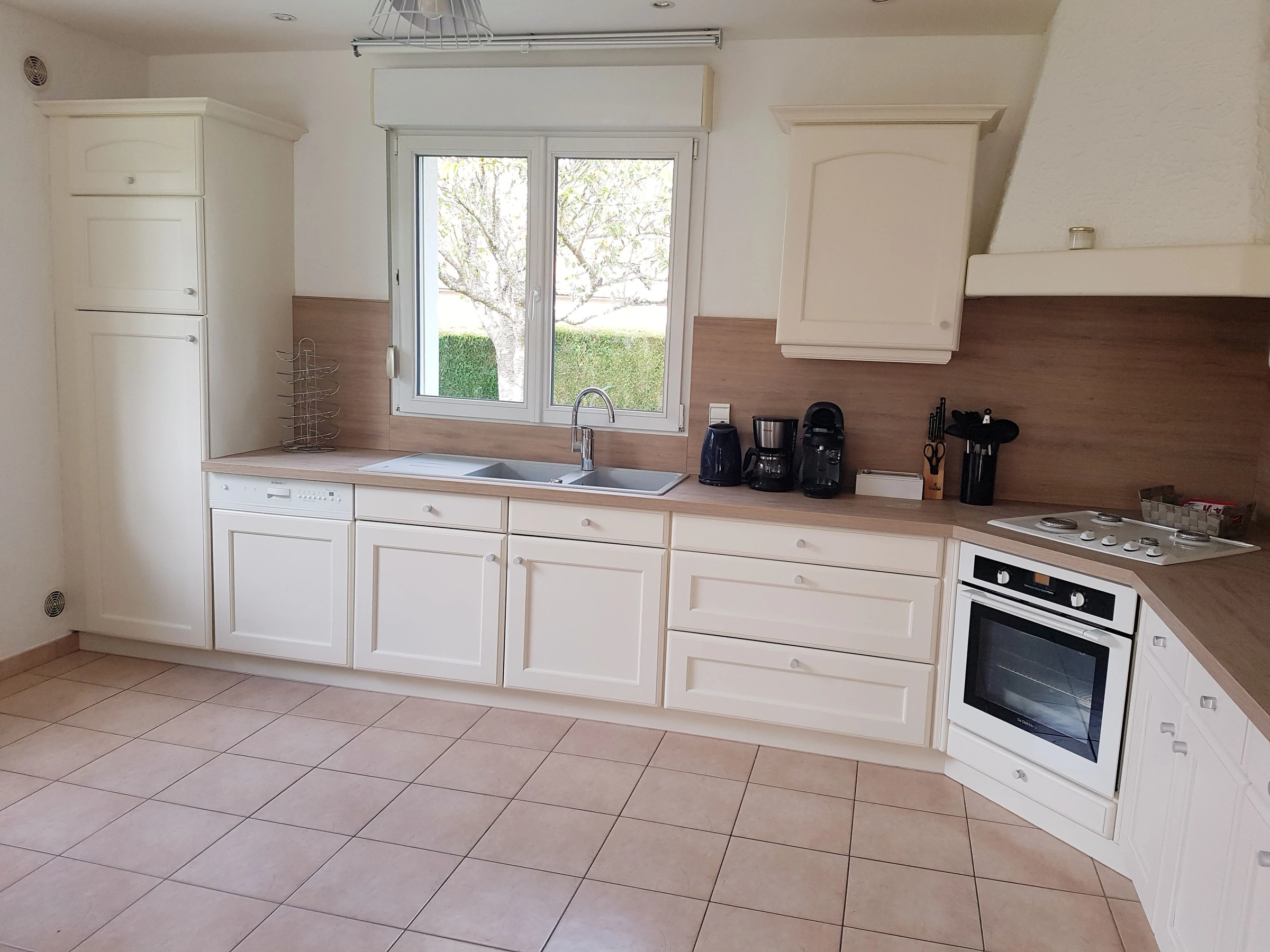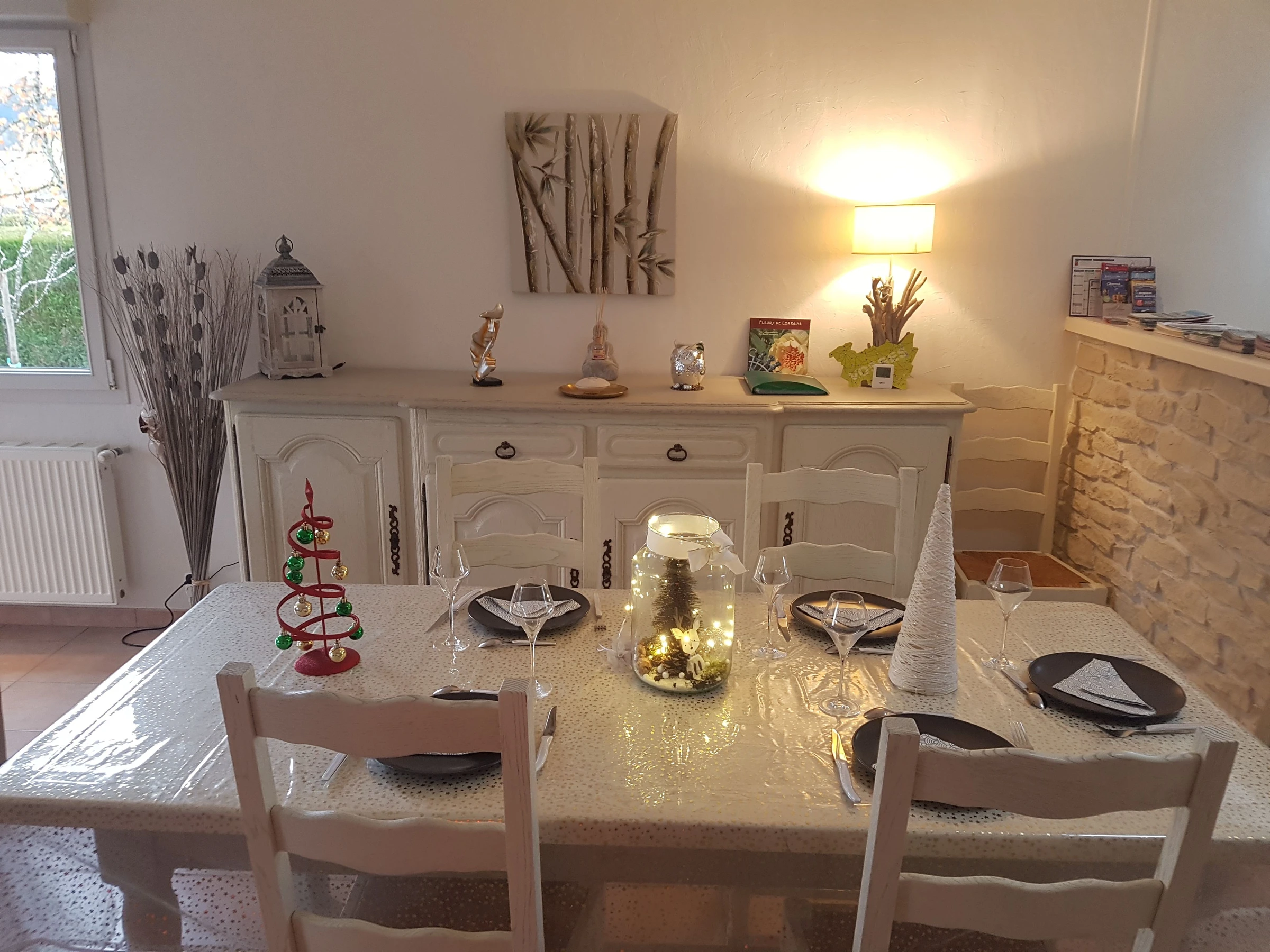 - Cuisine intégrée ouverte sur séjour, espace salon avec TV écran plat ( 140 cm), poêle à bois.