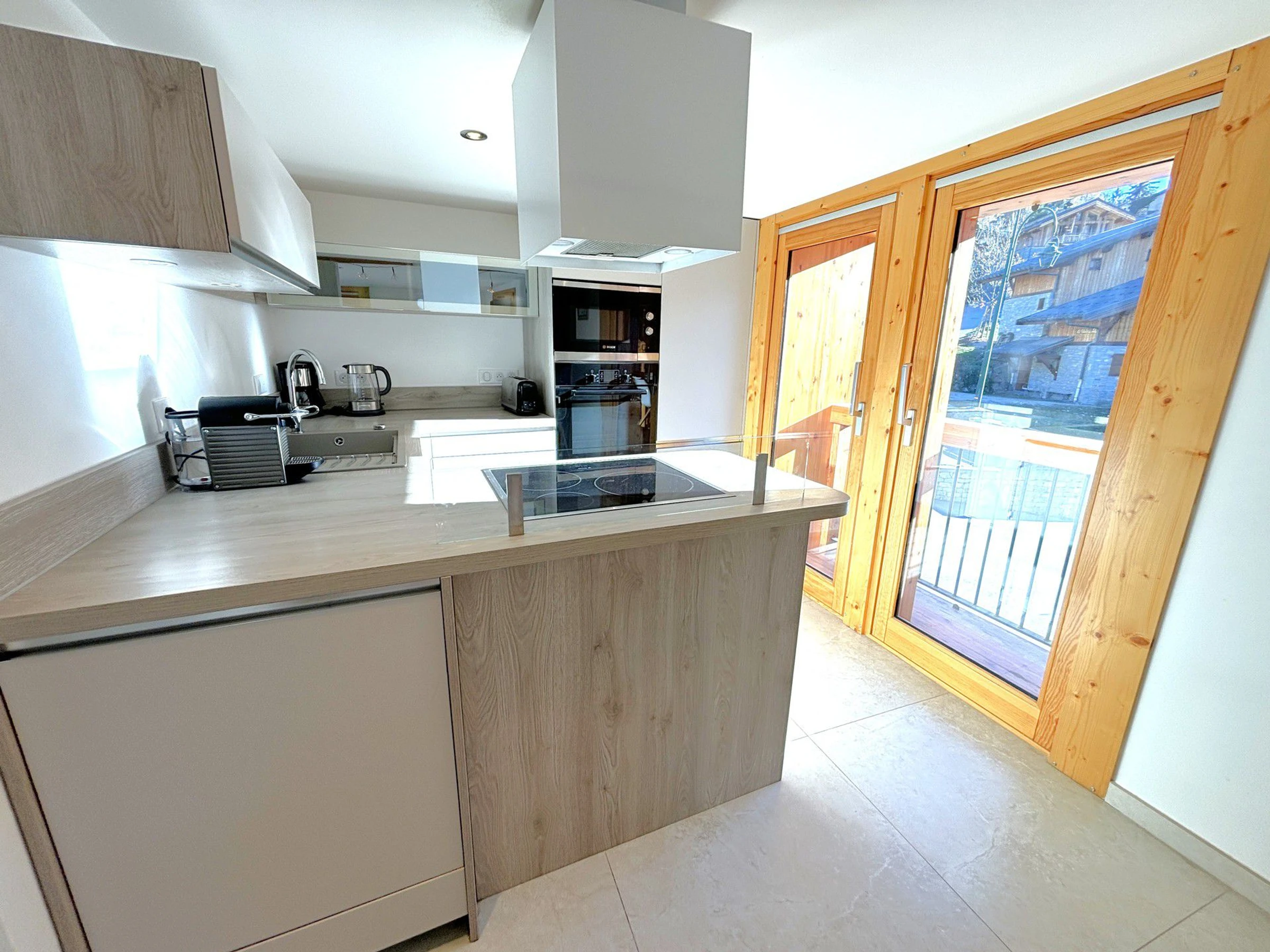 Cuisine ouverte sur le séjour : plaques de cuisson à induction, four, micro-ondes, réfrigérateur, congélateur, lave-vaisselle, cafetière, bouilloire, grille-pain, appareil à fondue, appareil à raclette