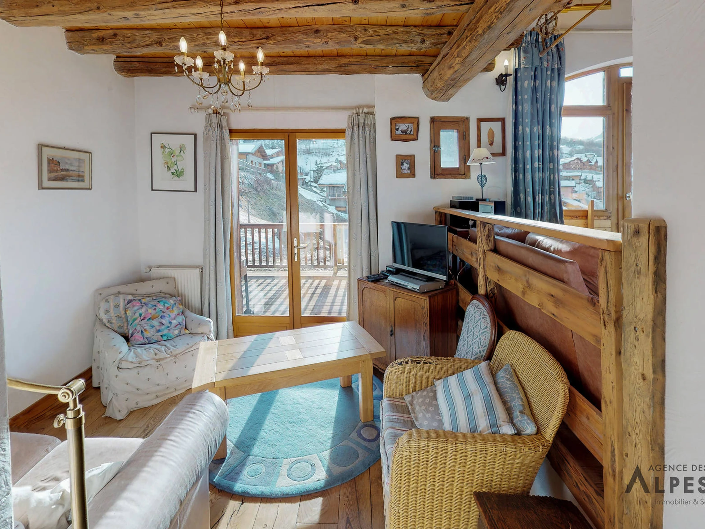 Coin salon et espace repas : fauteuils, table basse, télévision, lecteur DVD, chaîne HiFi, poêle à bois d'agrément (1 sac de bois fourni), accès terrasse avec une vue dégagée sur la montagne et le village