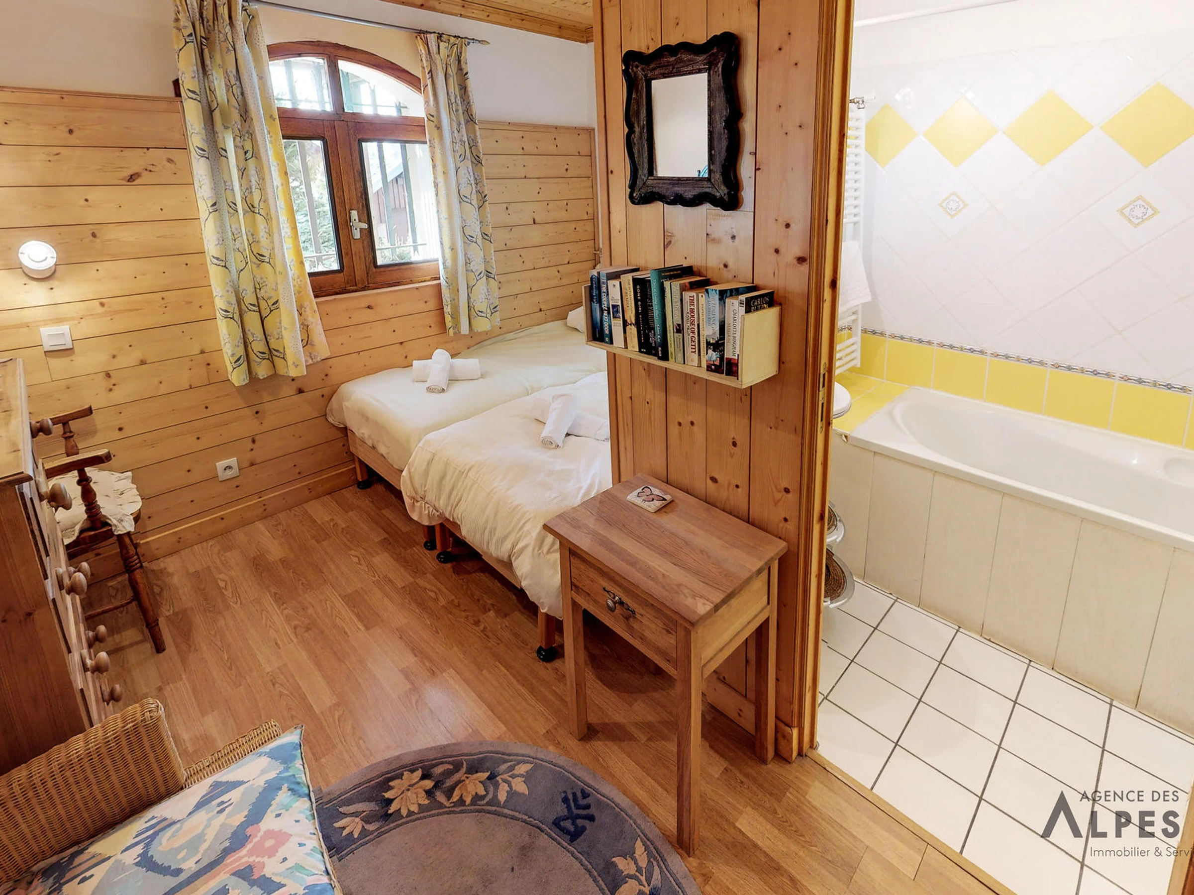 Chambre "Bouquetin" : lits simples jumellés (2x90 cm), commode, salle de bains attenante (lavabo, baignoire, toilettes, sèche-serviettes),