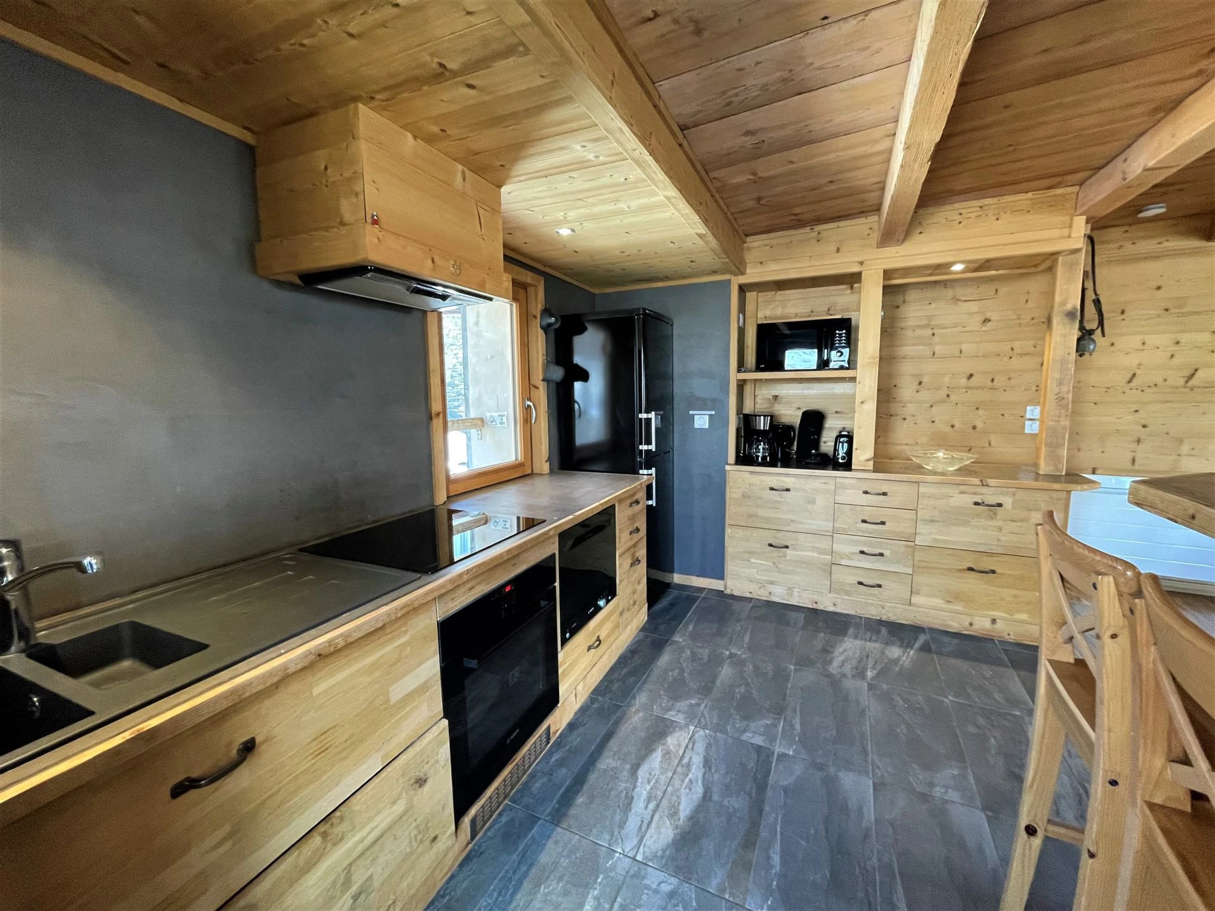 Cuisine intégrée ouverte sur le séjour : plaques de cuisson induction (x3), hotte, four, micro-ondes, réfrigérateur, petit congélateur, lave-vaisselle (6 couverts), cafetière, machine à dosettes Senséo, bouilloire, grille-pain, appareil à raclette, friteuse, cocotte-minute