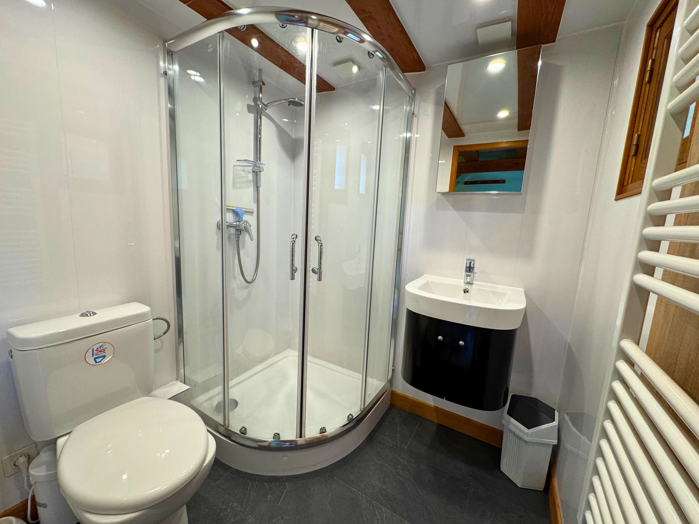 Salle de bains : lavabo, douche, sèche-serviettes, toilettes