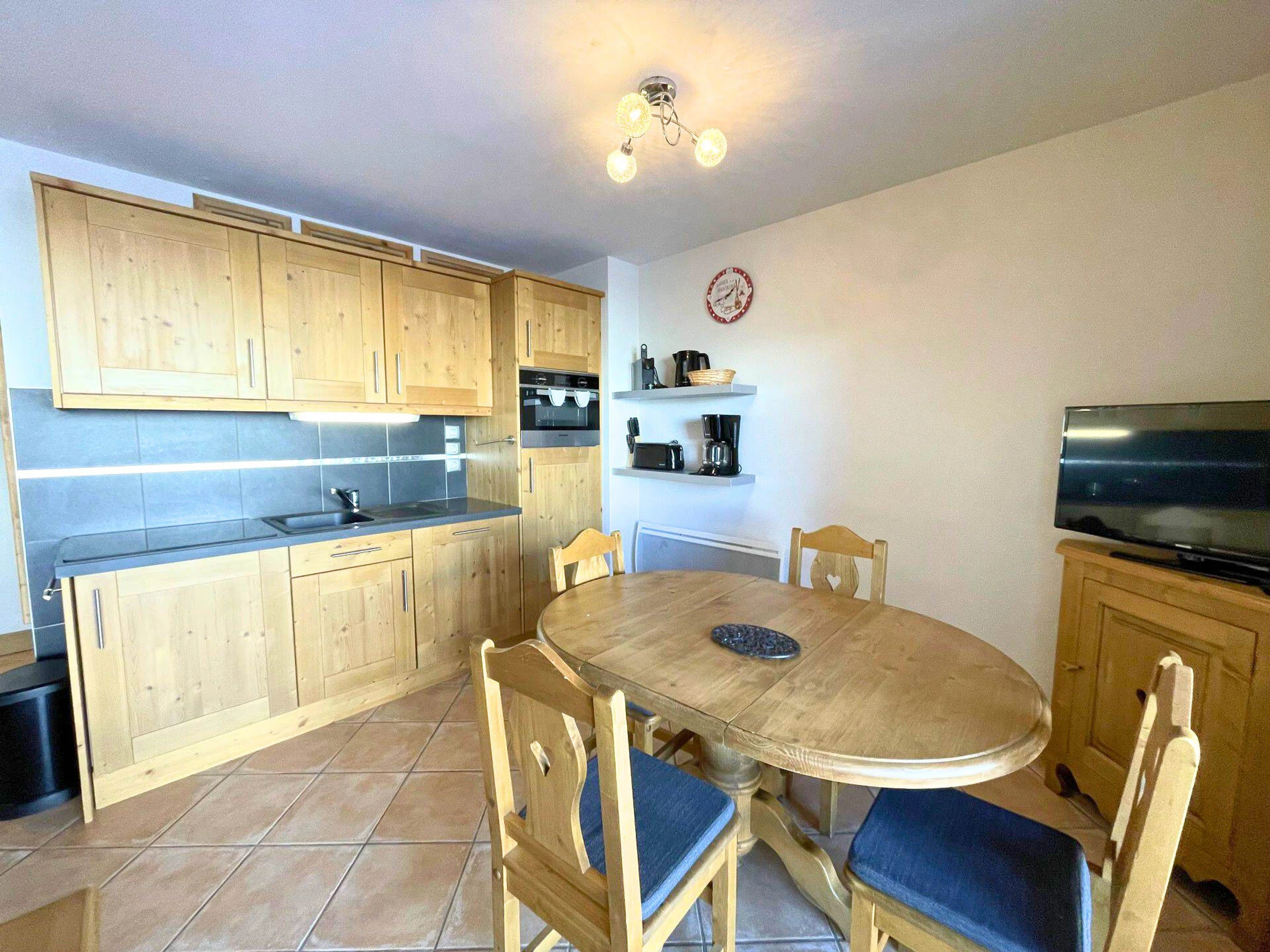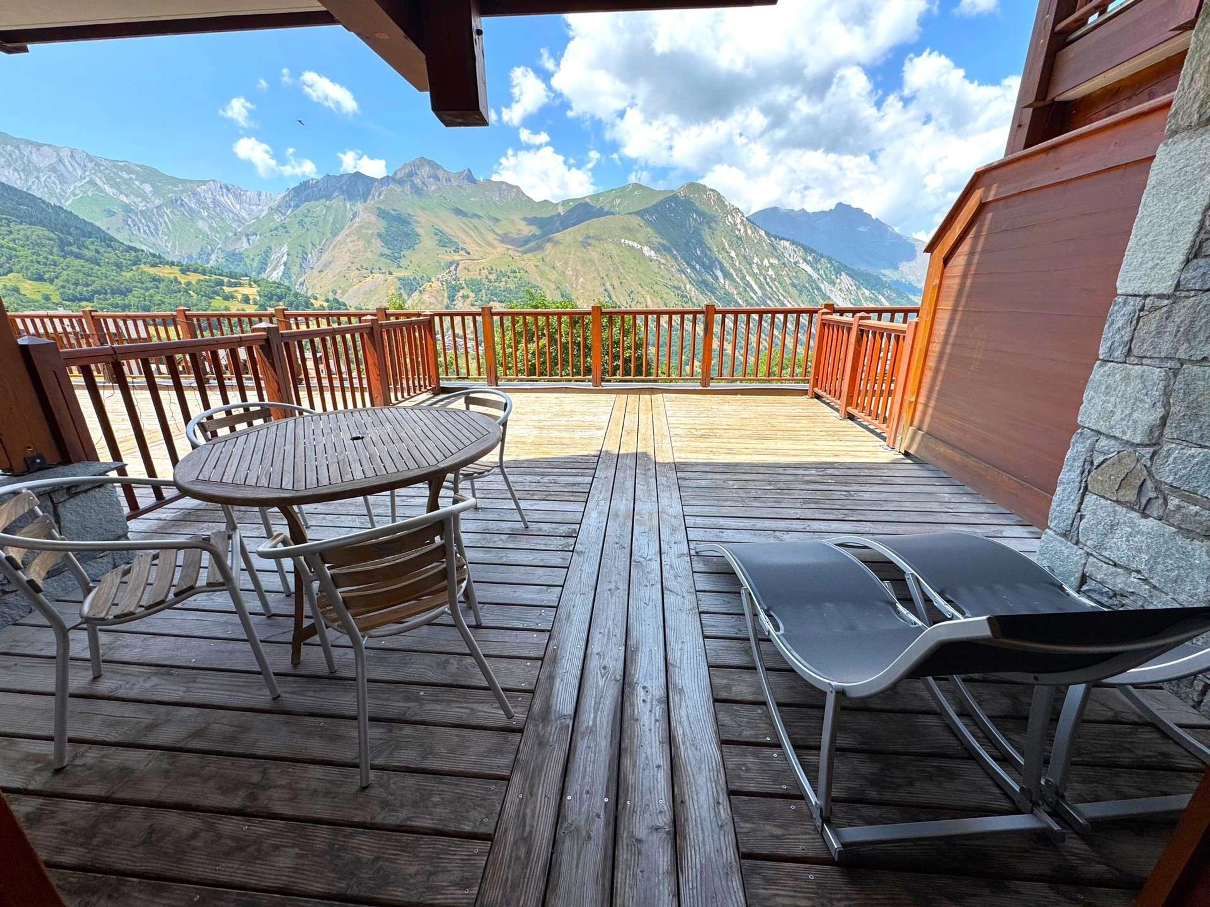 Chalet Adèle (n° 3) 2 pièces cabine pour 4 personnes, 37m², 1er étage côté terrasse (niveau 0 par ascenseur), exposé sud, terrasse de 28 m², située aux pieds des pistes