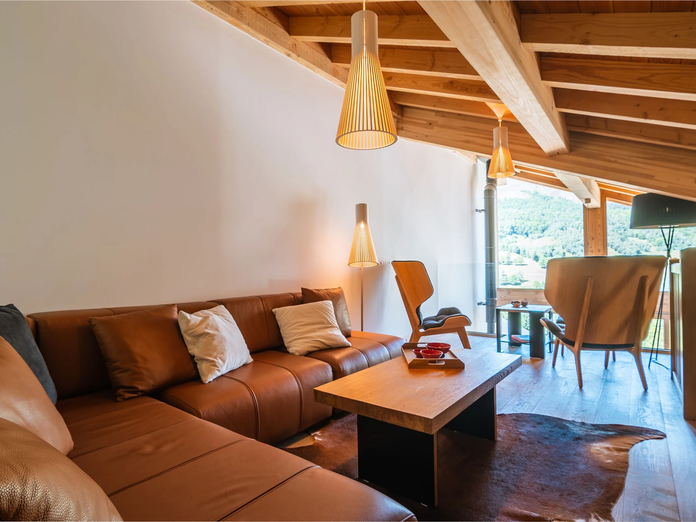 Coin repas lumineux avec vue magnifique sur les montagnes.
