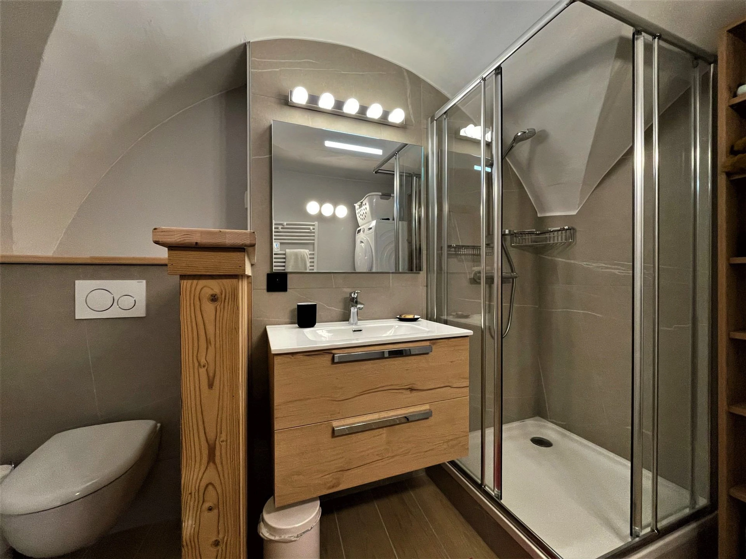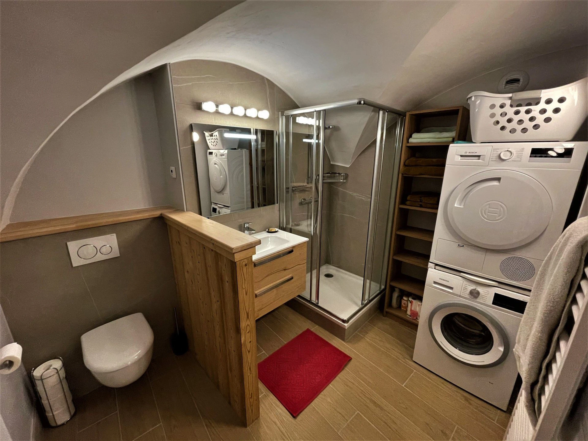 Salle de bain: lavabo, douche, sèche-serviettes, toilettes, sèche-cheveux
