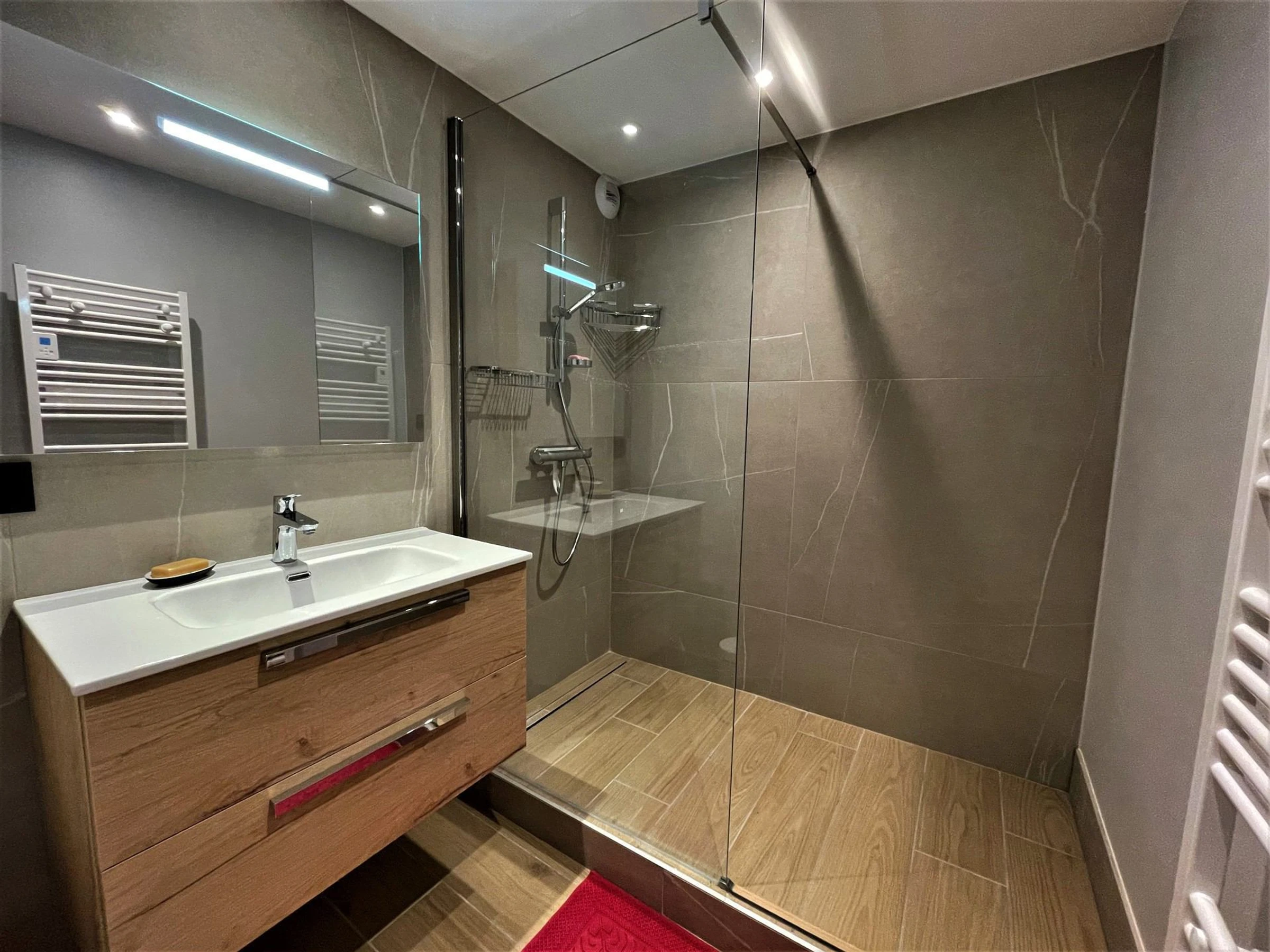 Salle de bain: lavabo, douche à l'italienne, sèche-serviettes, sèche-cheveux