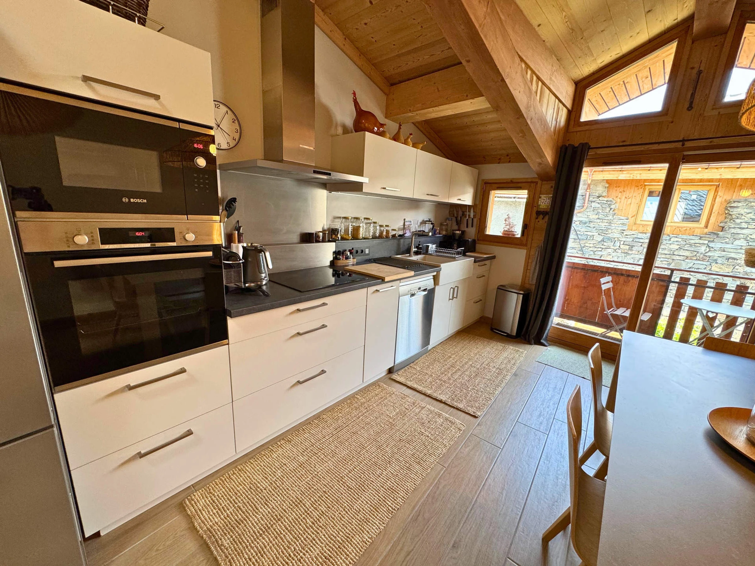 Pièce à vivre avec cuisine ouverte : 4 plaques à induction, four, four micro-ondes, réfrigérateur avec freezer, hotte, bouilloire, grille-pain, lave-vaisselle, cafetière Nespresso, cafetière à filtres, appareil à raclette, jacobine avec porte fenêtre sur balcon