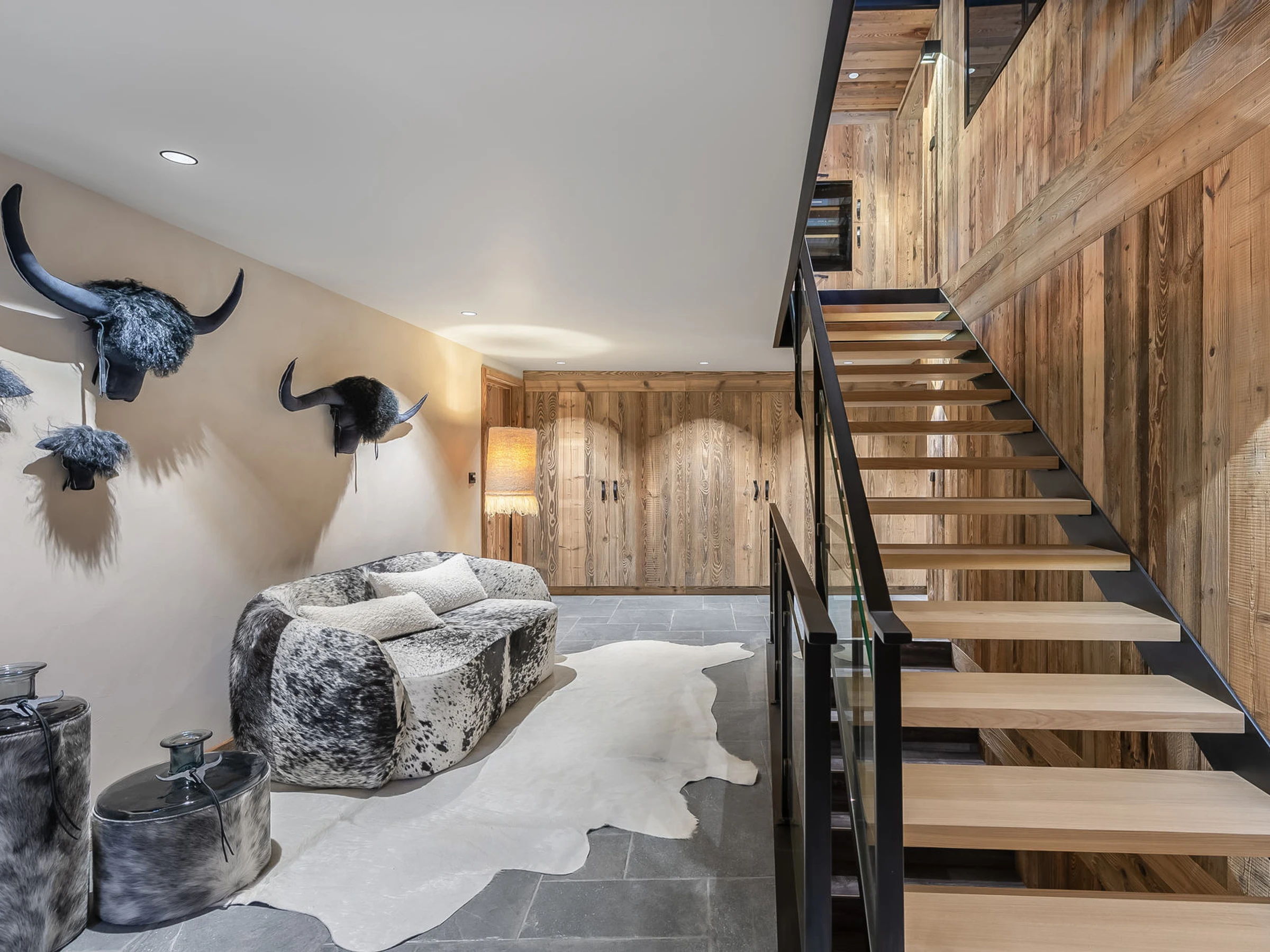 Pouvant accueillir jusqu'à 14 personnes, le chalet dispose d'une piscine et d'un jacuzzi et est disposé ainsi: