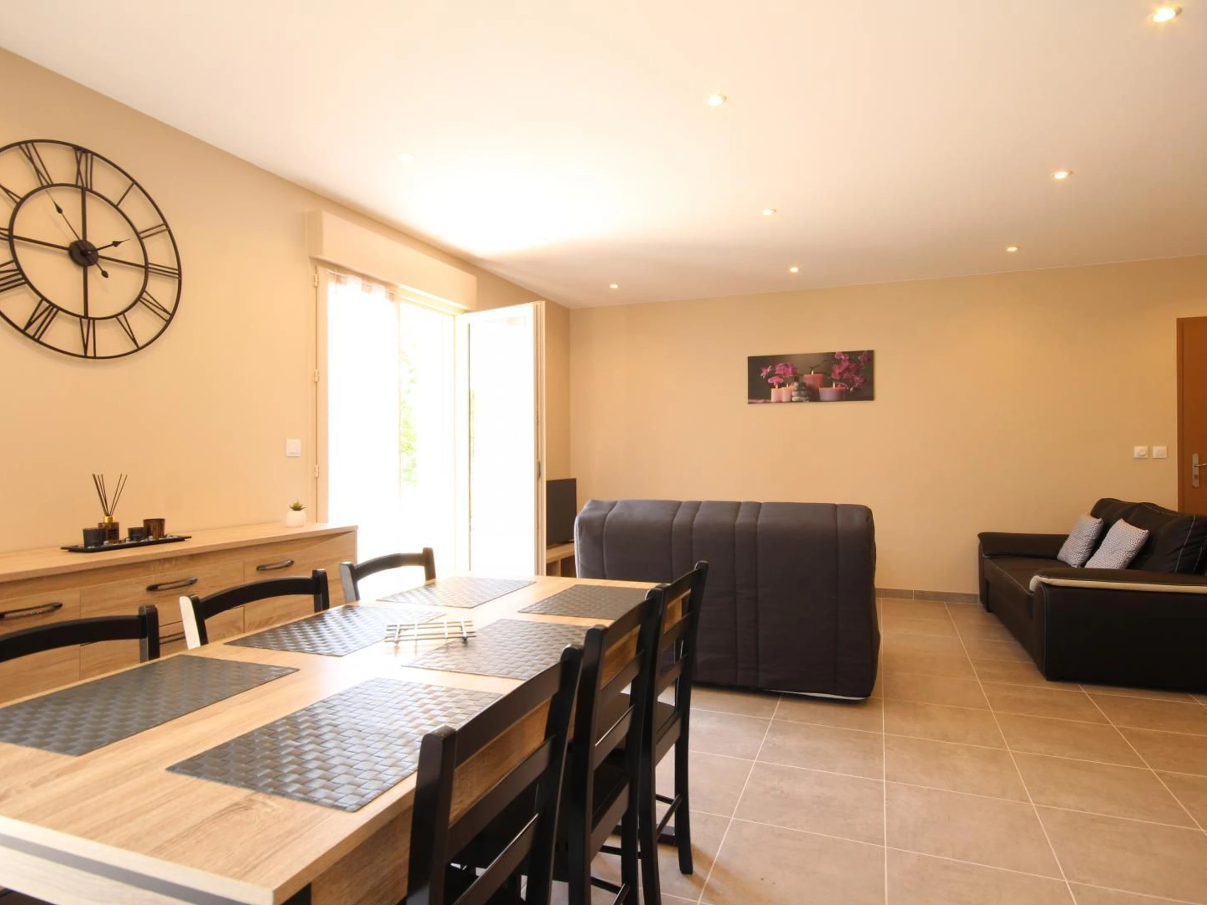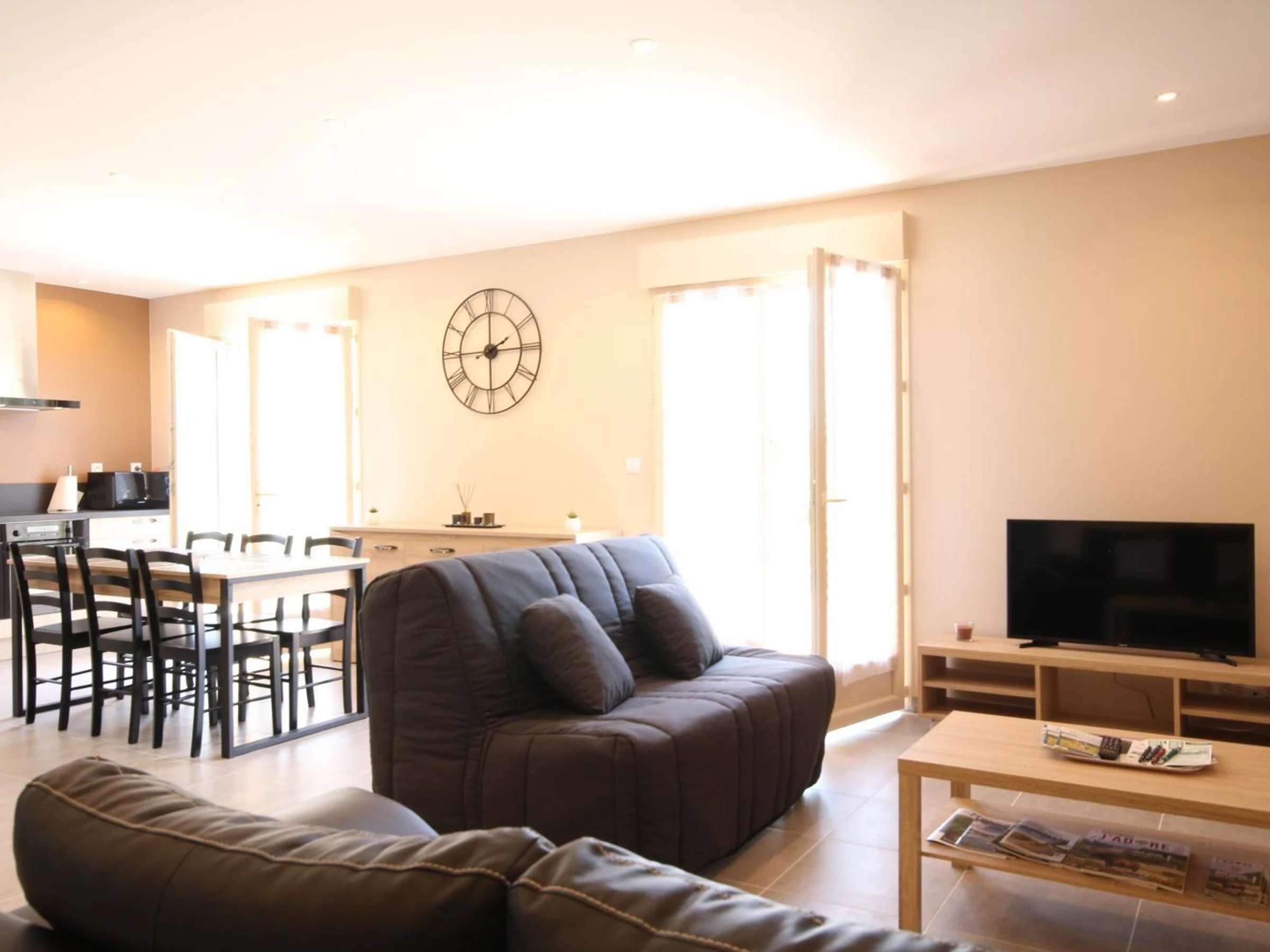 Grand séjour lumineux avec cuisine intégrée ouverte, salle à manger et salon avec TV écran plat, WIFI et canapé convertible (2 couchages d'appoint possibles en supplément).