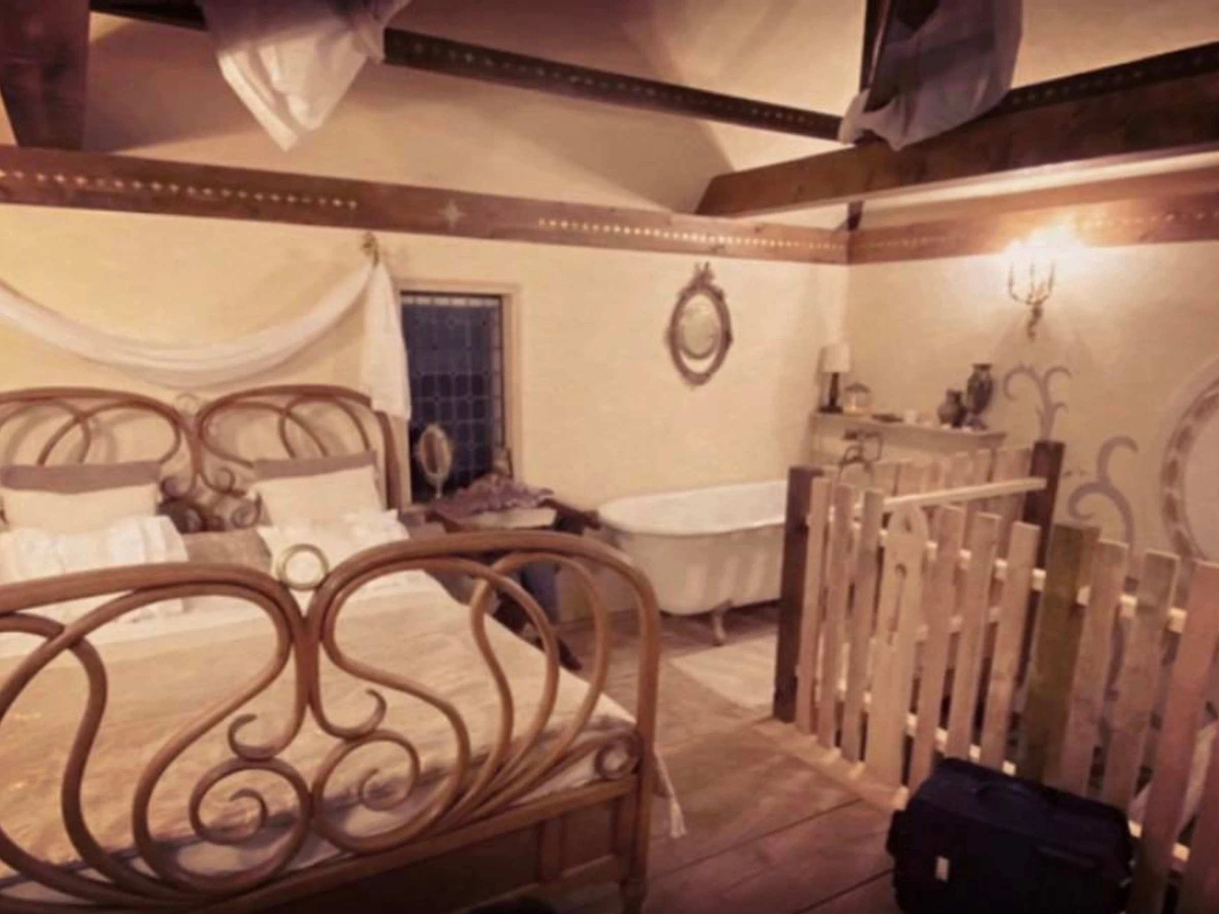 L’accès à la chambre se fait par un escalier en colimaçon. Poêle à bois, chauffage électrique et baignoire.