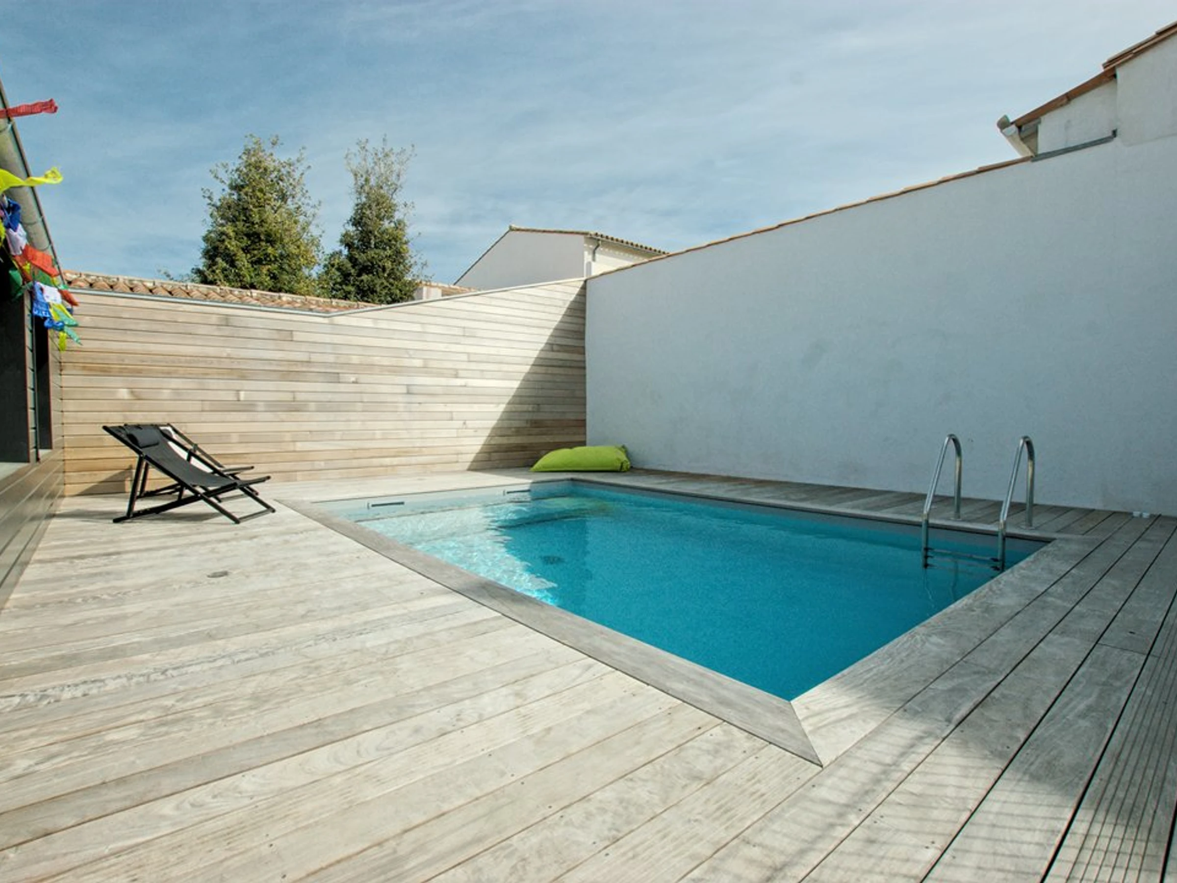 A l'extérieur, le jardin comprend une partie piscine chauffée (3.50 x 5.50m), en eau salée avec terrasse bois, une cour avec terrasse, un préau avec une cheminée, un emplacement pour garer un ou deux véhicules.