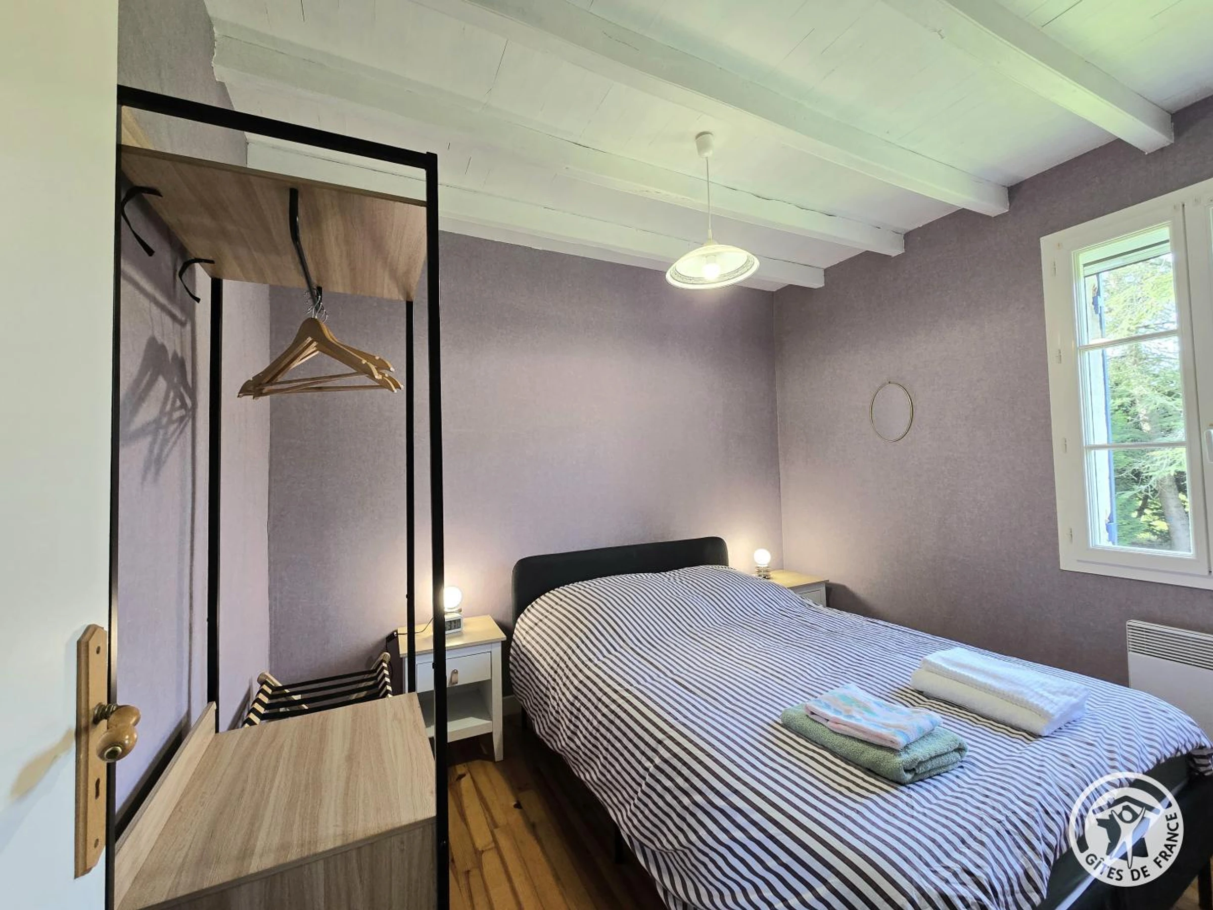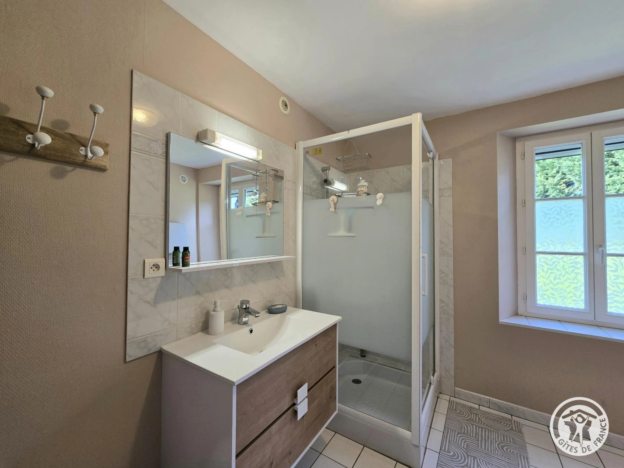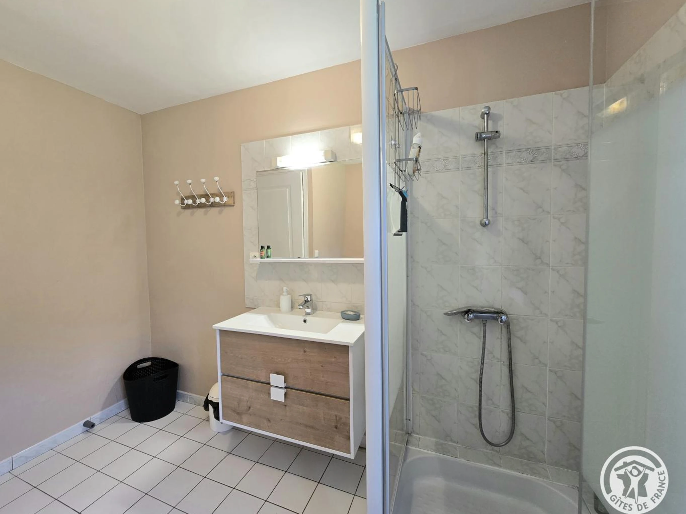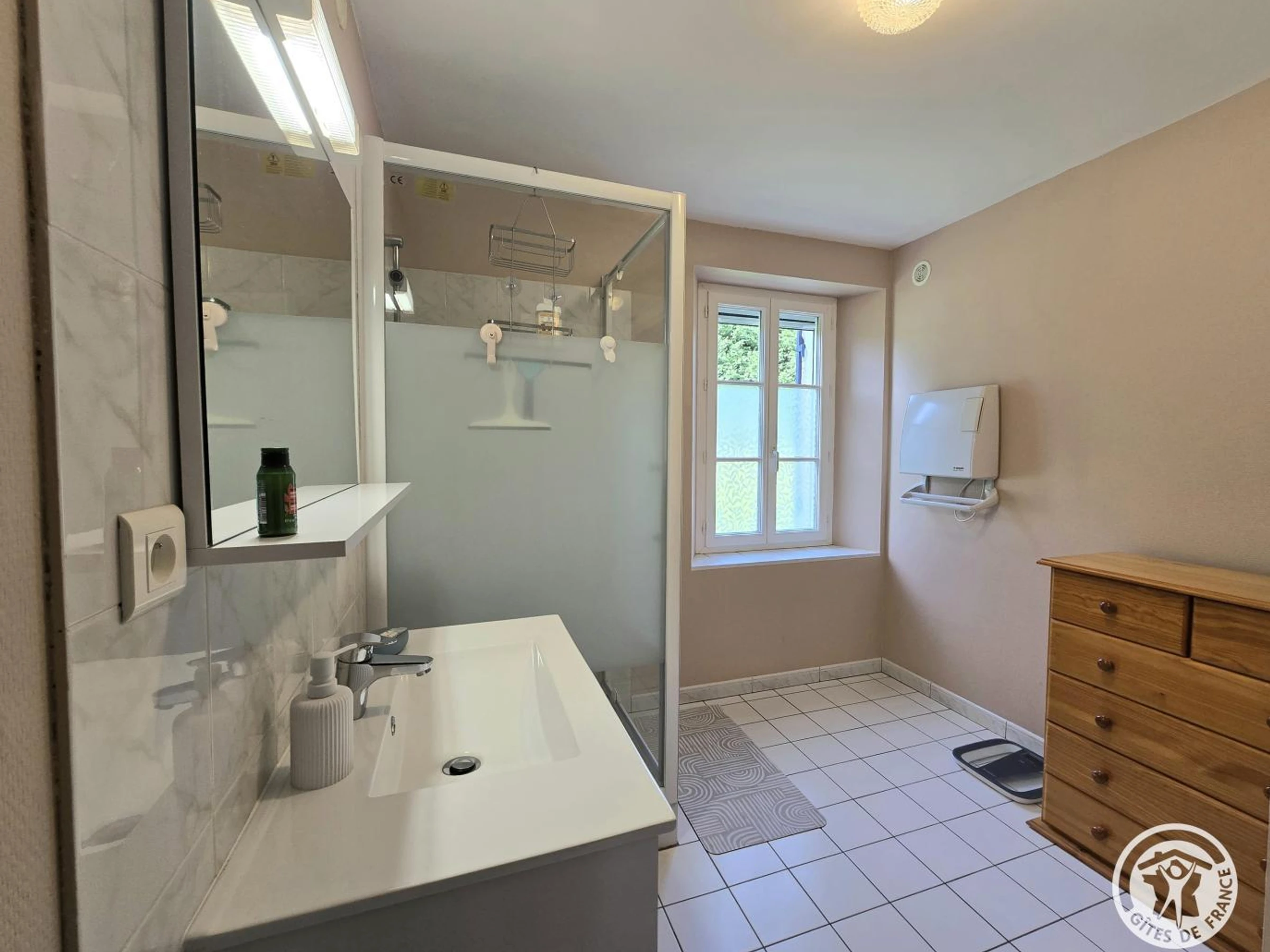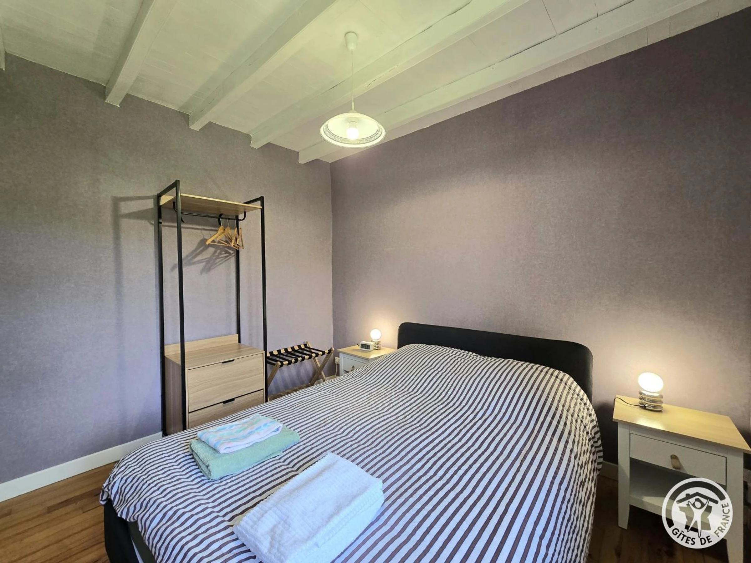 Au rez-de-chaussée, une chambre avec un lit 140, portant et porte-valise. Salle d'eau avec cabine de douche. WC indépendant.