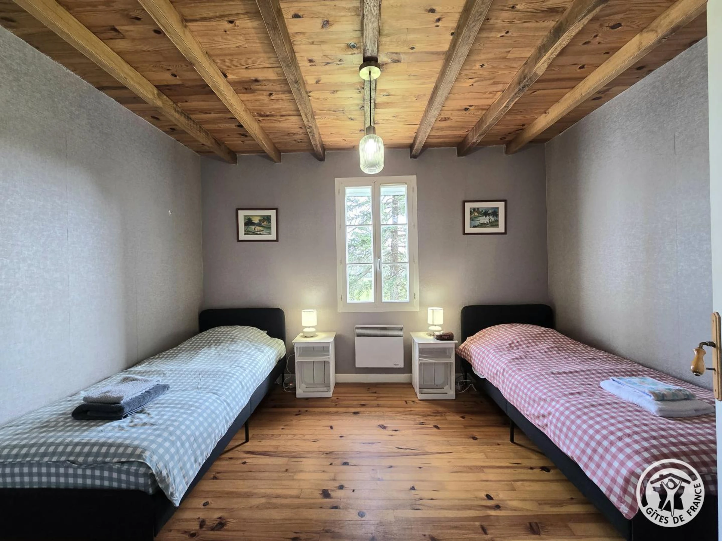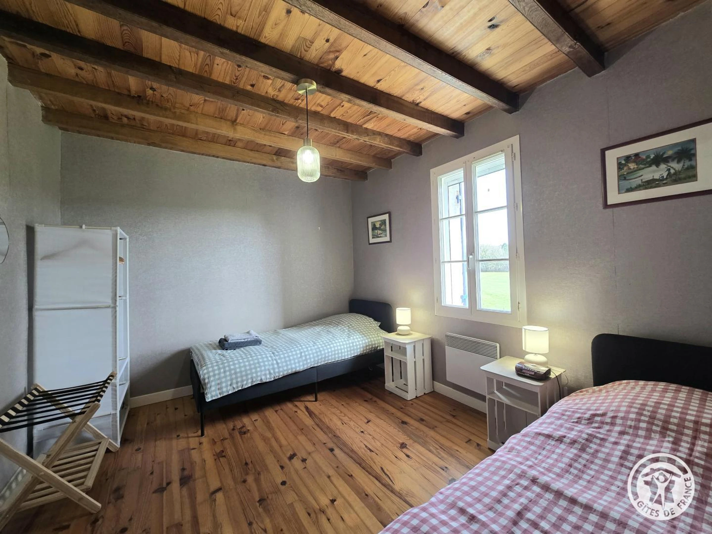 À l'étage, deux chambres supplémentaires avec un lit 140 et deux lits 90. WC indépendant avec lave-mains.