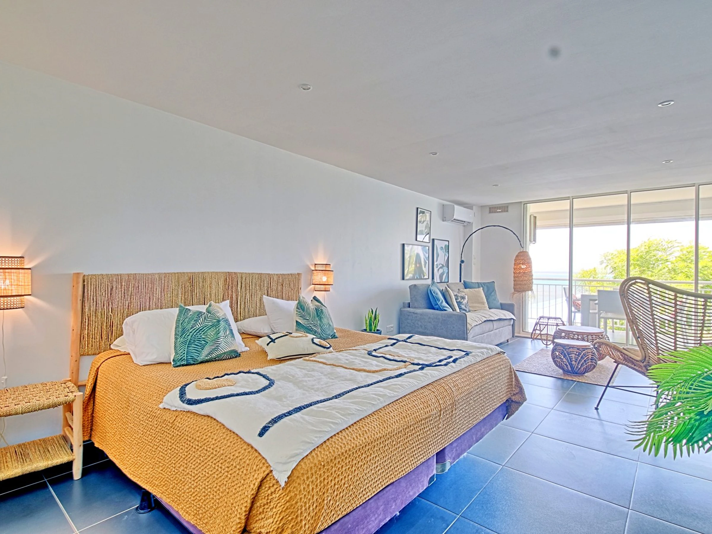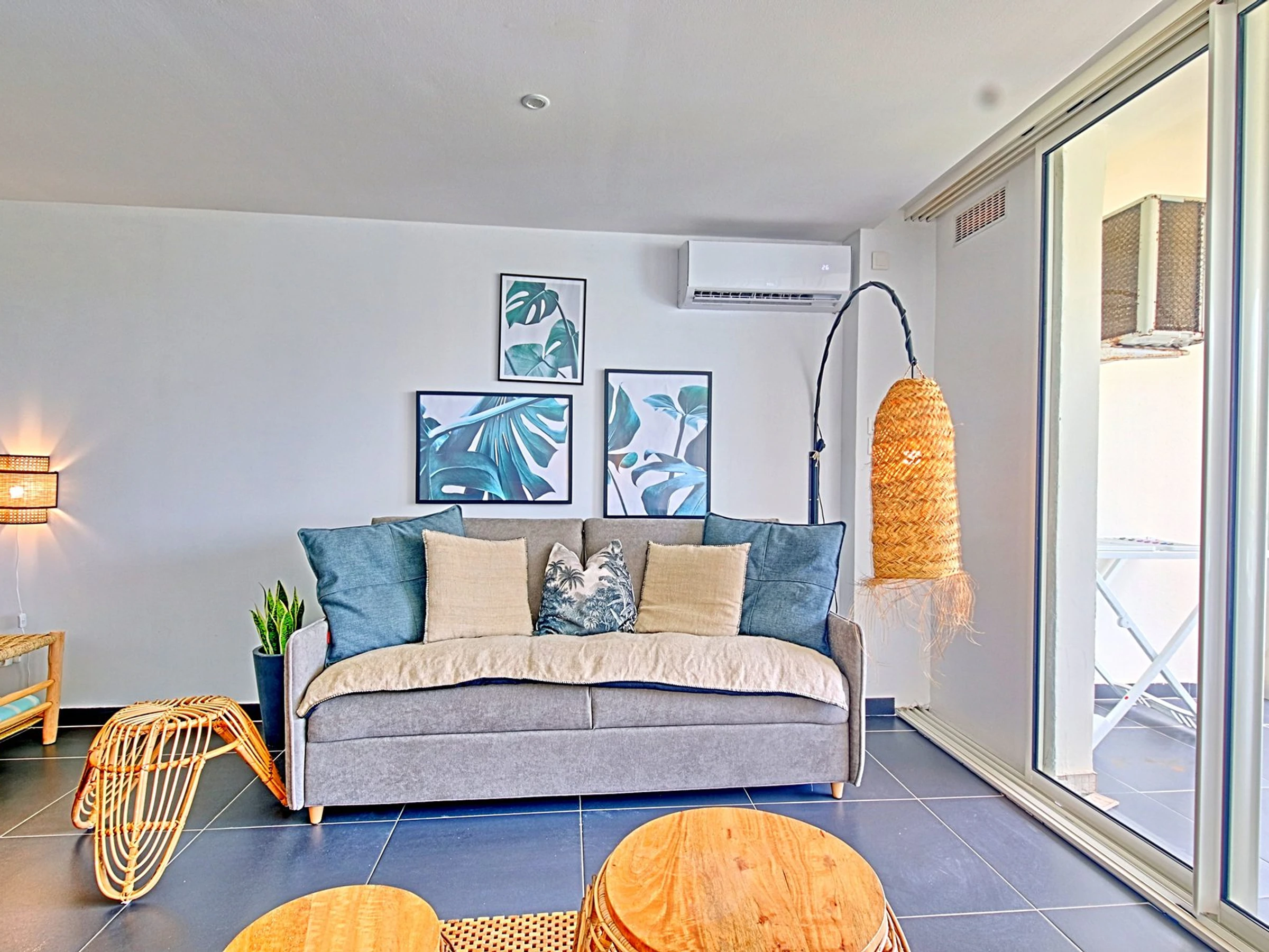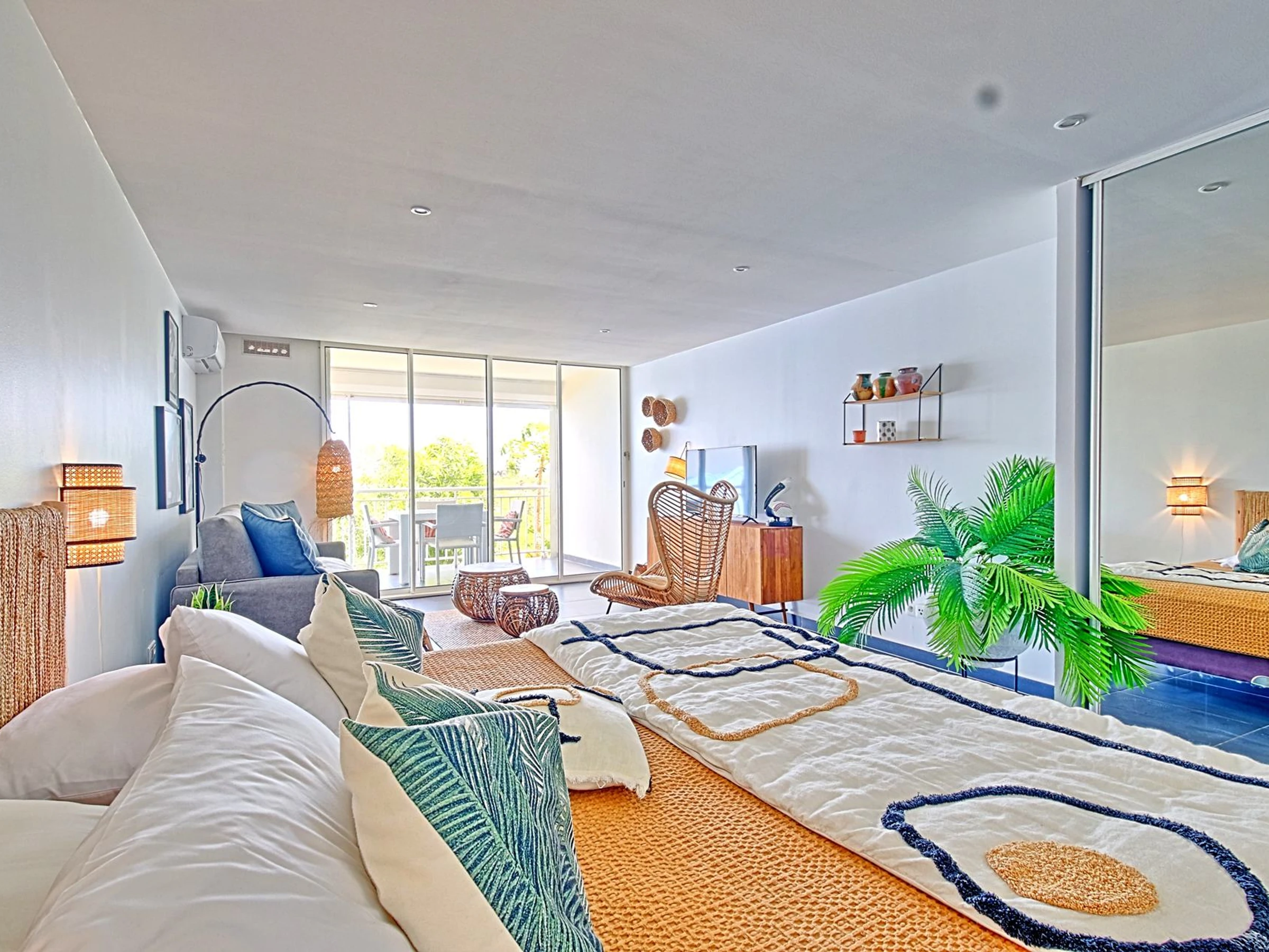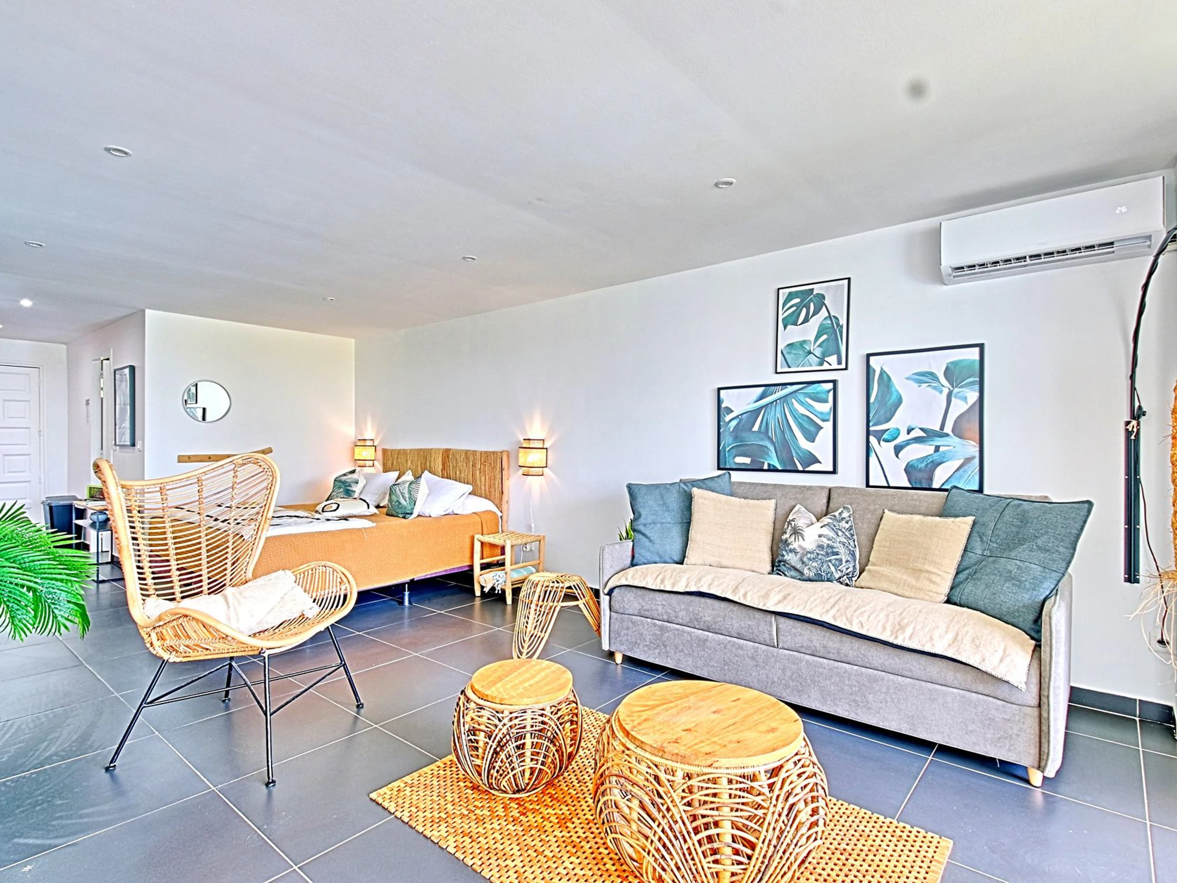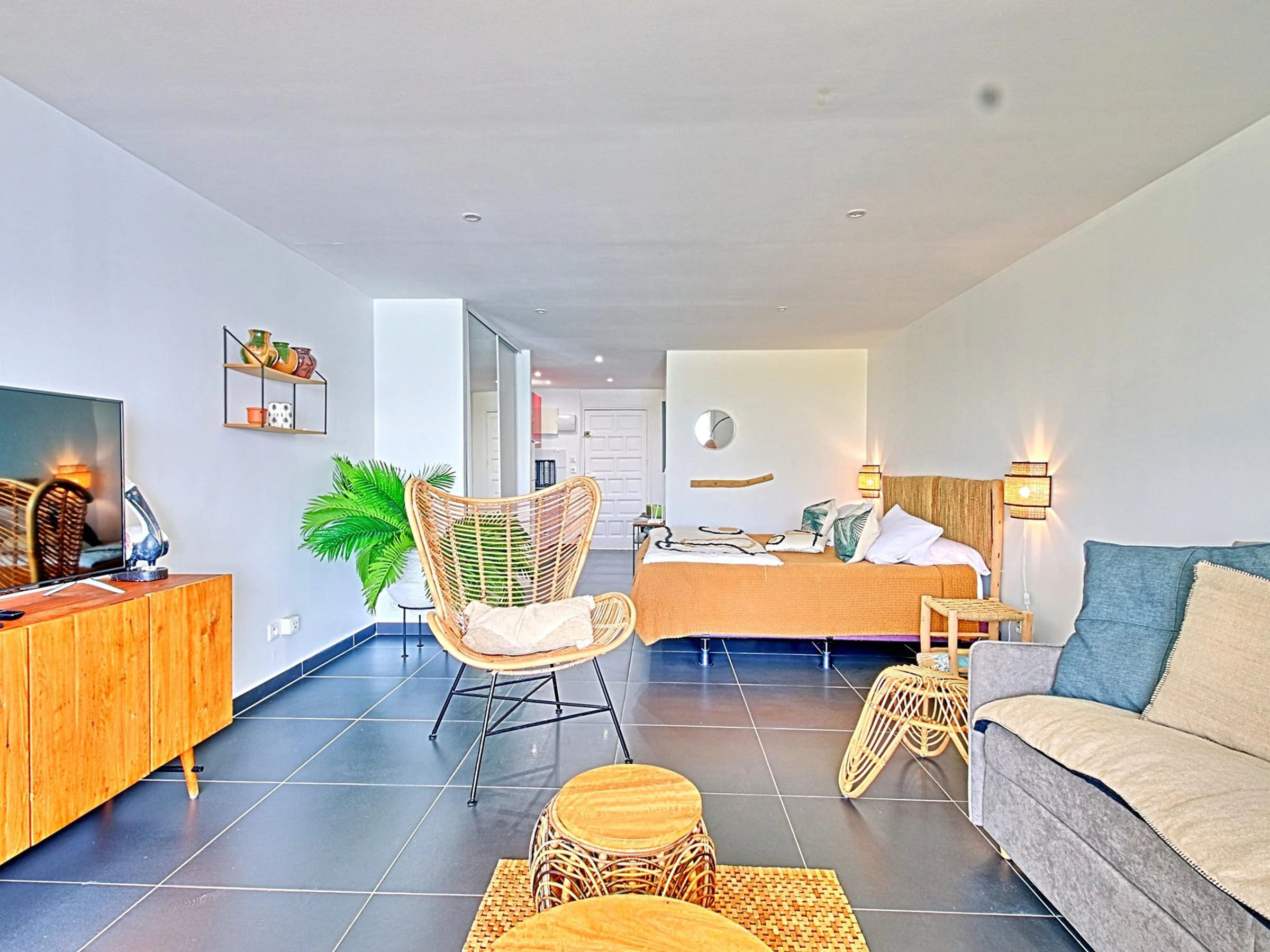 Le studio comprend une cuisine entièrement équipée et aménagée, une salle de bain avec une grande douche, des toilettes et une machine à laver. La belle pièce de vie comprend un espace nuit avec un lit king size (200x200) et un dressing, ainsi qu'un salon séjour. Vous pourrez également profiter d'une grande terrasse où vous pourrez vous détendre et admirer la vue.
