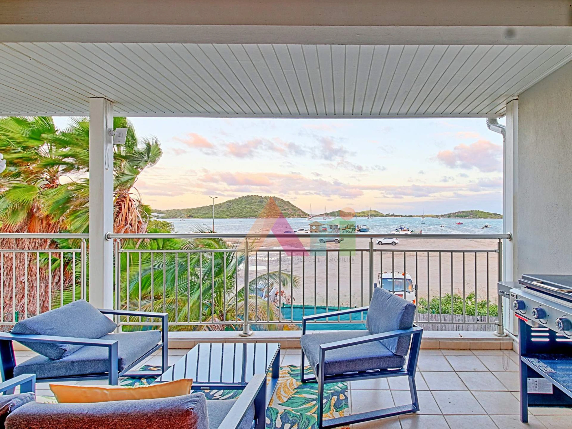 Une grande terrasse avec vue dégagée sur la mer et l’îlet Pinel, équipée d’un salon extérieur et d’une plancha