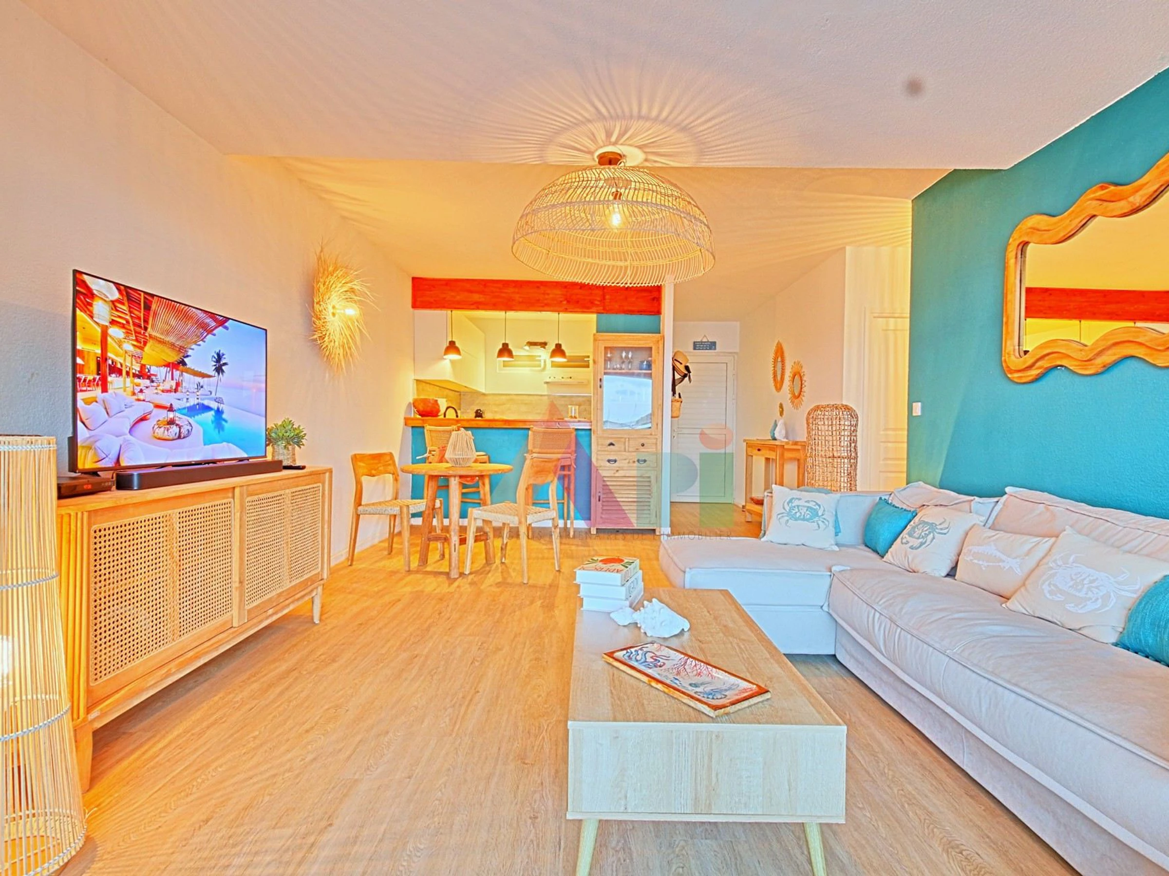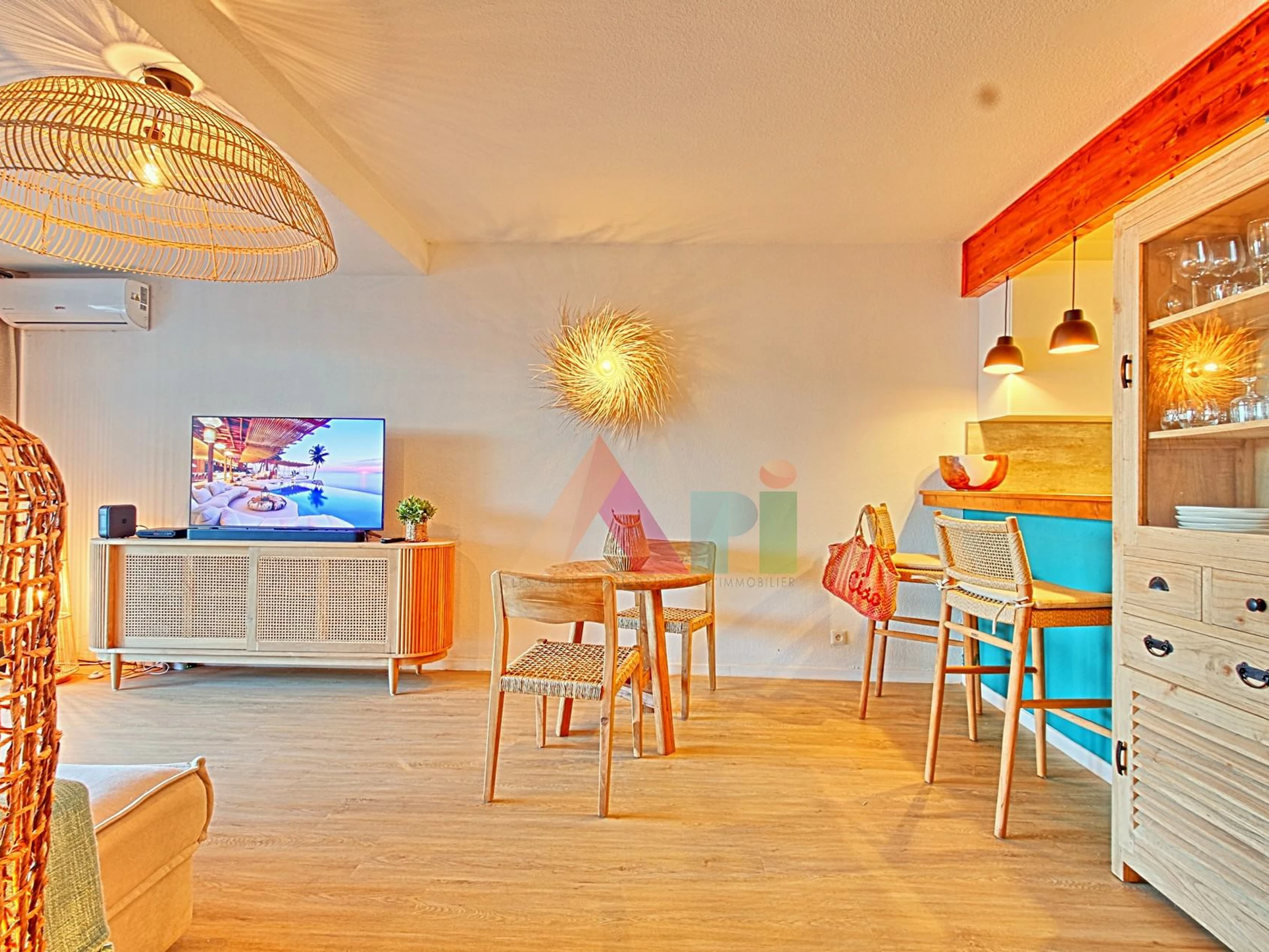 Un espace de vie convivial comprenant salon, coin repas et mini-bar
