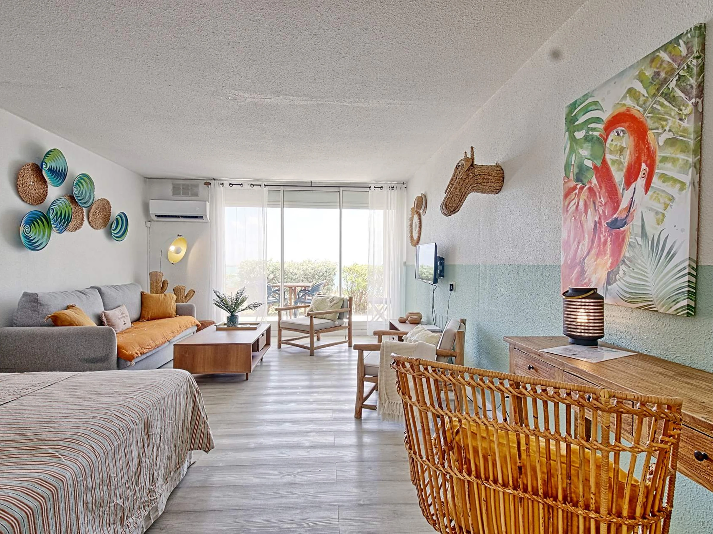 Le coin nuit est équipé d'un lit king size (200x200) confortable et d'un dressing. Le salon dispose d'un véritable canapé lit et offre une vue agréable sur la mer et vous pourrez profiter de l'immense piscine commune de la résidence (ouverte toute l'année de 8h à 18h).